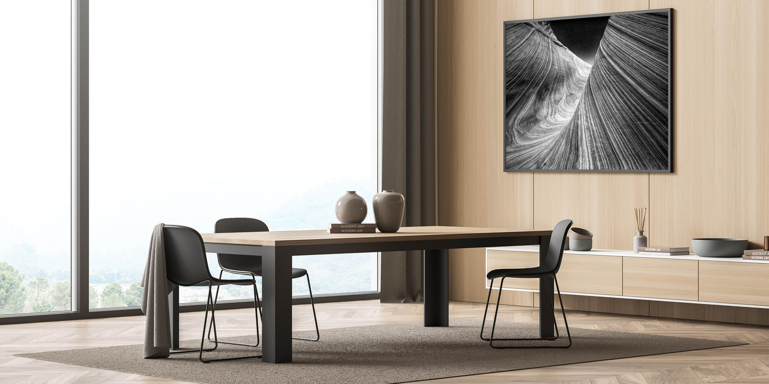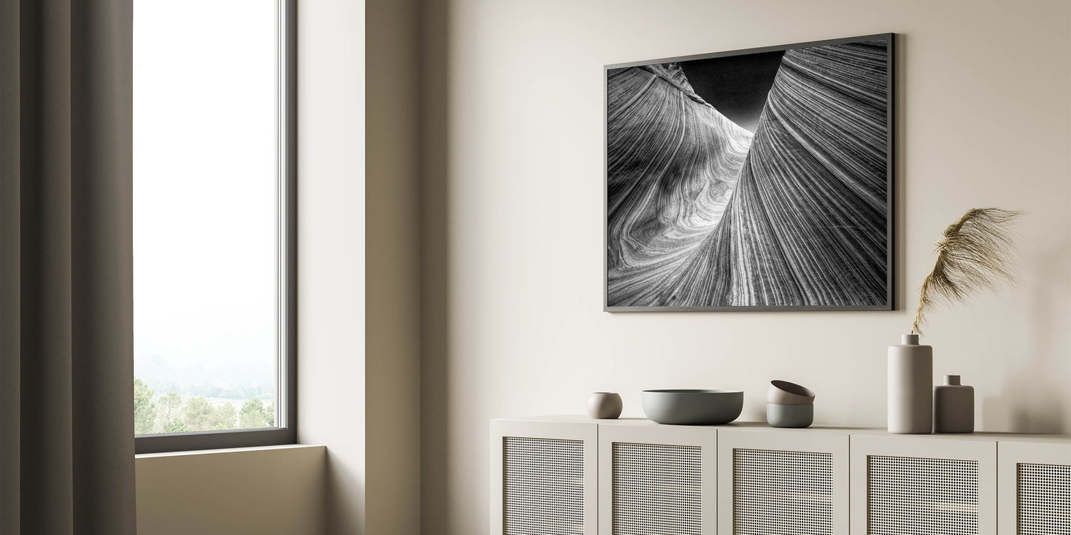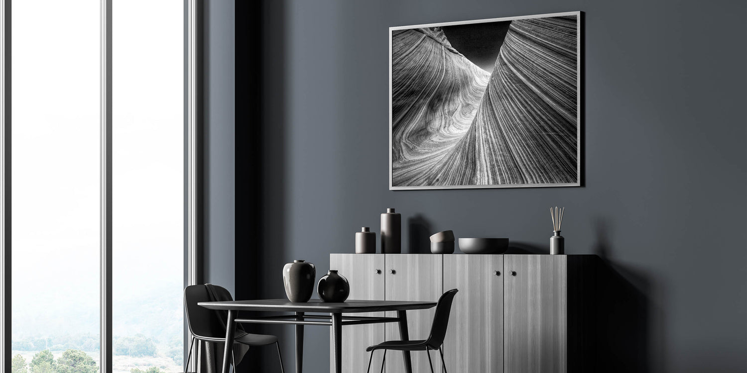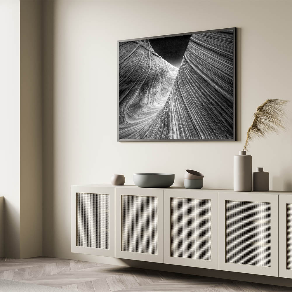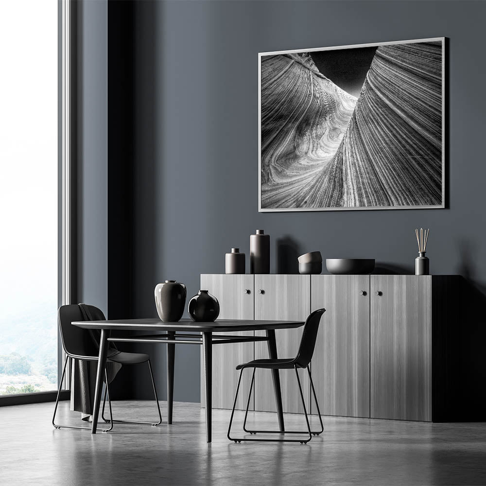 Discover the striking beauty of Coyote Buttes in this elegant black and white art print. The intricate textures of the Arizona desert rock formations come alive in monochrome, offering a timeless and modern take on the natural landscape. This desert wilderness art brings the unique curves and layers of the Southwest's red rock formations into a sophisticated black and white setting, perfect for adding a touch of elegance to any space.