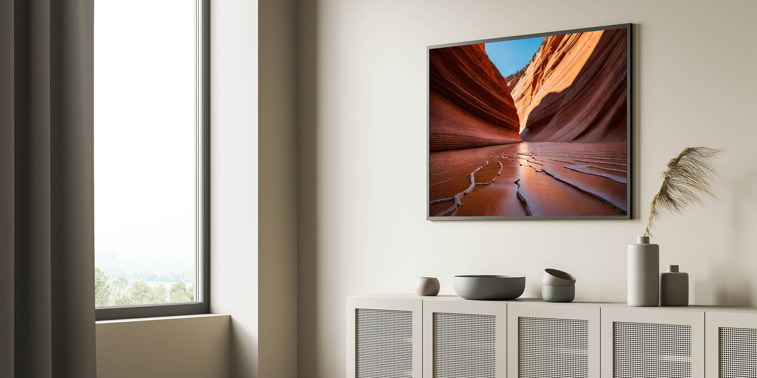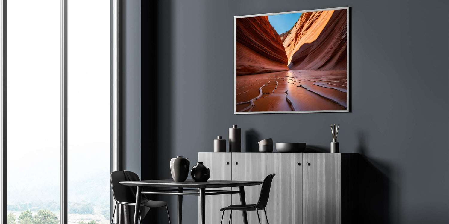 This piece of Coyote Buttes art is ideal for those who appreciate the quiet majesty of the Arizona wilderness. The soft reflections and dynamic curves of the canyon are expertly captured, making it a stunning focal point in any room. Elevate your decor with this gallery-quality print that transports you to the peaceful expanse of the Southwest desert.