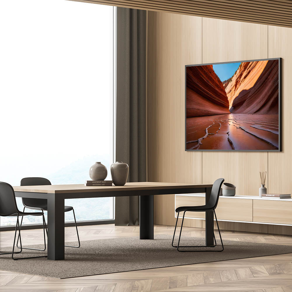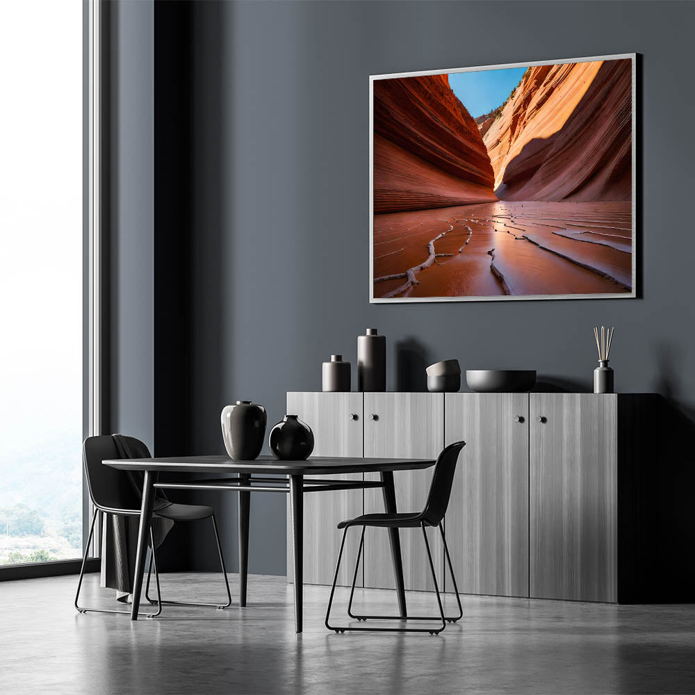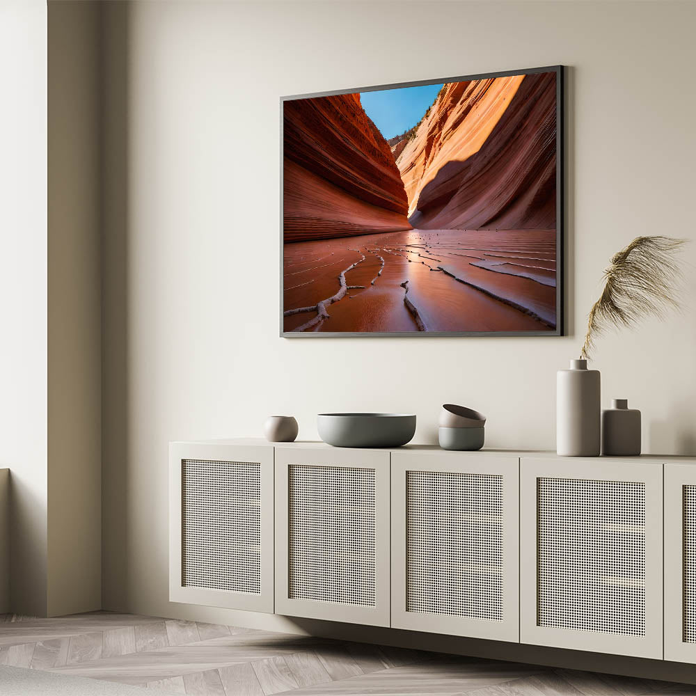 Bring the serene beauty of Coyote Buttes into your home with this captivating Arizona desert wall art. This artwork captures the tranquil atmosphere of a canyon floor, where a meandering stream cuts through the vibrant red rock formations. The warm desert tones and natural curves of the canyon create a stunning contrast with the soft water reflections, making this piece a true reflection of Southwest landscape art.