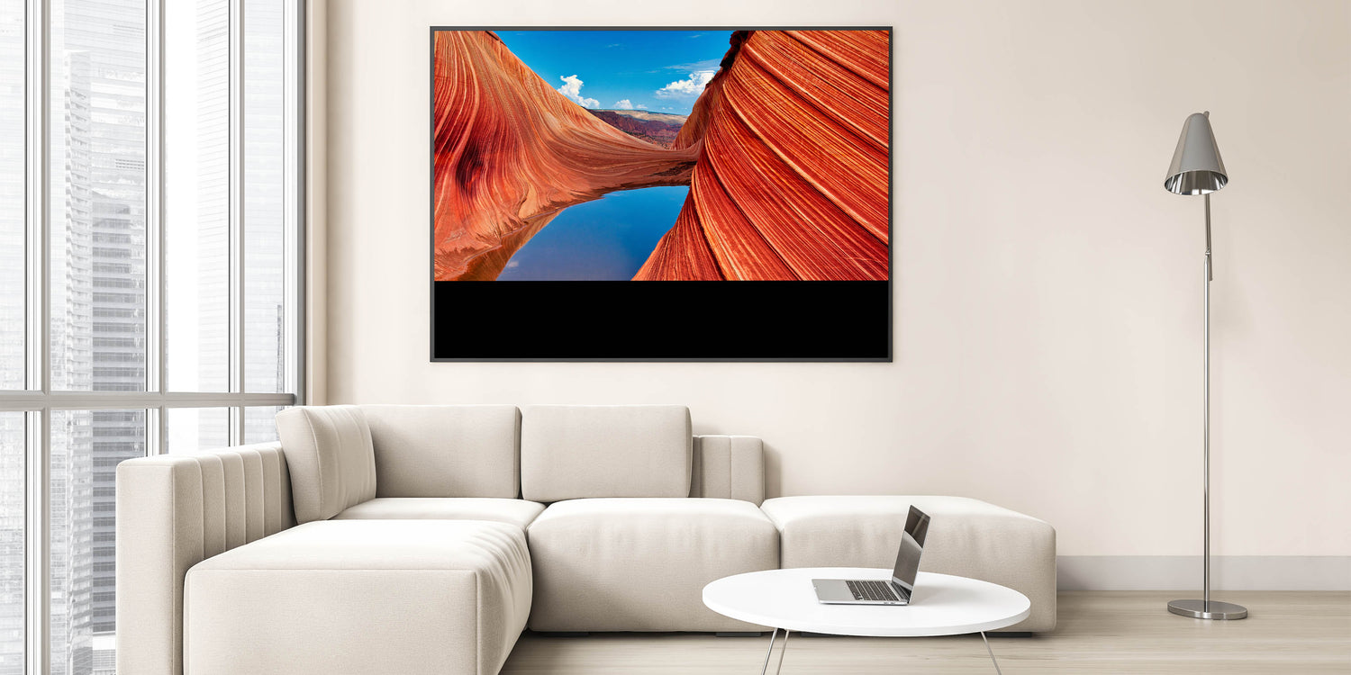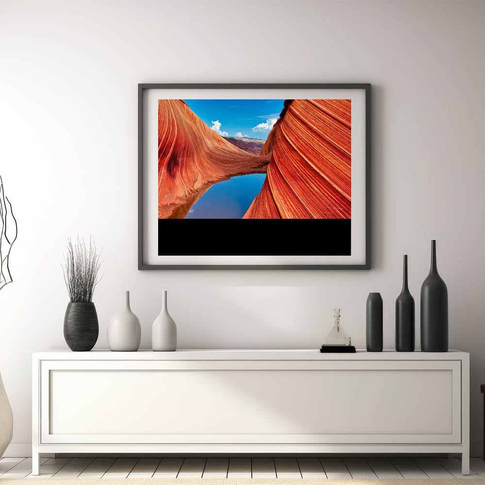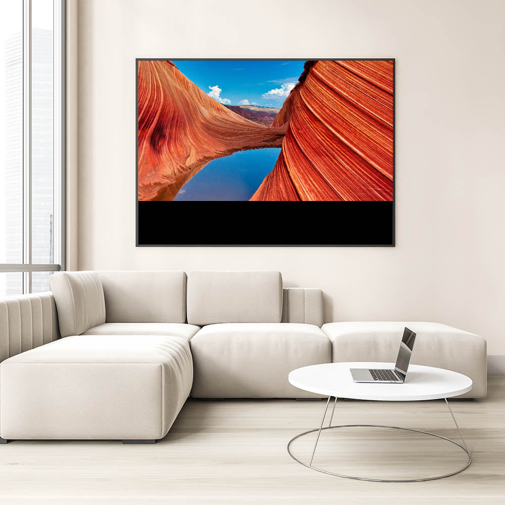 This stunning Coyote Buttes wall art captures the vibrant red rock formations of the Arizona desert mirrored in a tranquil pool. The intricate lines of the rock waves and the vivid contrast of colors between the canyon and the sky create a dramatic yet peaceful landscape. This nature-inspired canvas print brings the beauty of the Southwest right into your home.