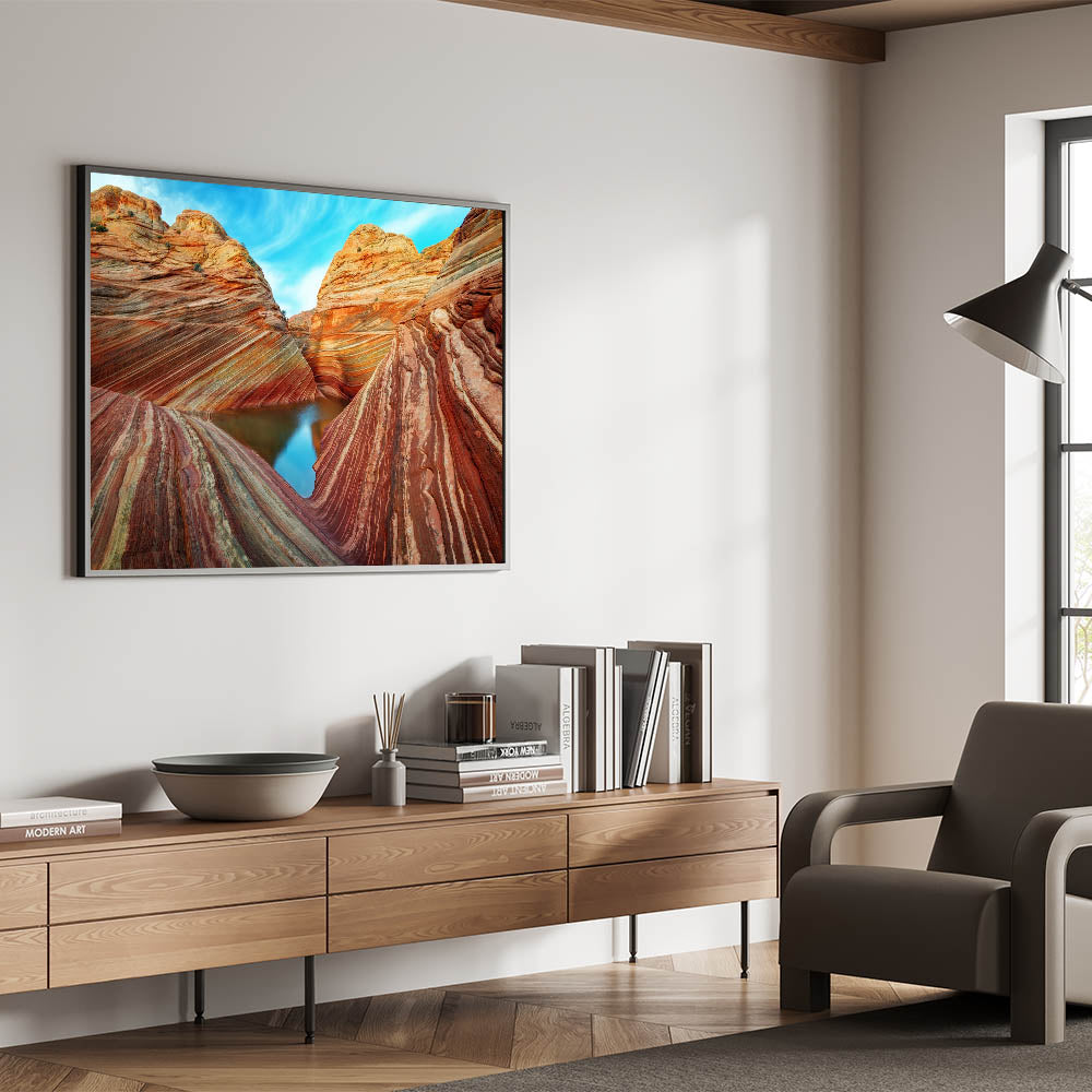 Add the beauty of the Coyote Buttes to your home with this vibrant Arizona desert red rock landscape print. Featuring breathtaking layers of colorful rock formations reflected in a tranquil pool, this piece captures the dramatic and stunning beauty of the Southwest landscape. The bright hues and swirling patterns of the rocks make this print a perfect addition to any space, from living rooms to offices.
