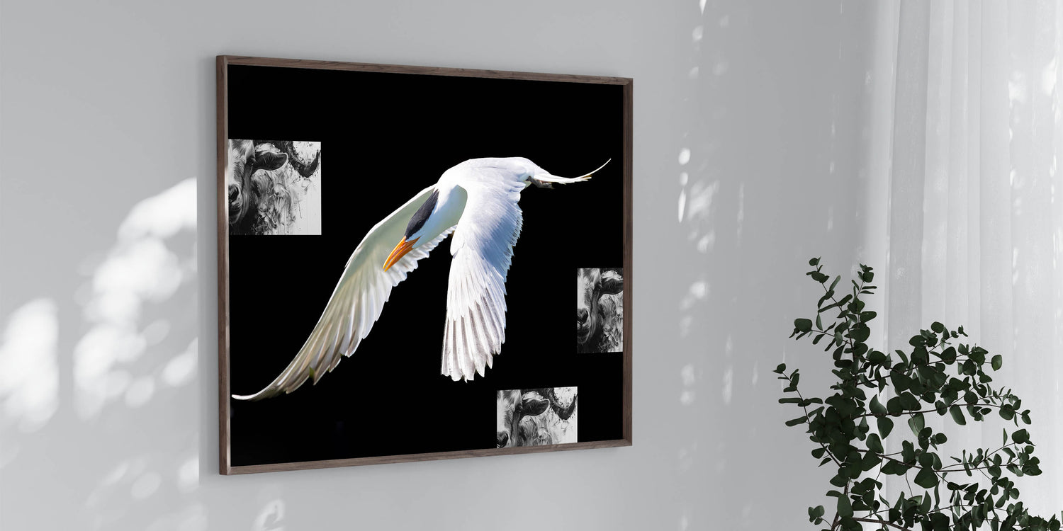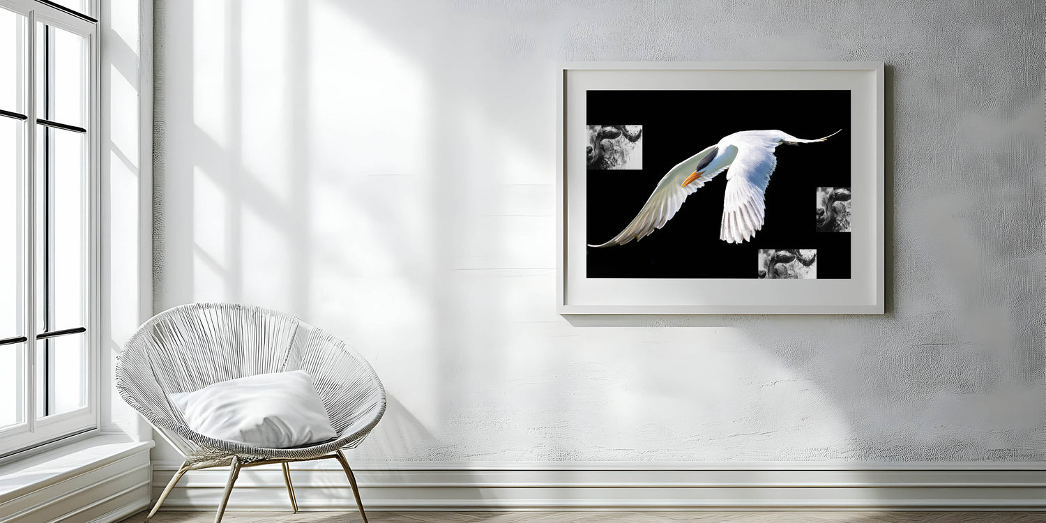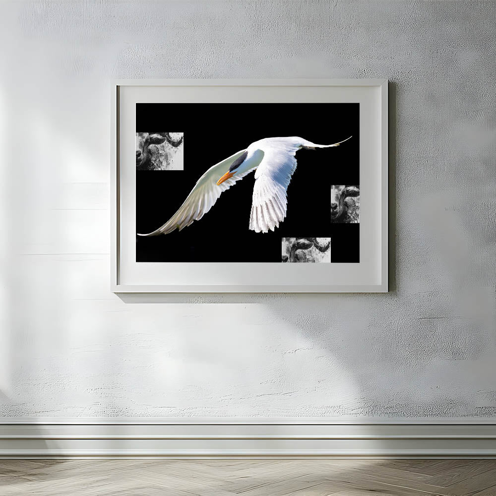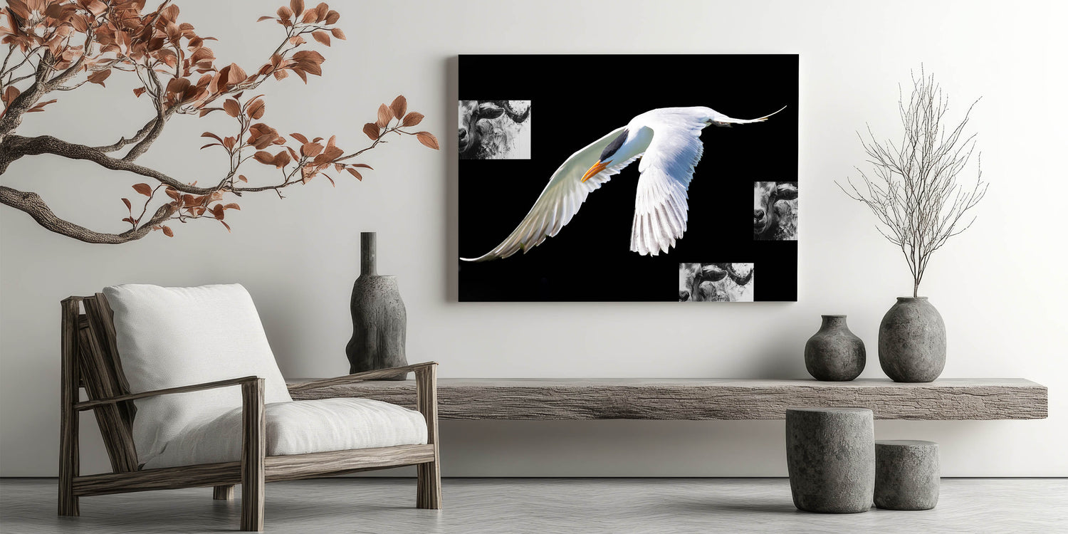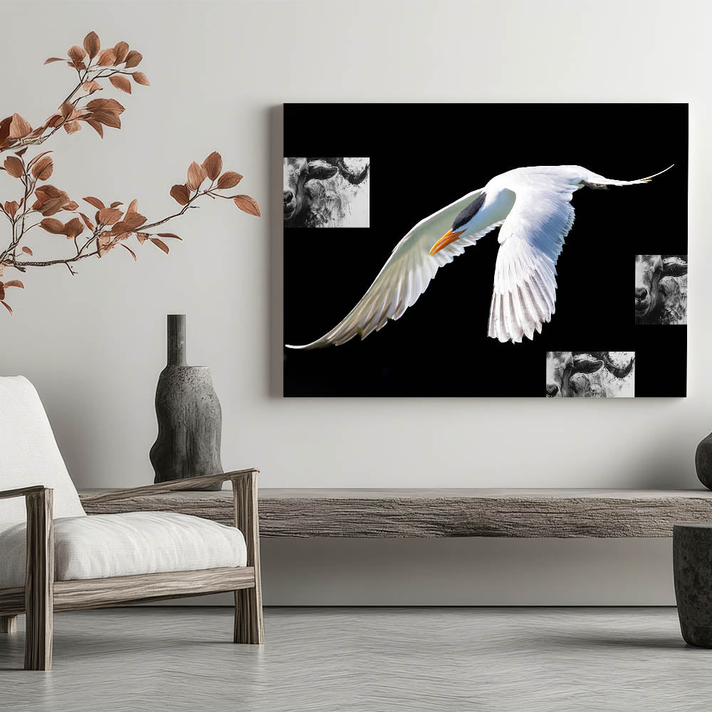 Make a bold statement in your home with this striking wall art featuring an elegant white crane in flight against a deep black background. The stark contrast between the crane’s pristine feathers and the dark backdrop creates a visually powerful piece that is both sophisticated and modern. This artwork is perfect for those who appreciate minimalist design and the beauty of nature.