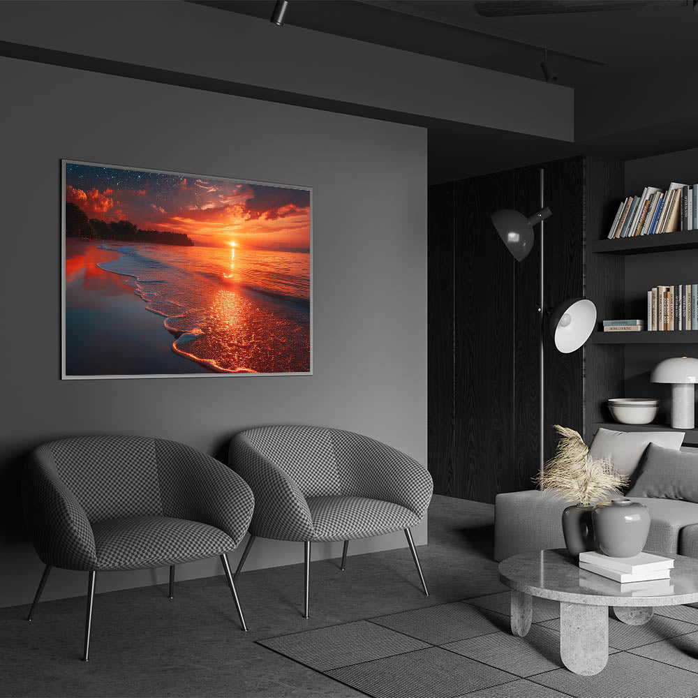 Bring the captivating beauty of Crete's coastline at sunset into your space with this mesmerizing wall art. The fiery glow of the setting sun contrasts against the darkening sky, reflecting off the calm waters and sandy shore to create a stunning visual that draws in the viewer.
