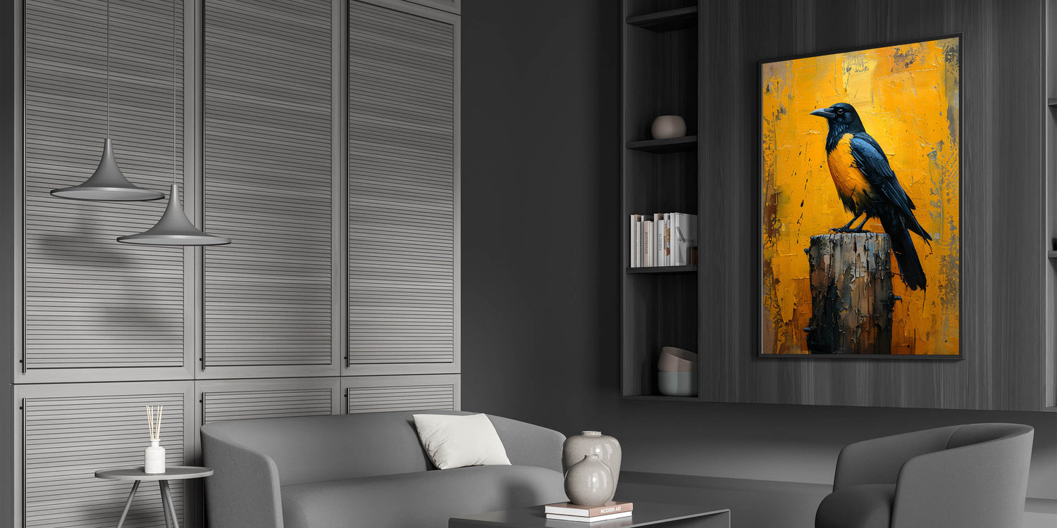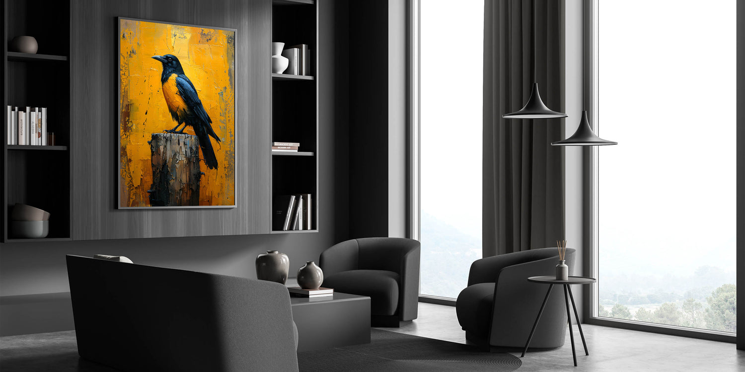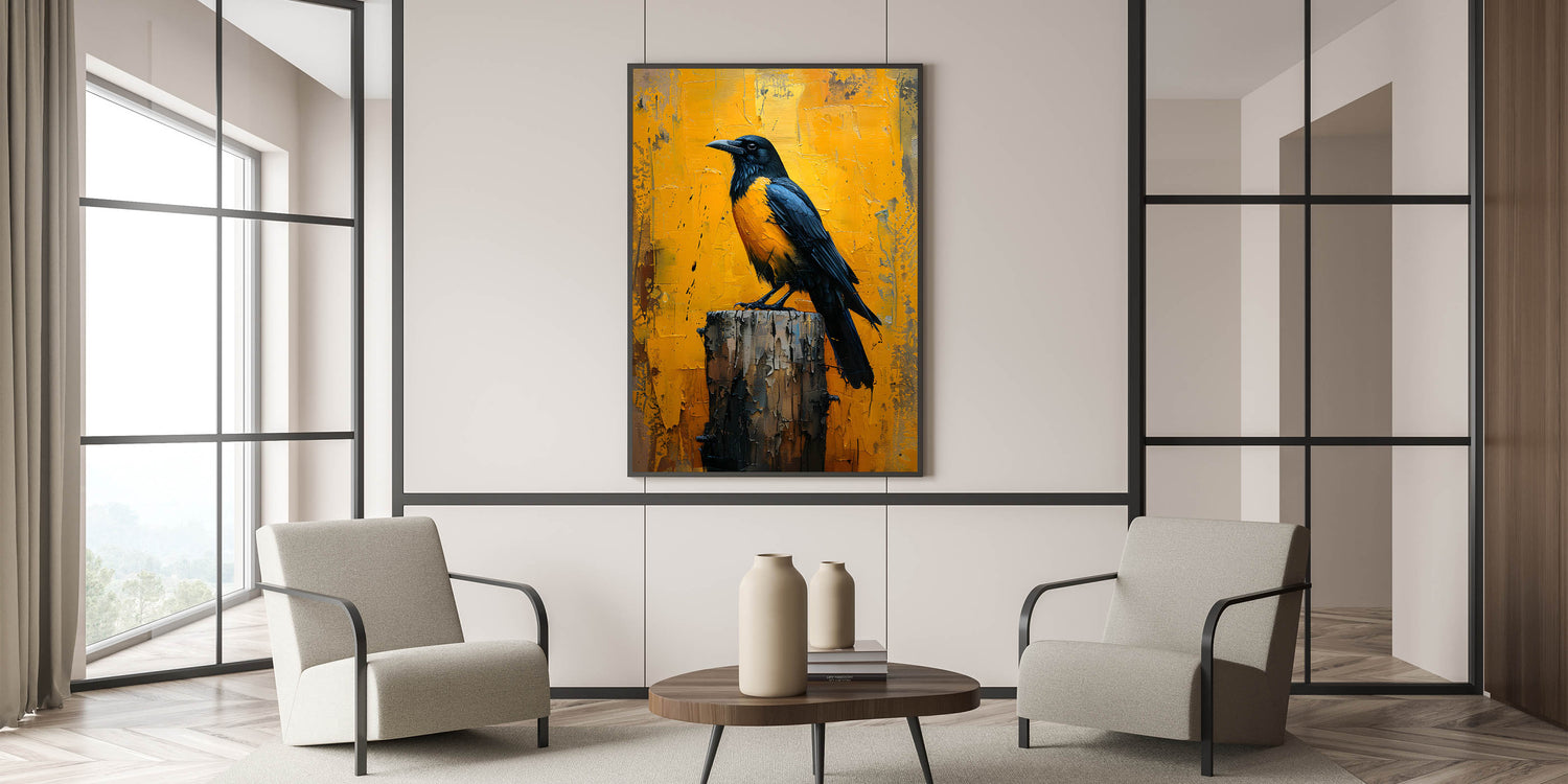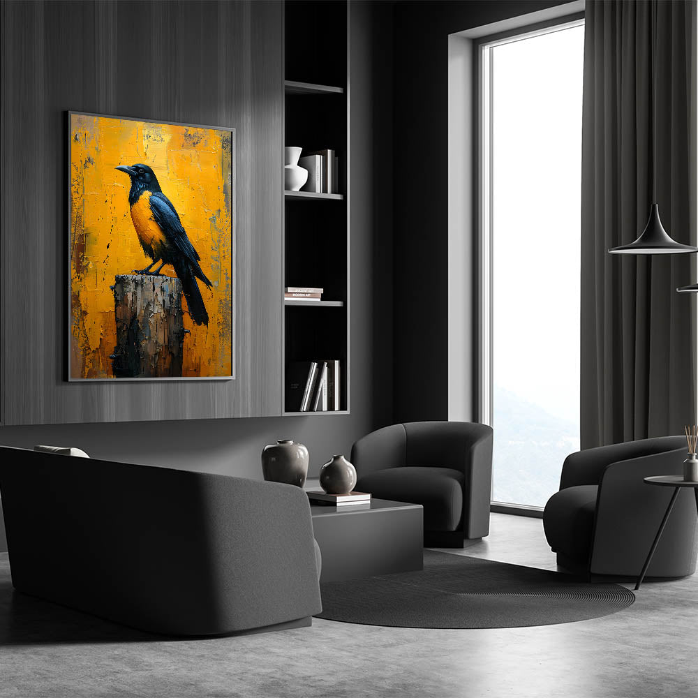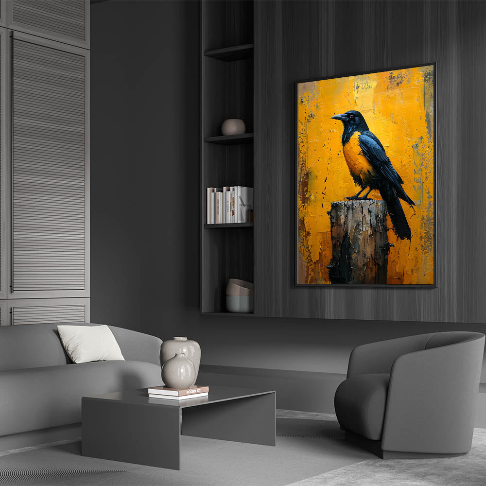 Bring bold color and texture to your space with this vibrant raven art. The striking contrast between the raven's dark feathers and the rich, textured yellow background creates a powerful visual impact. This artwork is perfect for those who want to make a statement with their decor, combining the elegance of the raven with the energy of bright, warm tones.