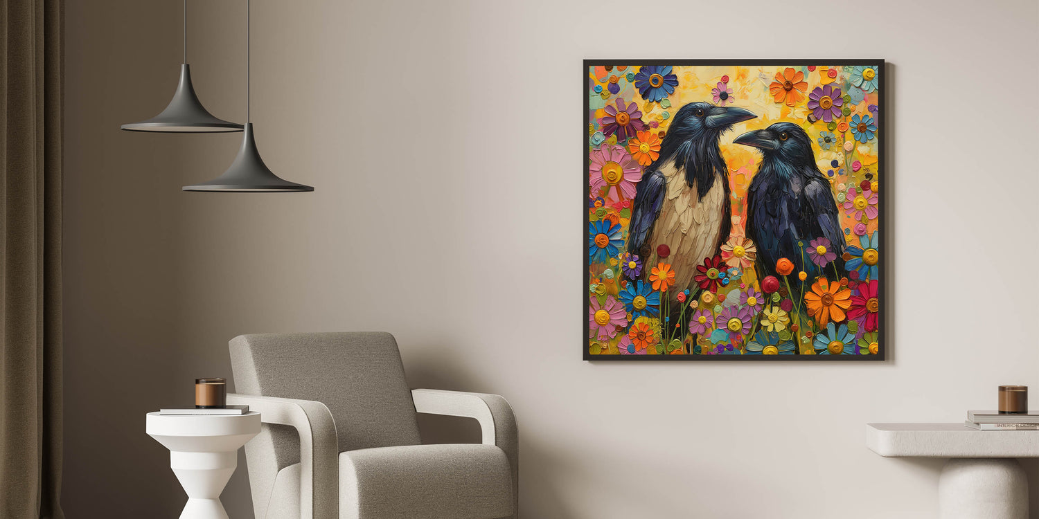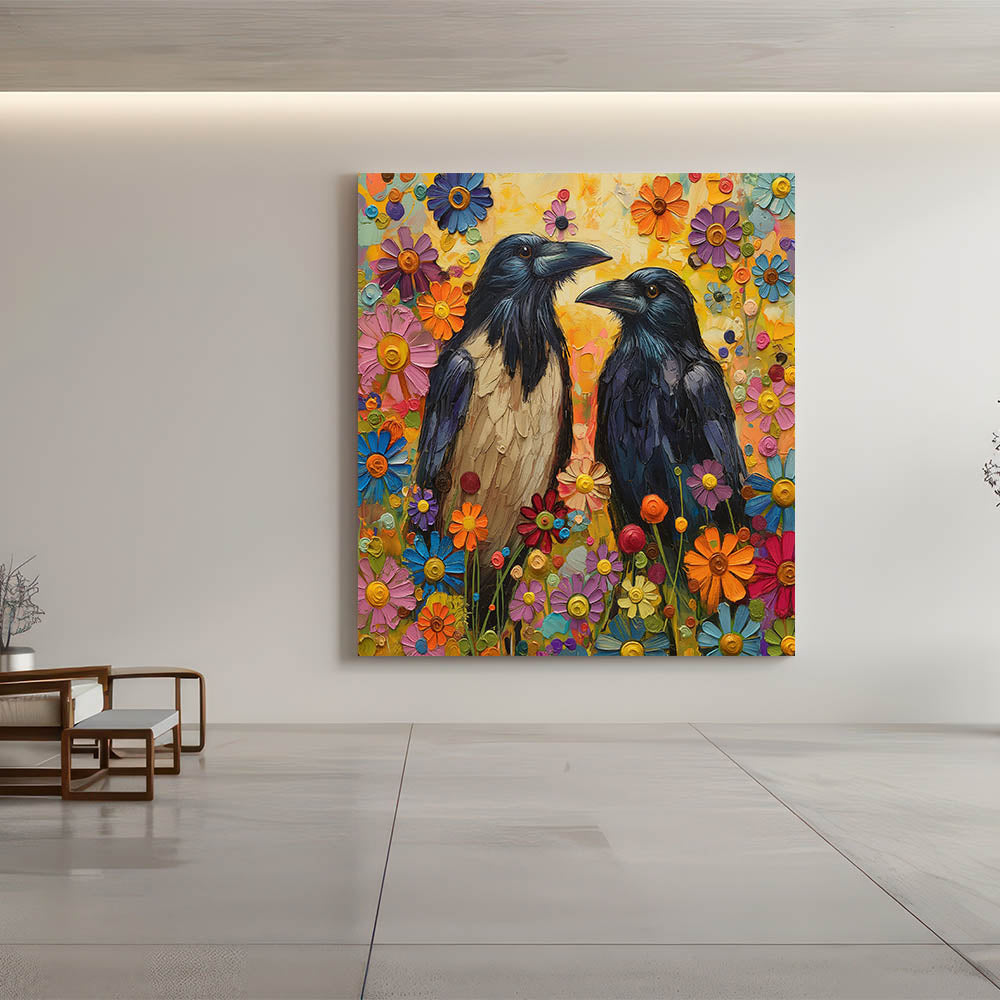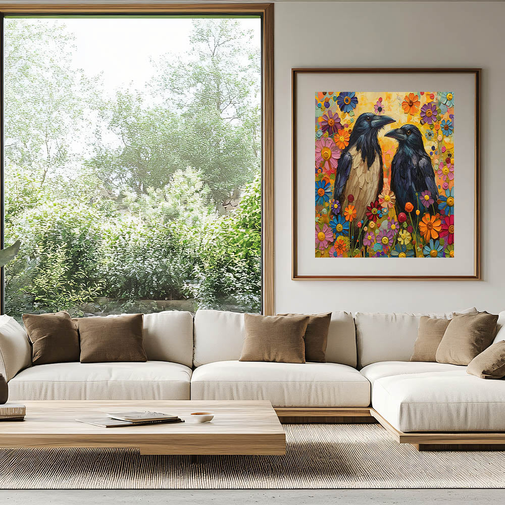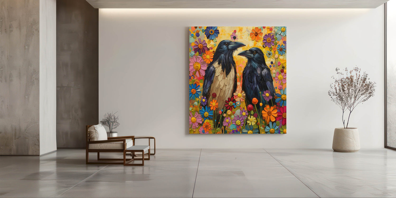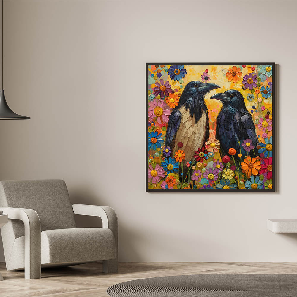 Brighten your space with this whimsical floral raven art, featuring two playful crows surrounded by a colorful array of blooming flowers. The vibrant colors and textured brushstrokes bring this scene to life, making it a joyful and eye-catching addition to any room. Perfect for those who love nature-inspired art with a touch of whimsy, this piece is sure to add warmth and cheer to your home.