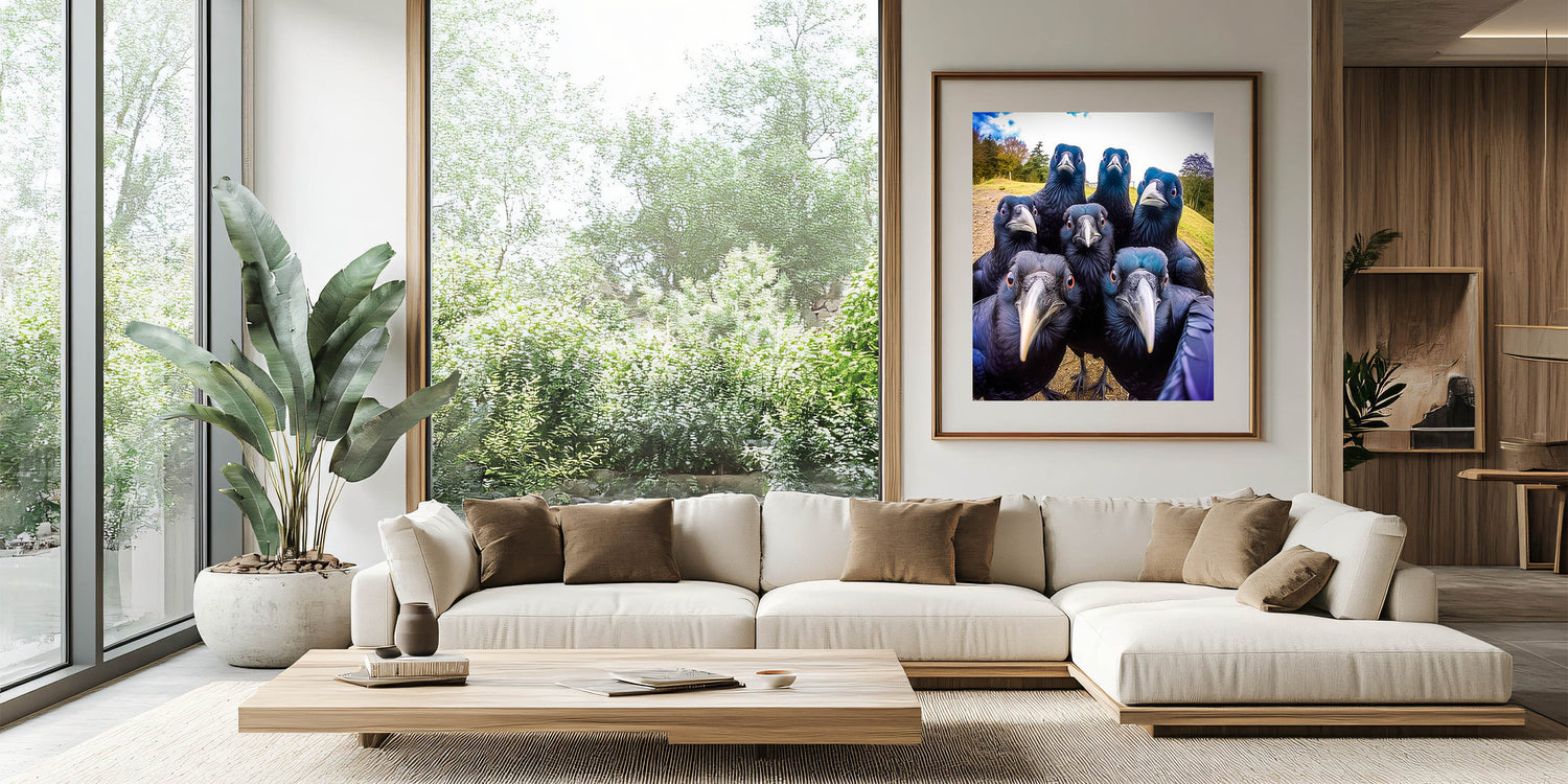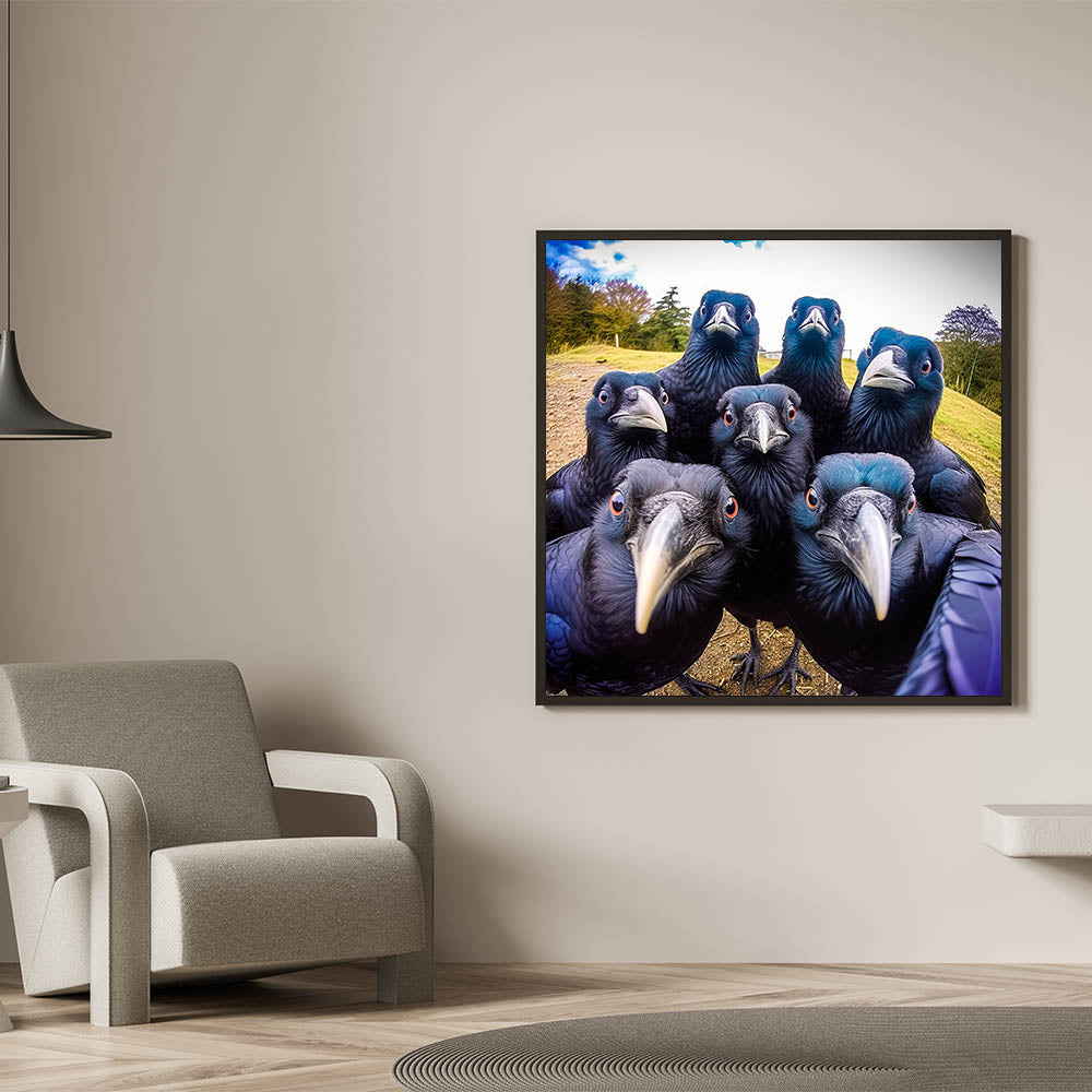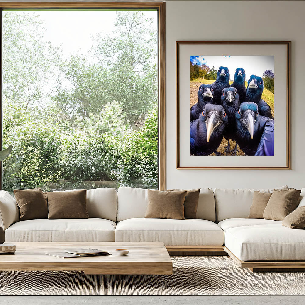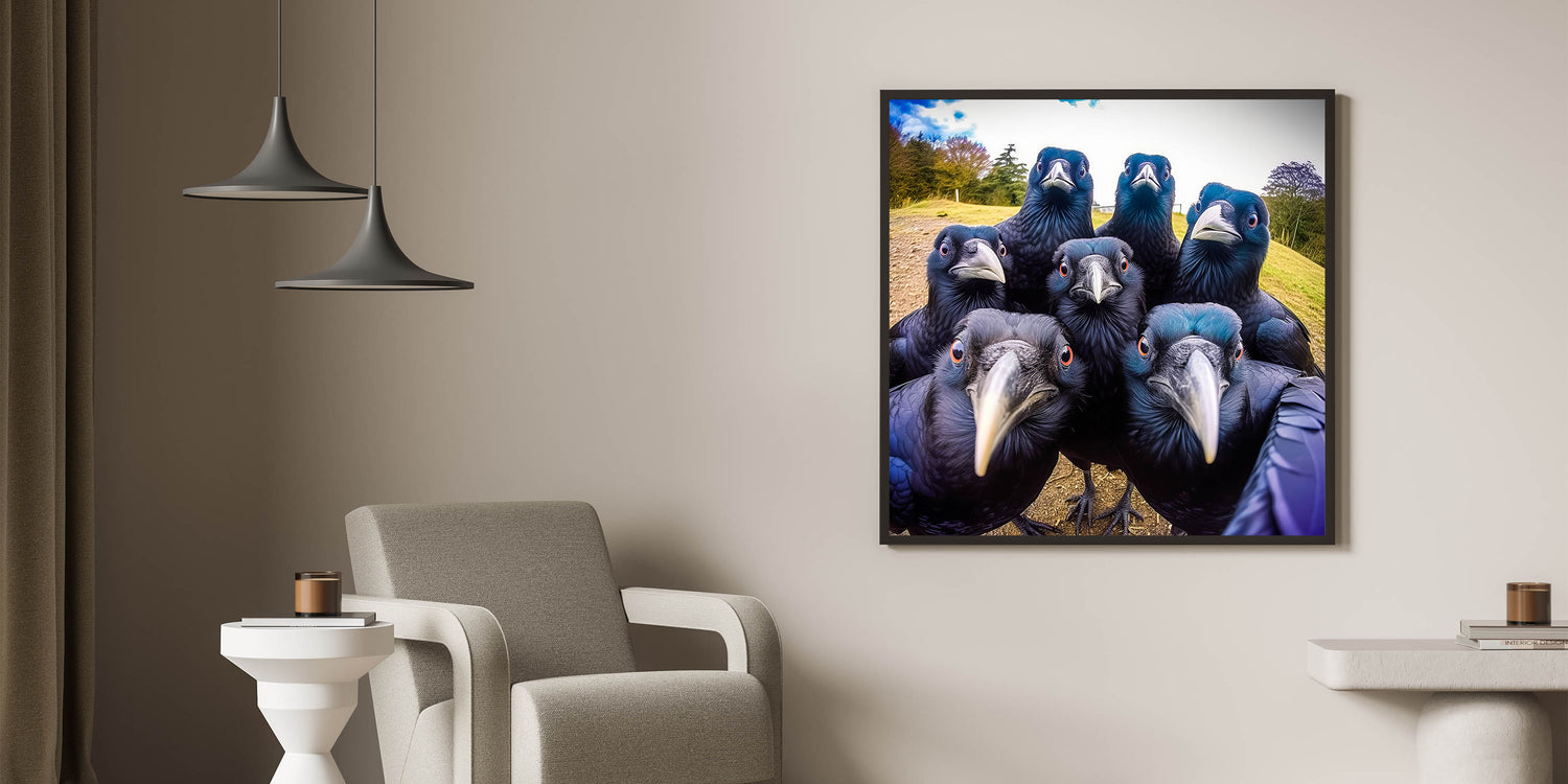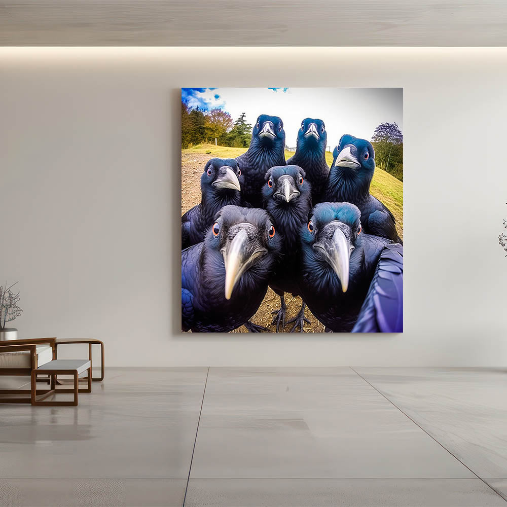 Add a playful yet striking element to your space with this vibrant crow photography. Featuring a group of inquisitive ravens captured in a moment of curiosity, this artwork brings both nature and a sense of whimsy into your home. The bold colors and sharp details make this piece a perfect conversation starter for any room.