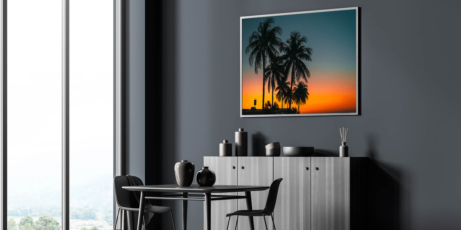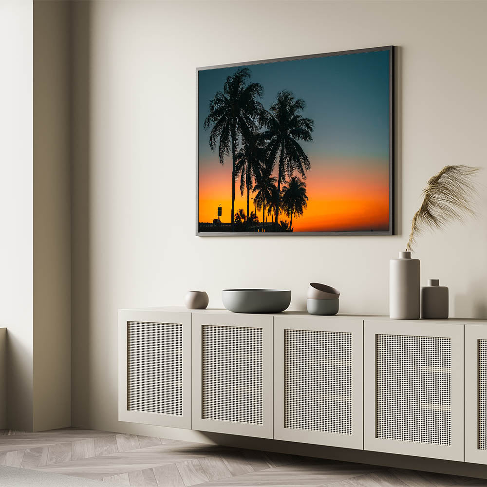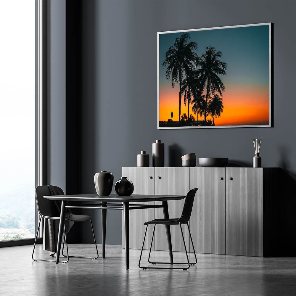 Experience the tropical beauty of Cuba with this stunning sunset wall art, showcasing palm trees silhouetted against a vibrant orange and blue sky. The rich colors of the sunset create a peaceful yet captivating atmosphere, perfect for anyone looking to bring the warmth of the Caribbean into their home. This artwork captures the tranquil essence of a tropical evening, ideal for transforming any room into a paradise-like setting.