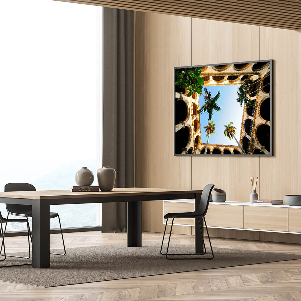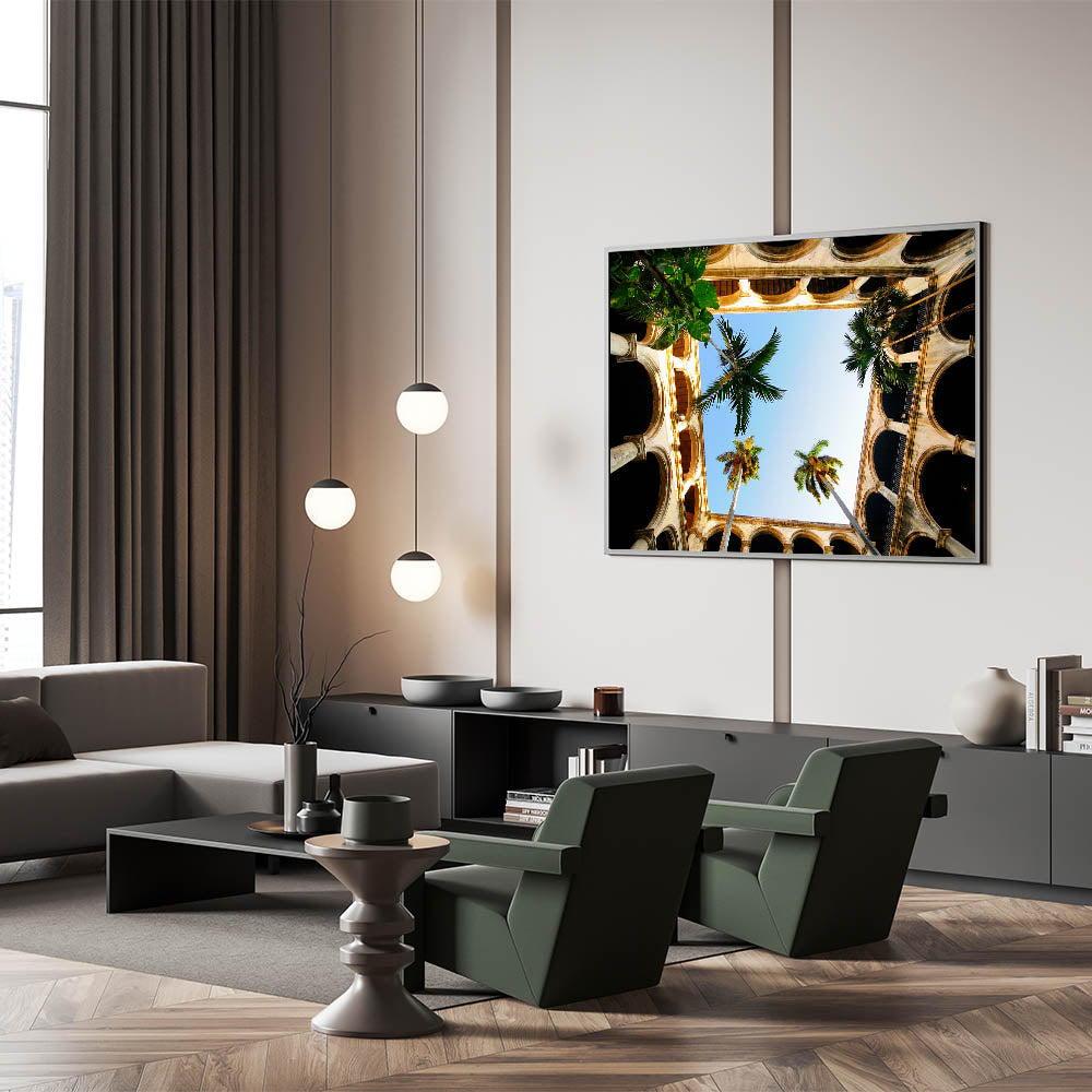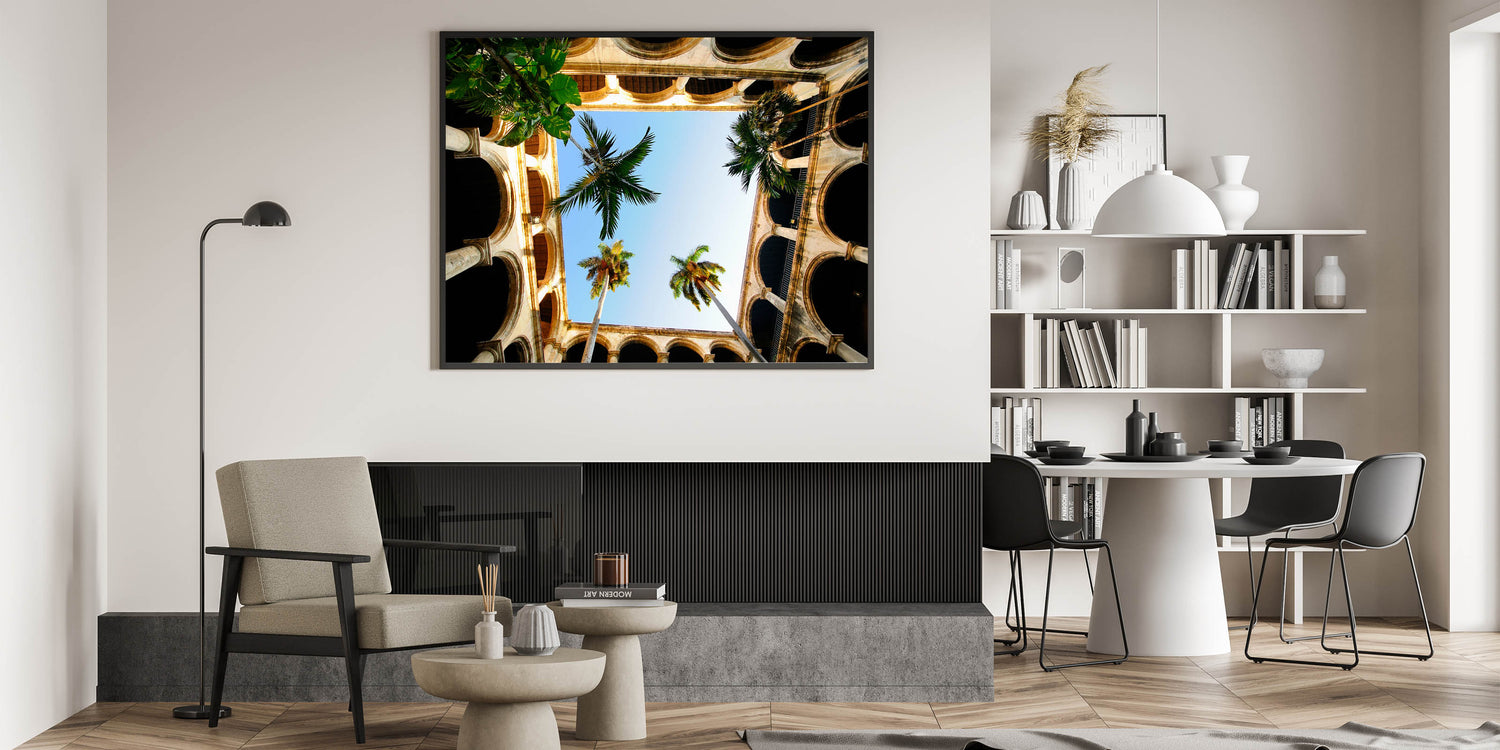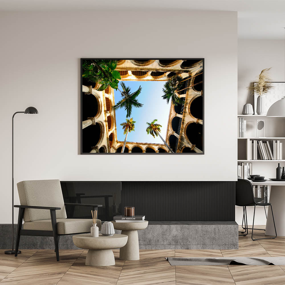 This vibrant Cuba Wall Art piece beautifully captures the essence of a historic Havana courtyard. The soaring palm trees and intricate arches reflect the rich cultural heritage of Cuba, making this artwork perfect for those who want to bring a touch of Caribbean Art into their home. With a combination of rustic architecture and bright tropical greenery, this design evokes the lively spirit of Cuban culture and history.