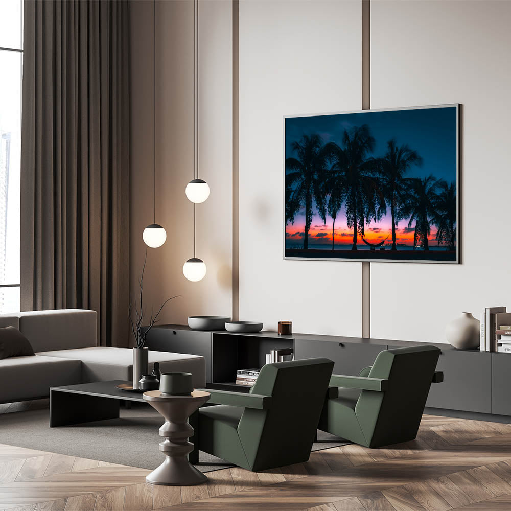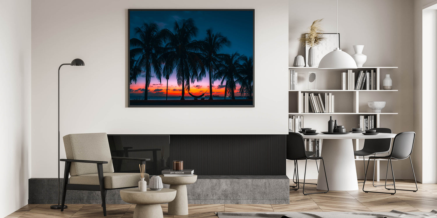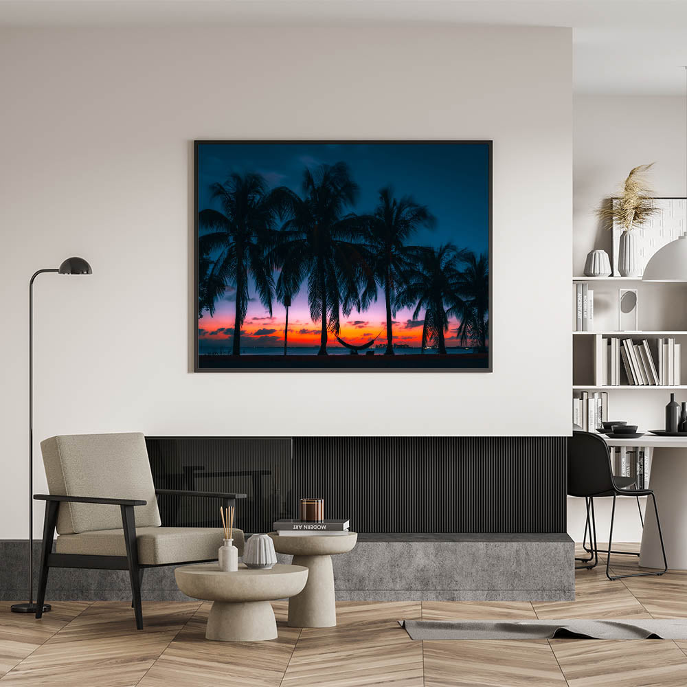 This artwork is perfect for those who want to transform their space into a tropical paradise. Whether it's for a living room, bedroom, or office, this sunset print will evoke the peaceful and relaxing atmosphere of a Caribbean evening.