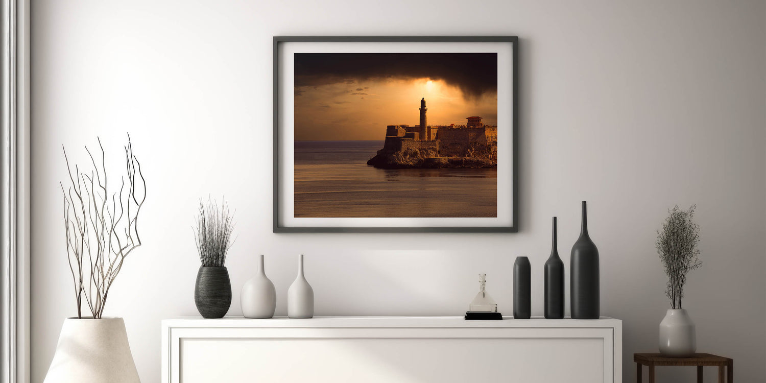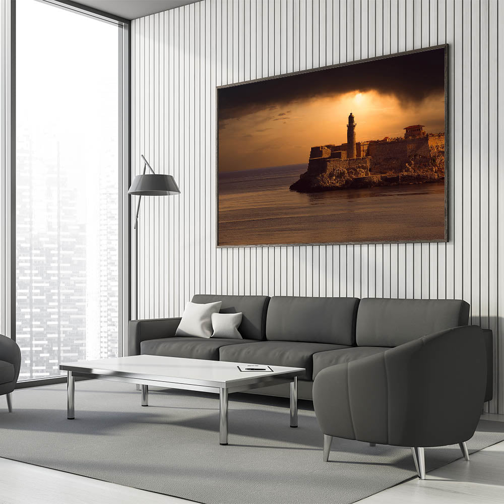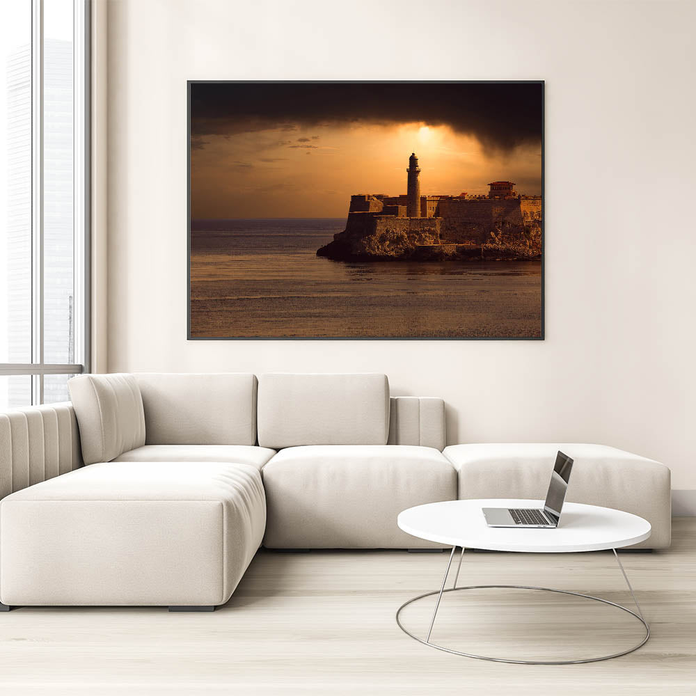 Capture the powerful beauty of Havana’s coastline with this breathtaking wall art featuring a lighthouse bathed in golden sunset light. The dramatic clouds overhead and the warm tones of the sunset create a striking contrast, evoking the timeless allure of Cuba's coastal landmarks. This artwork is perfect for adding a sense of mystery and history to any room.