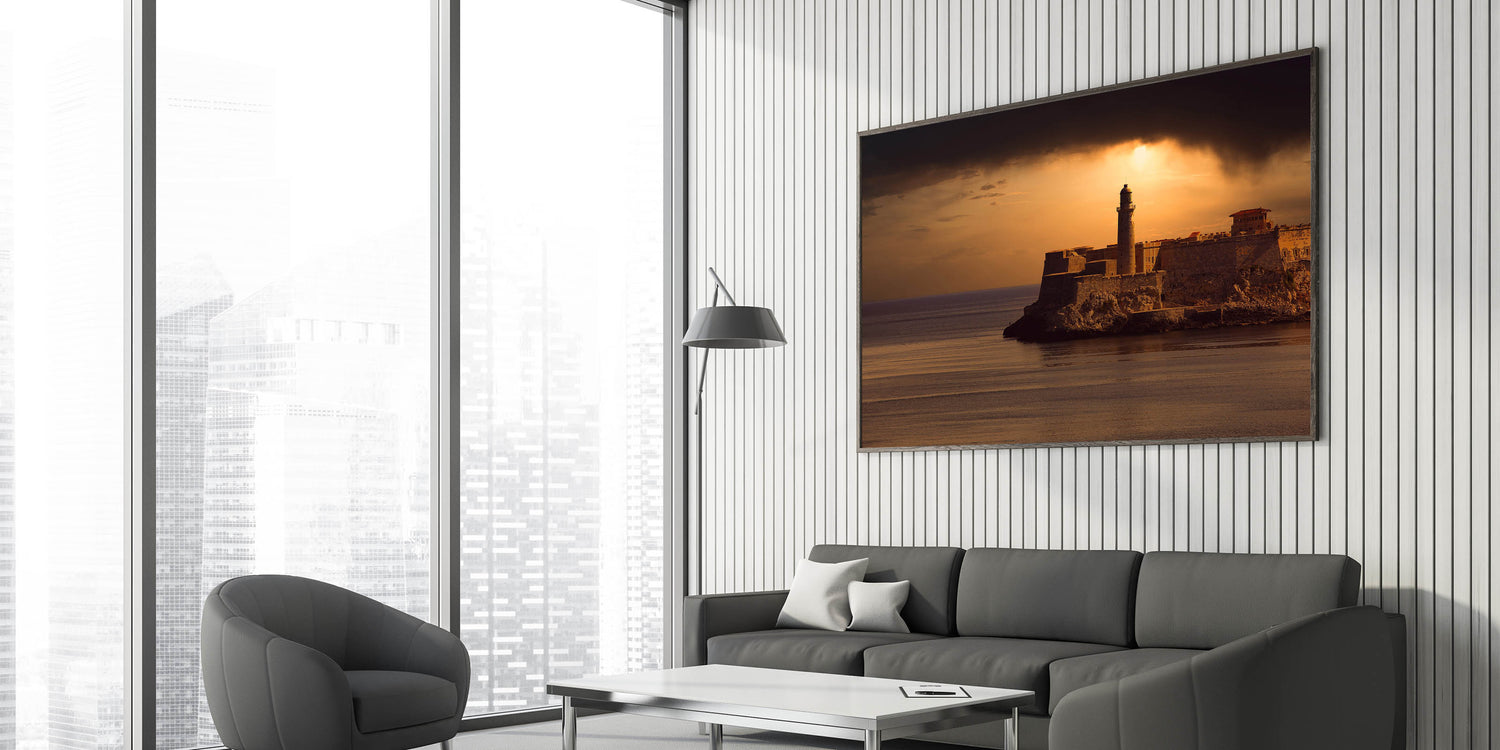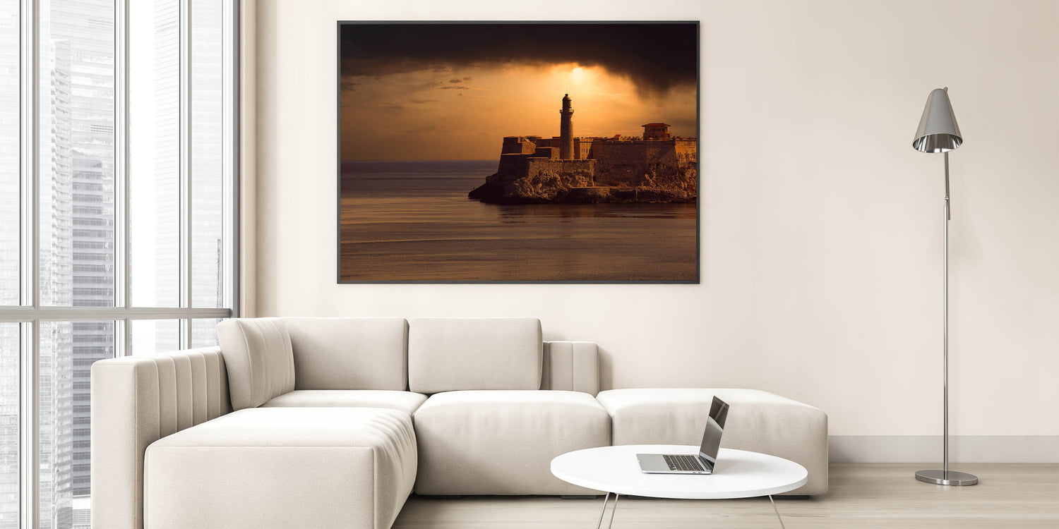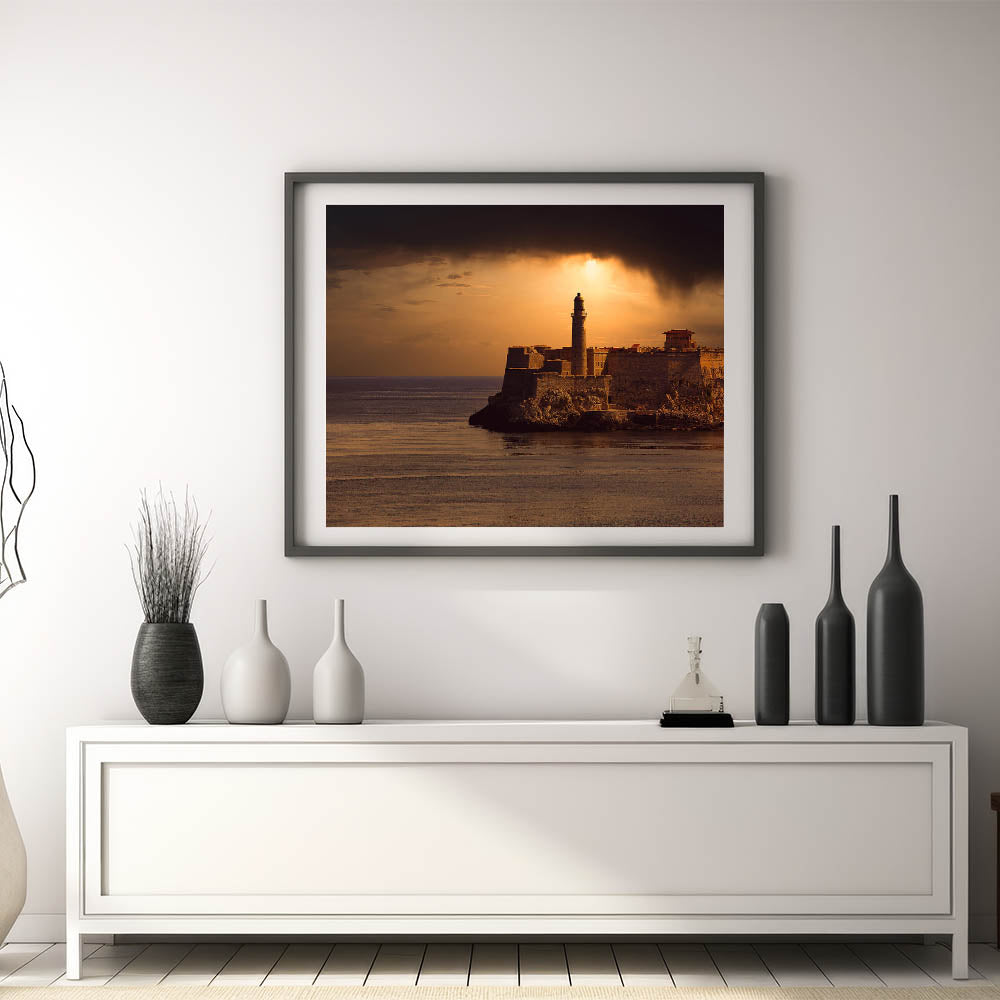 Capture the powerful beauty of Havana’s coastline with this breathtaking wall art featuring a lighthouse bathed in golden sunset light. The dramatic clouds overhead and the warm tones of the sunset create a striking contrast, evoking the timeless allure of Cuba's coastal landmarks. This artwork is perfect for adding a sense of mystery and history to any room.