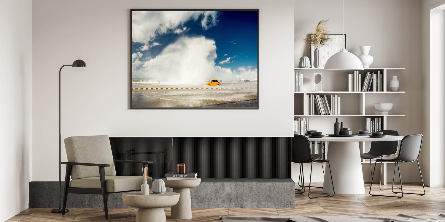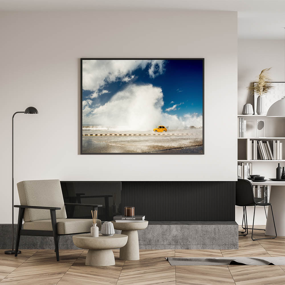 Capture the energy and vibrancy of Cuba with this stunning artwork featuring a classic yellow car driving along Havana's coastal road. The dramatic splash of ocean waves crashing against the barrier adds a dynamic element, perfectly representing the lively spirit of the island. This piece brings the essence of Cuban culture and adventure to your living space.
