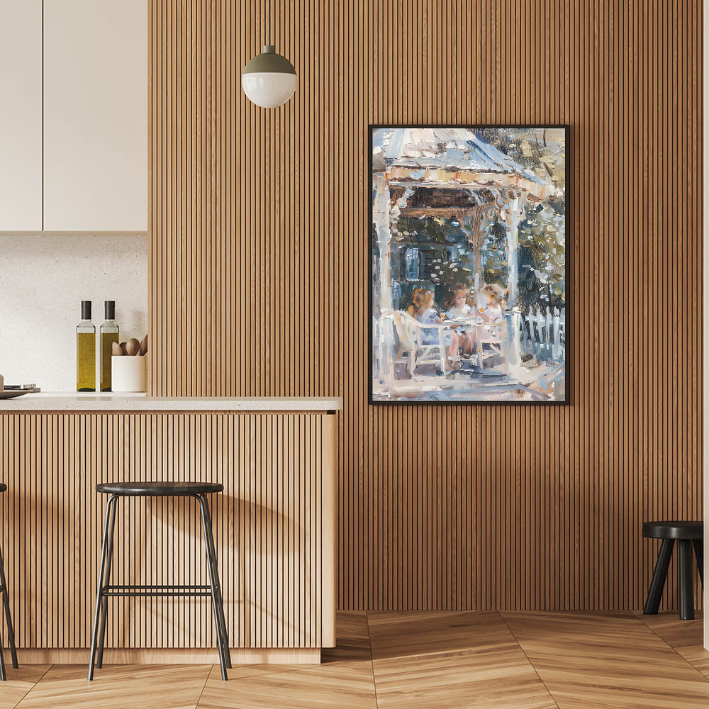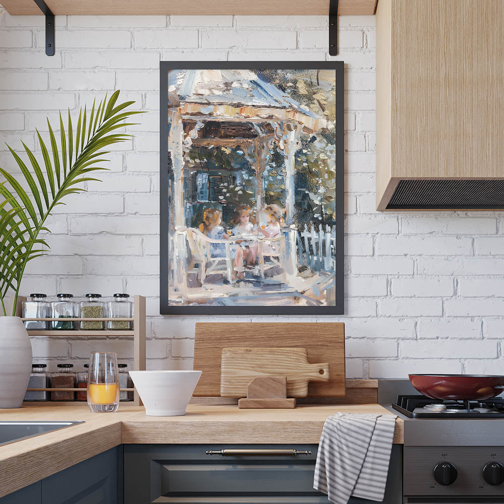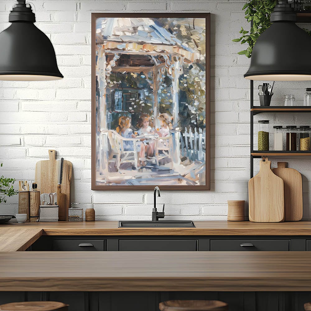 Bring the beauty of timeless gatherings into your space with this culinary portrait wall art, capturing a delicate scene of three young girls enjoying tea under a gazebo. The soft, expressive brushstrokes evoke a sense of warmth and nostalgia, making this artwork a perfect fit for restaurant wall art, kitchen decor, or gourmet-inspired spaces.