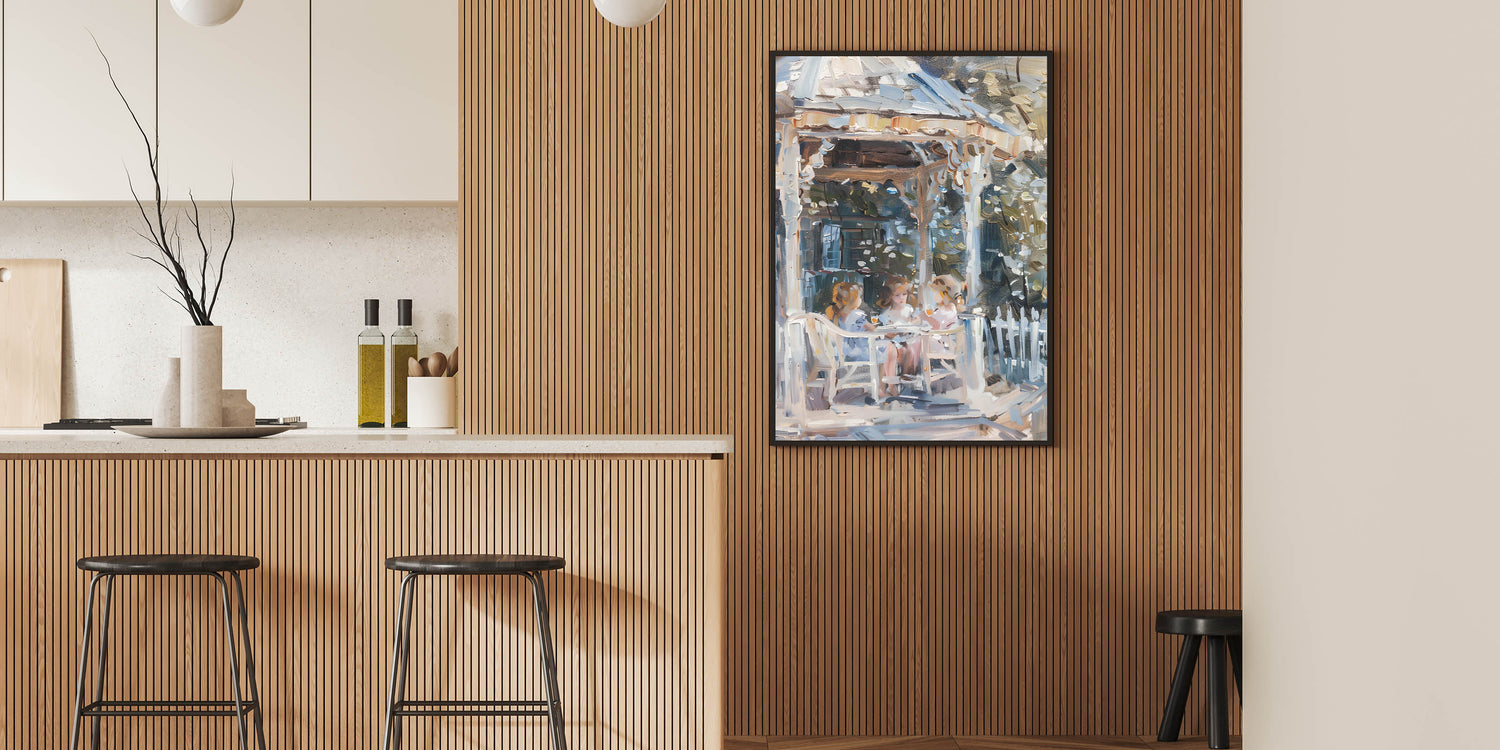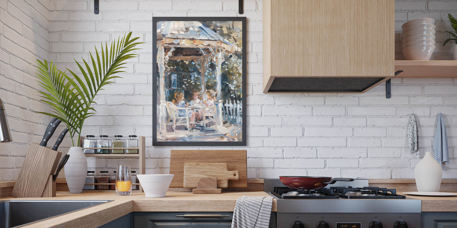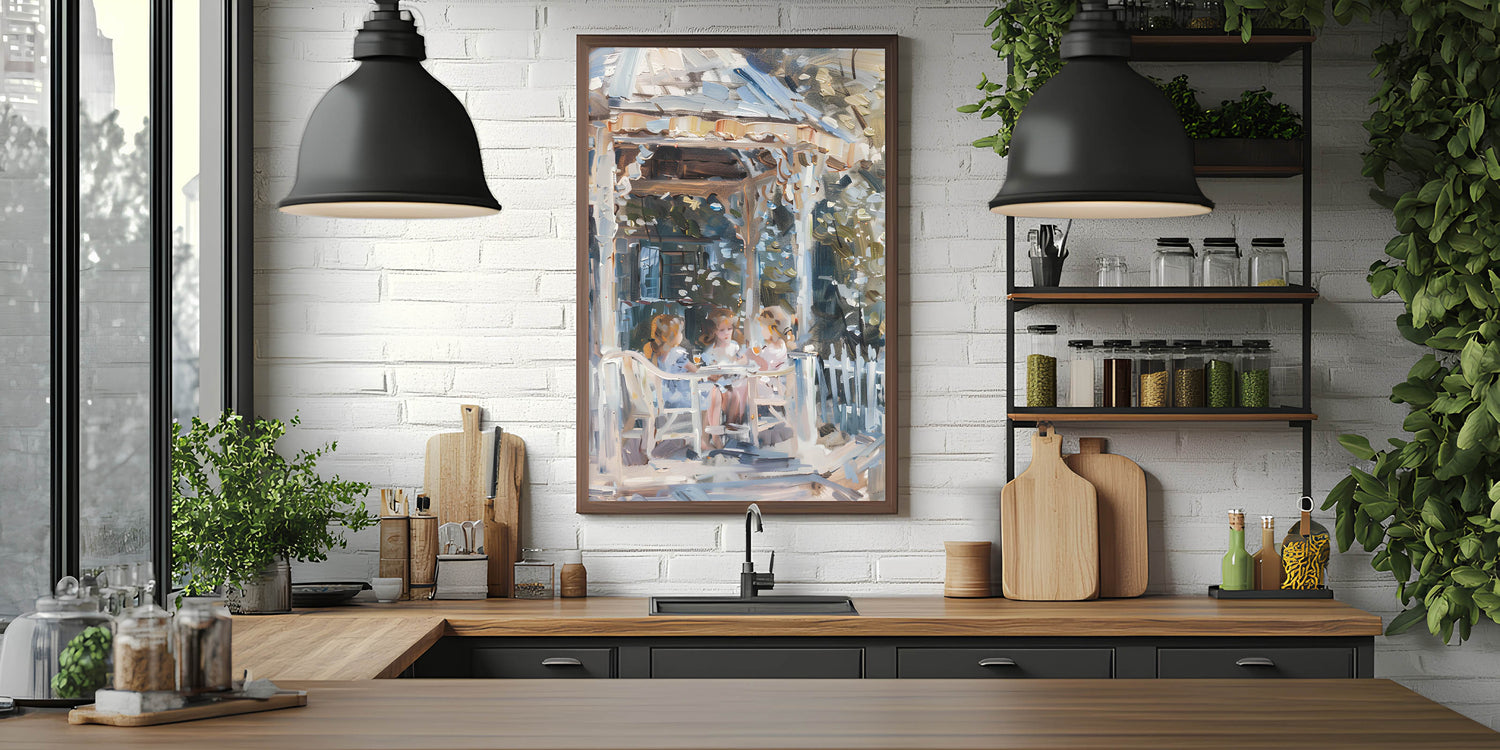 Bring the beauty of timeless gatherings into your space with this culinary portrait wall art, capturing a delicate scene of three young girls enjoying tea under a gazebo. The soft, expressive brushstrokes evoke a sense of warmth and nostalgia, making this artwork a perfect fit for restaurant wall art, kitchen decor, or gourmet-inspired spaces.