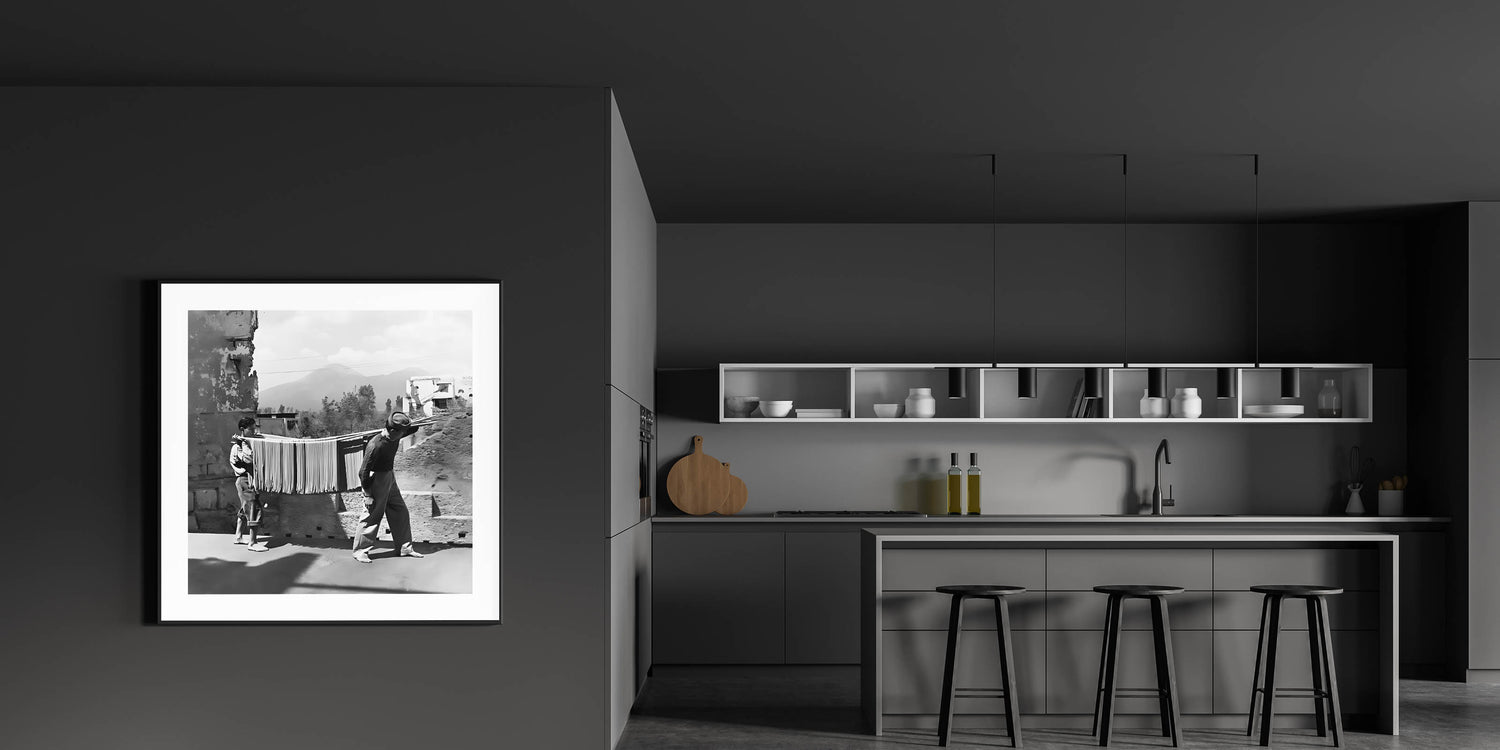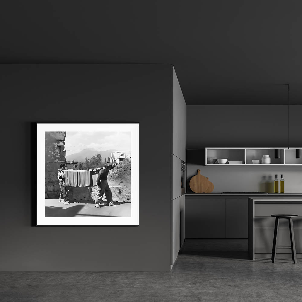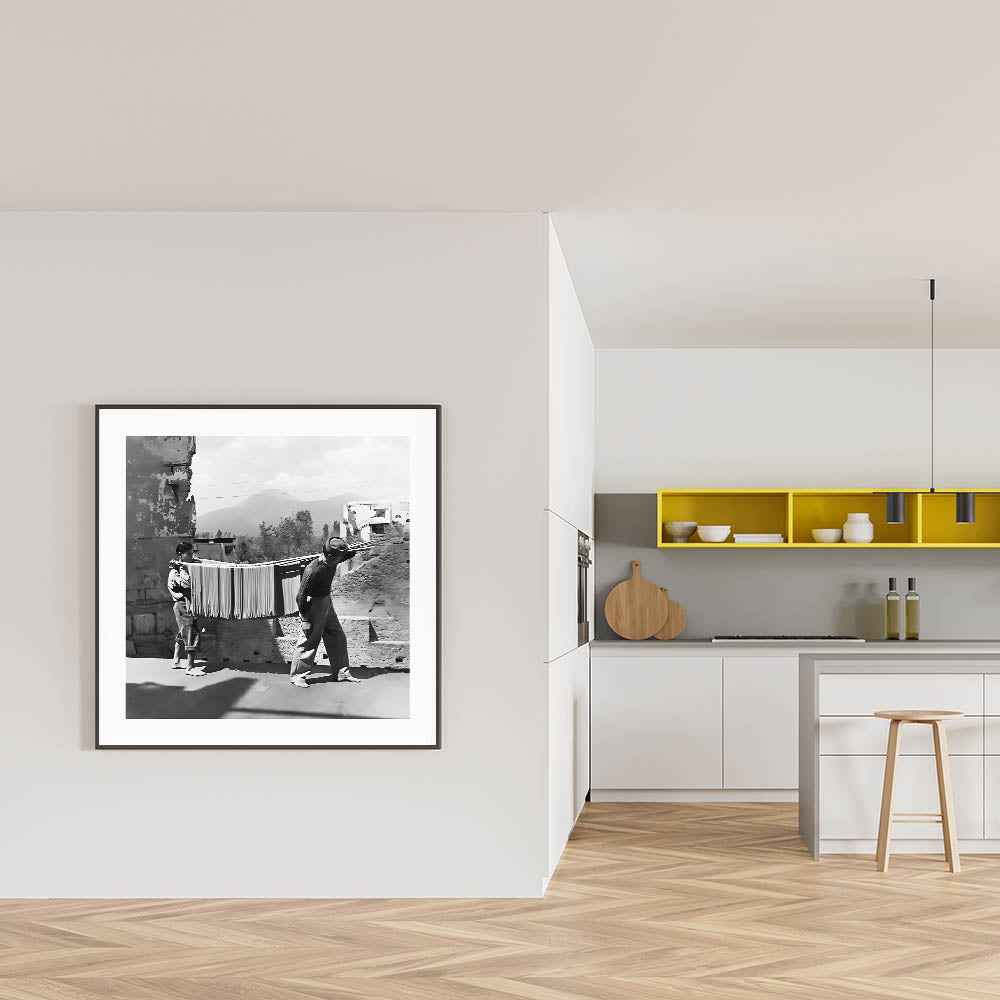 Step into the world of traditional pasta-making with this chef photography wall art, featuring artisans transporting strands of fresh pasta in a rustic, open-air setting. This culinary portrait wall art beautifully embodies the dedication and craftsmanship behind handmade cuisine, making it an excellent choice for restaurant wall art, kitchen decor, or gourmet-themed spaces.