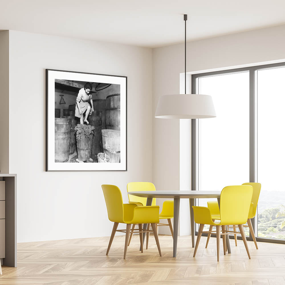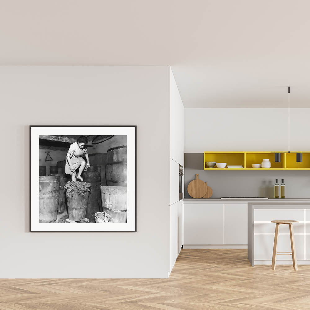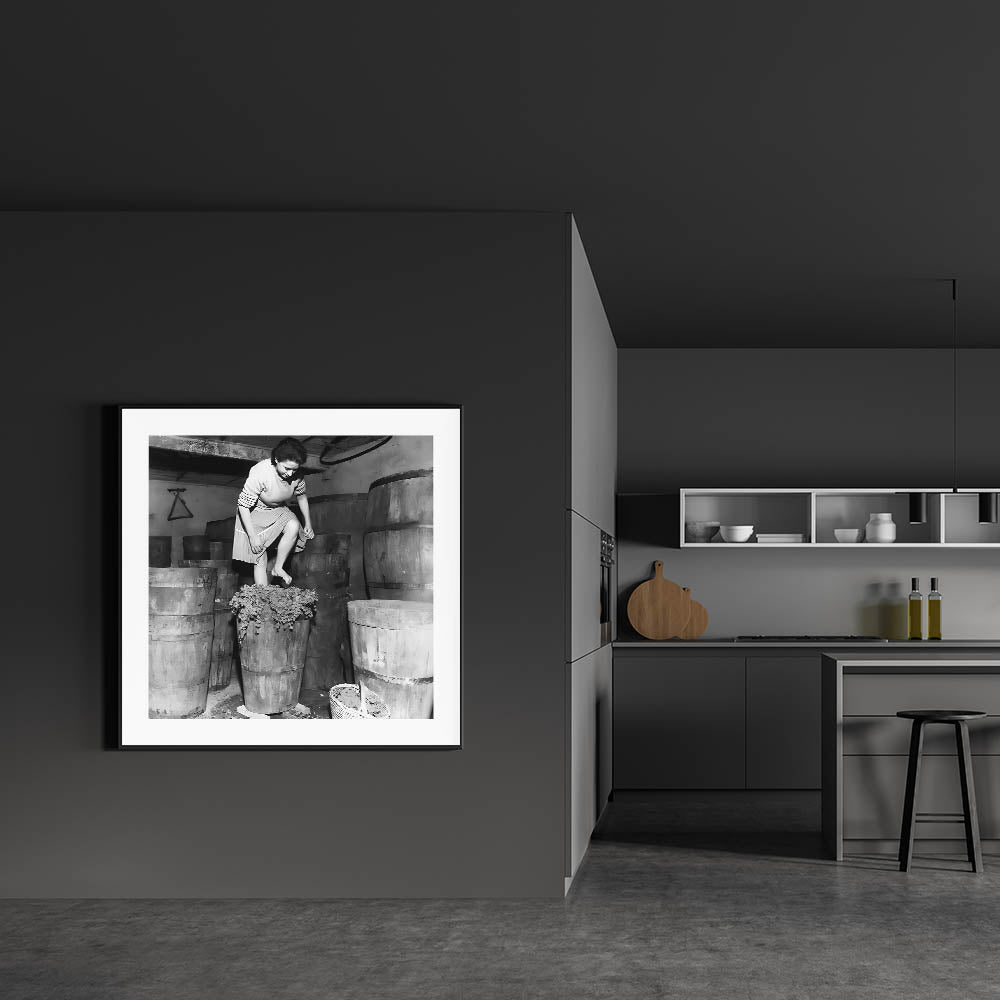 Step into the world of artisanal winemaking with this chef photography wall art, featuring a woman carefully stomping grapes in a rustic winery. This culinary portrait wall art captures the essence of craftsmanship and tradition, making it an ideal addition to restaurant wall art, kitchen decor, or wine-themed spaces.