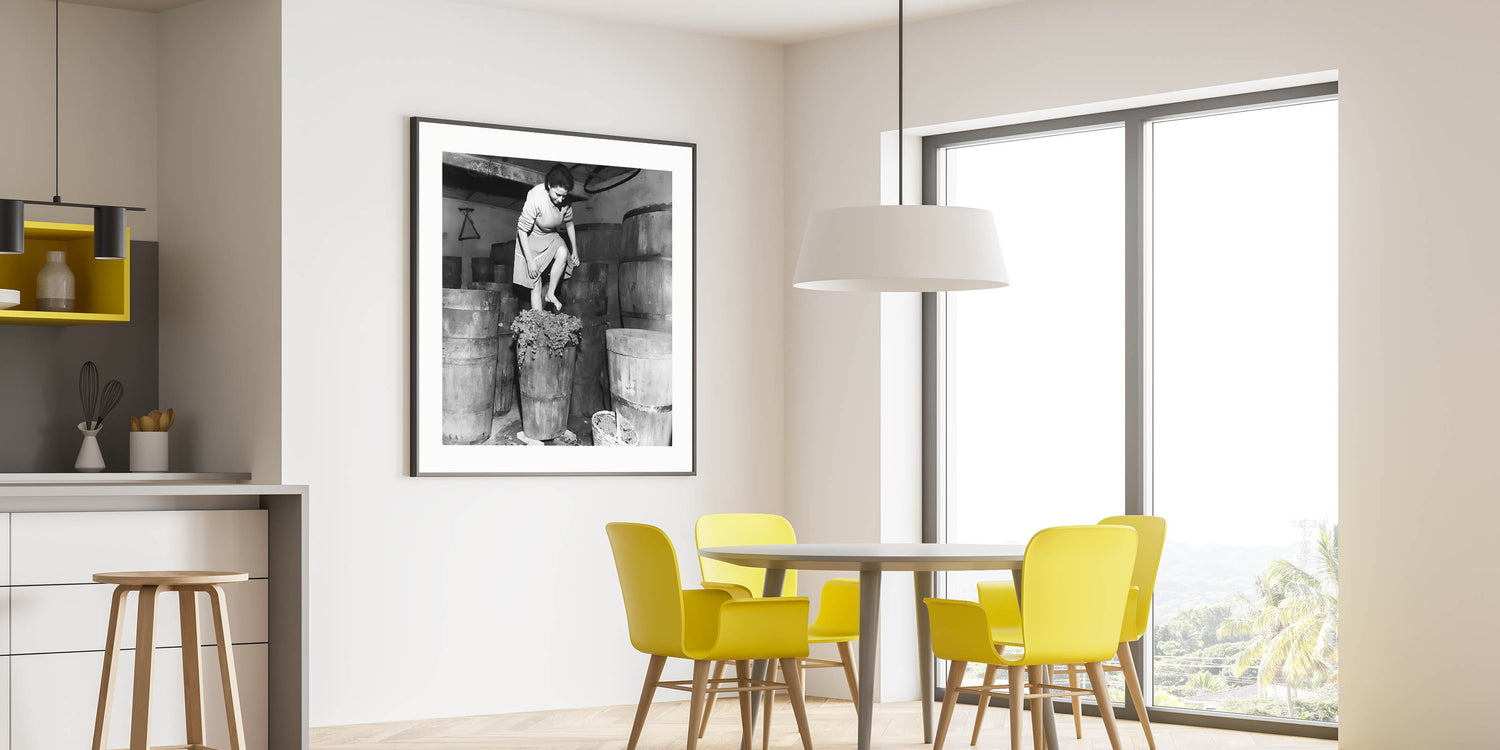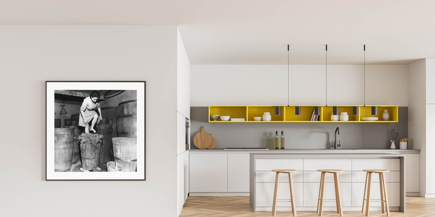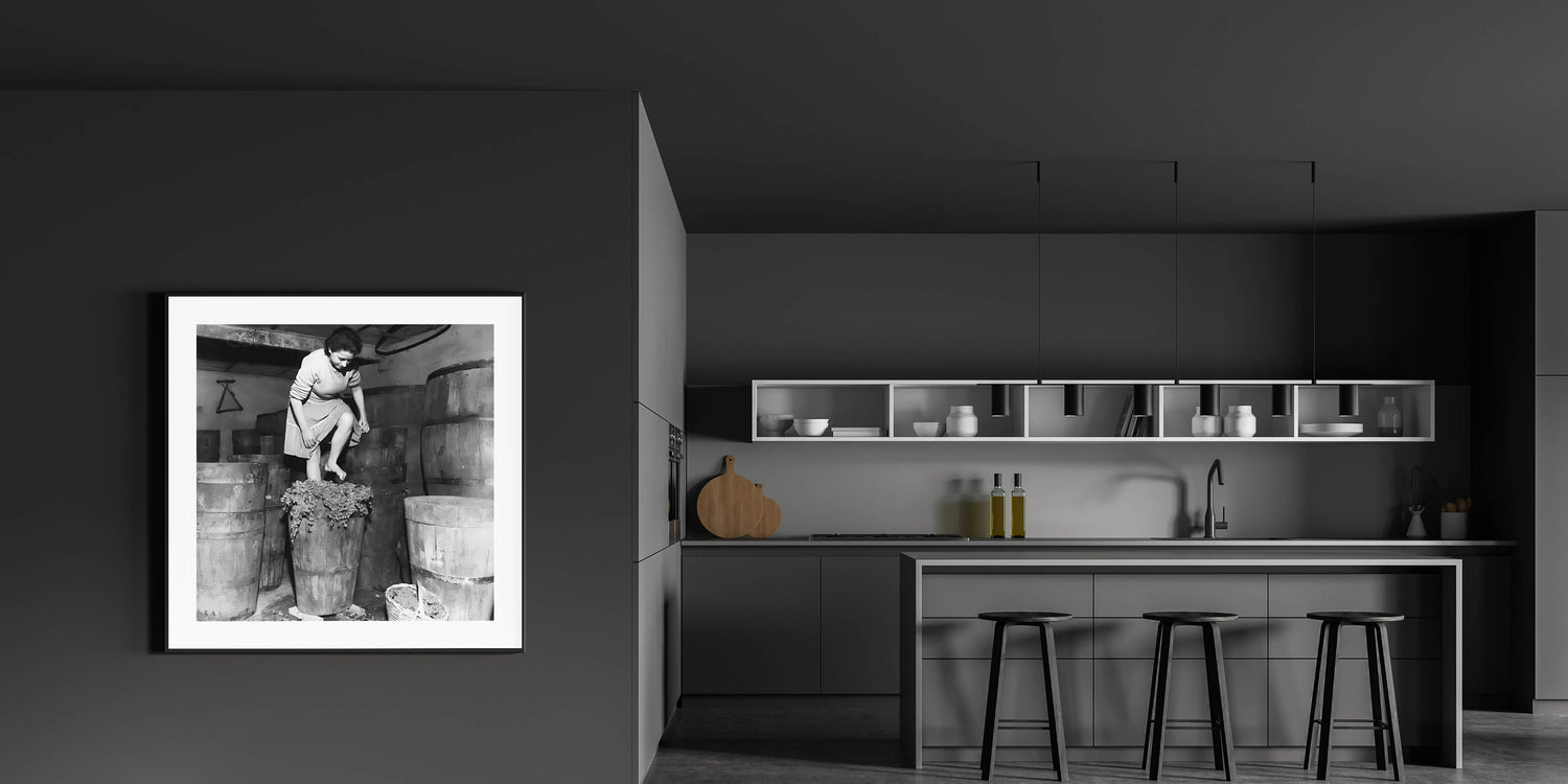 Step into the world of artisanal winemaking with this chef photography wall art, featuring a woman carefully stomping grapes in a rustic winery. This culinary portrait wall art captures the essence of craftsmanship and tradition, making it an ideal addition to restaurant wall art, kitchen decor, or wine-themed spaces.
