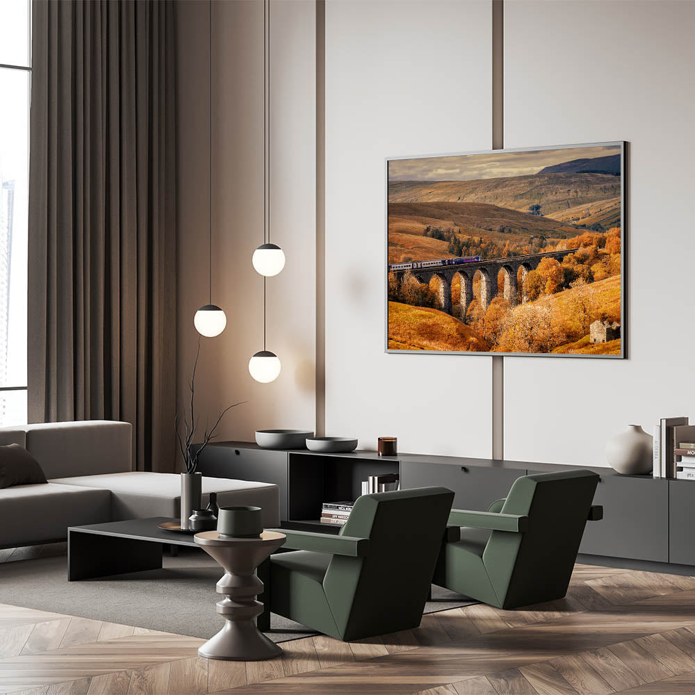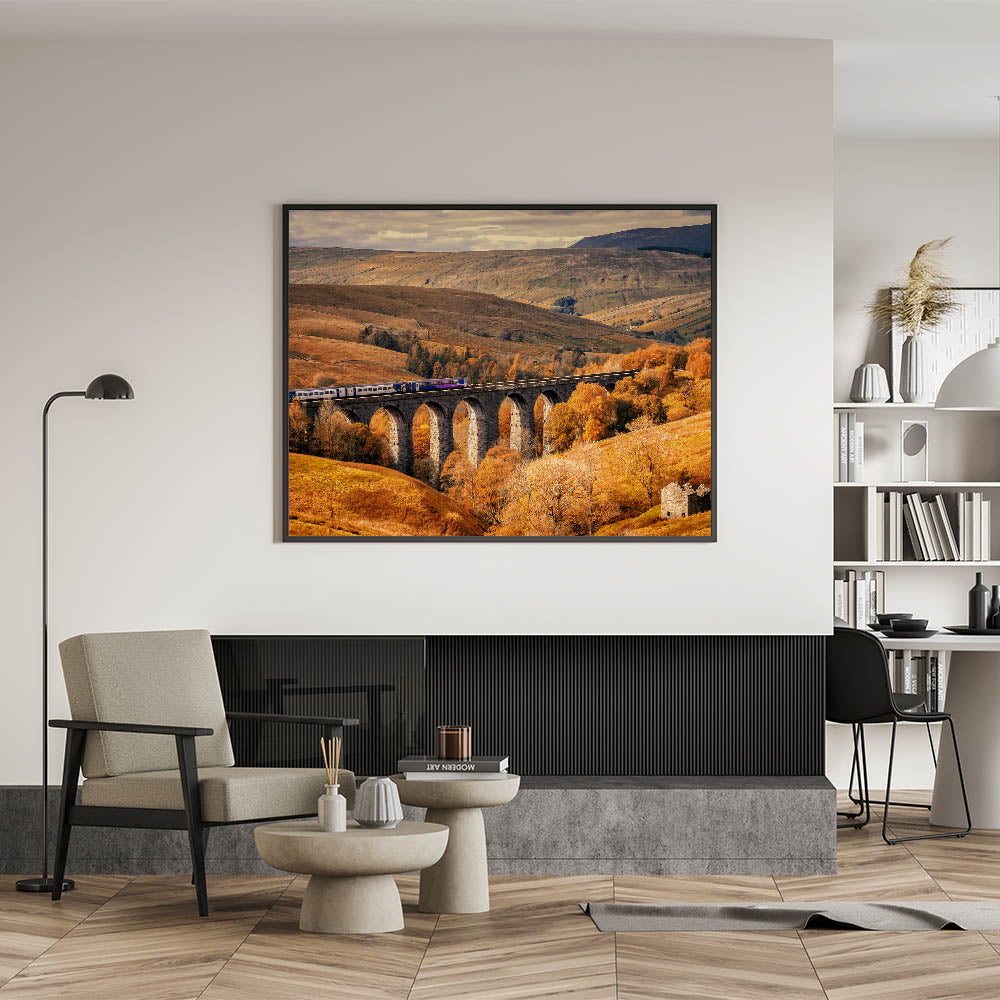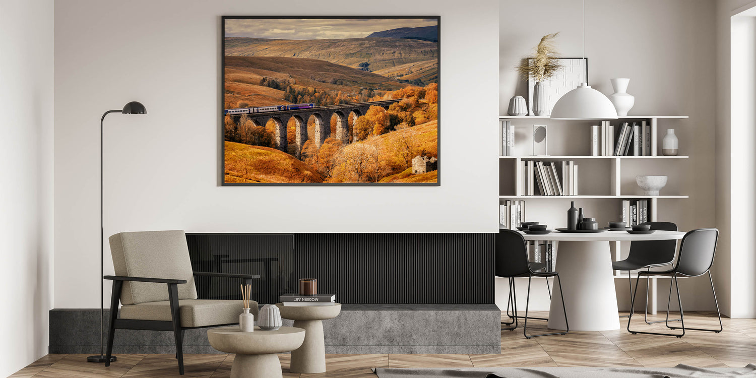 Capture the beauty of autumn in Cumbria with this stunning Cumbria landscape art. Featuring a viaduct stretching across the golden-hued hills, this artwork showcases a train crossing the bridge, blending modern transportation with the timeless beauty of the Lake District. The warm oranges and browns of the landscape provide a perfect backdrop for this dynamic scene, making it an ideal choice for any lover of Cumbria prints.