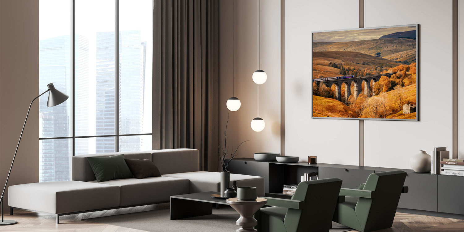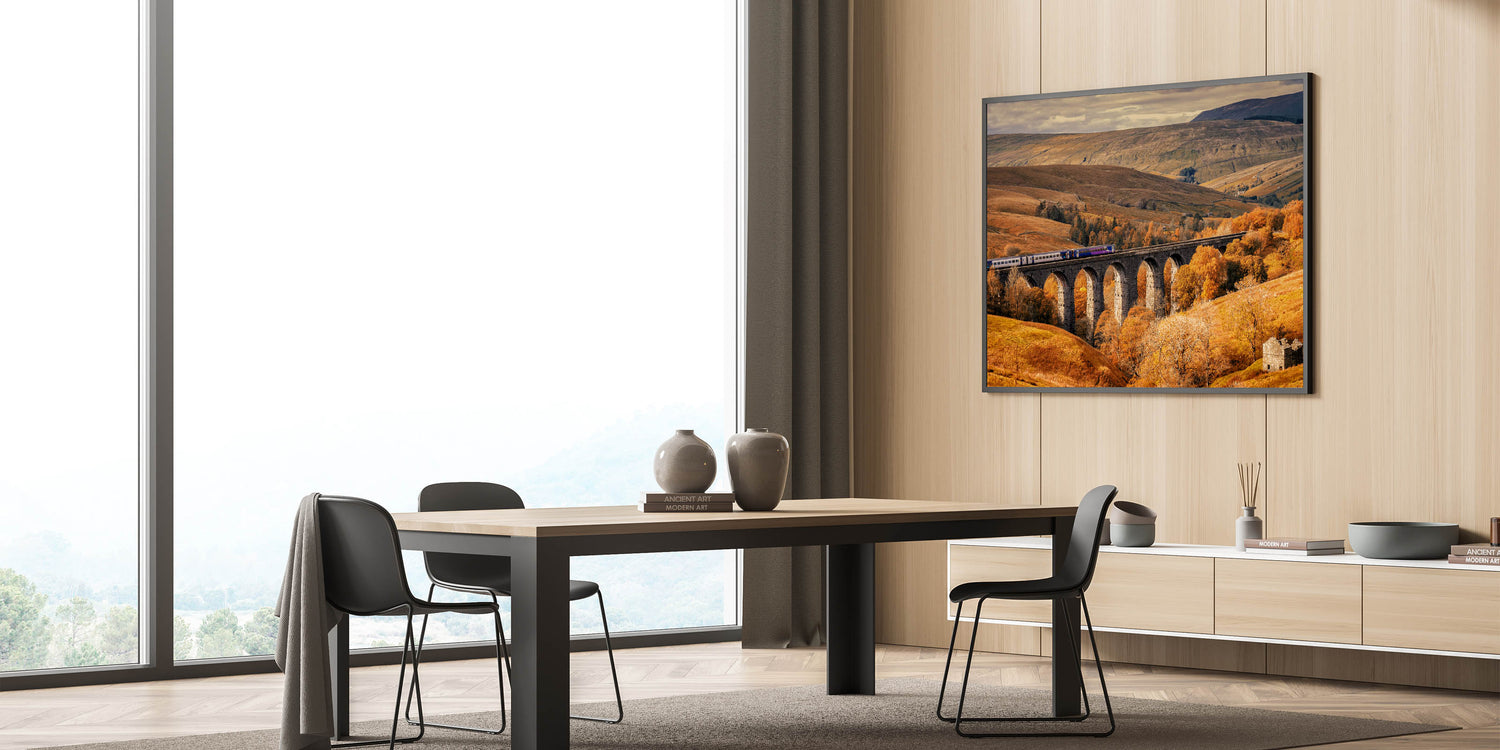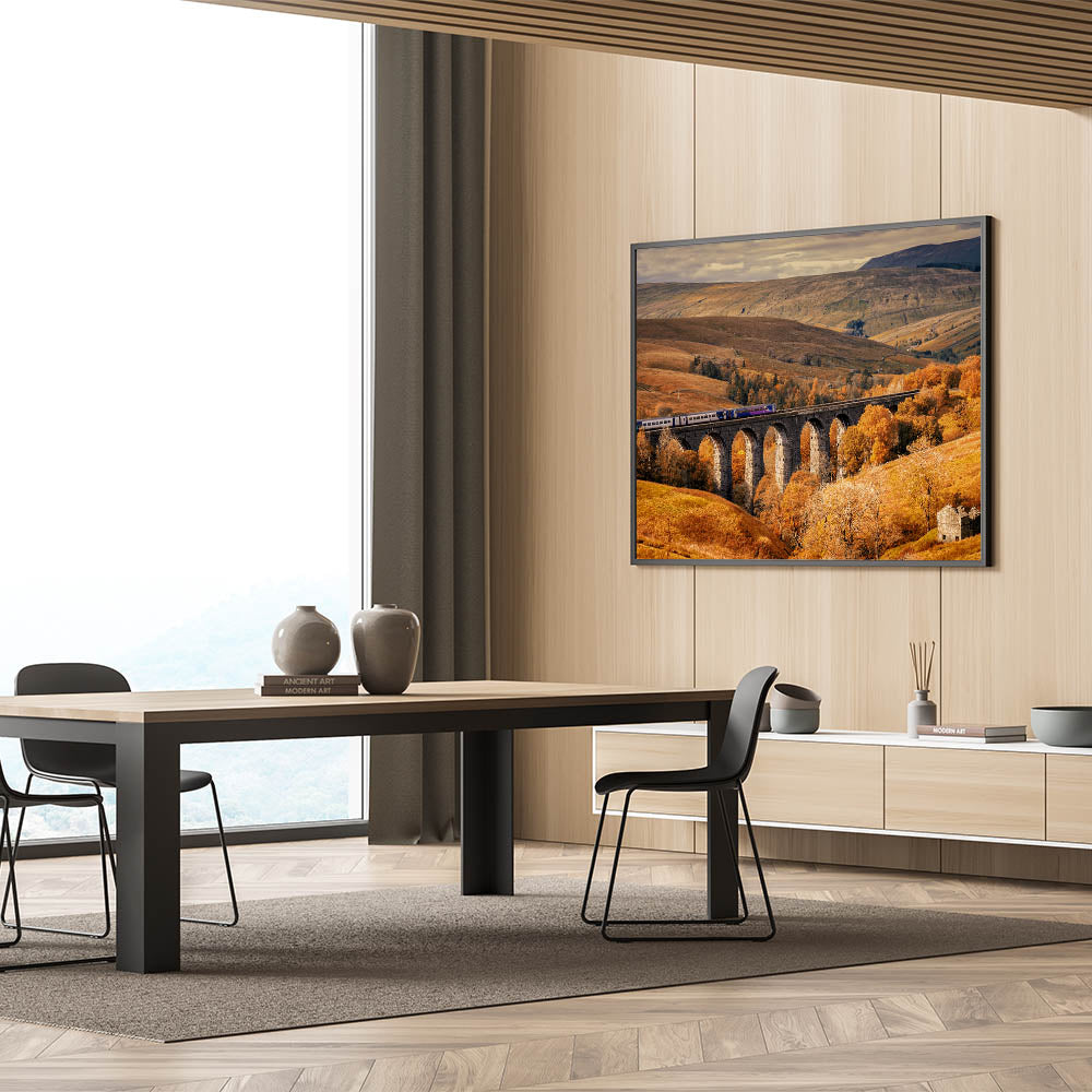 Capture the beauty of autumn in Cumbria with this stunning Cumbria landscape art. Featuring a viaduct stretching across the golden-hued hills, this artwork showcases a train crossing the bridge, blending modern transportation with the timeless beauty of the Lake District. The warm oranges and browns of the landscape provide a perfect backdrop for this dynamic scene, making it an ideal choice for any lover of Cumbria prints.