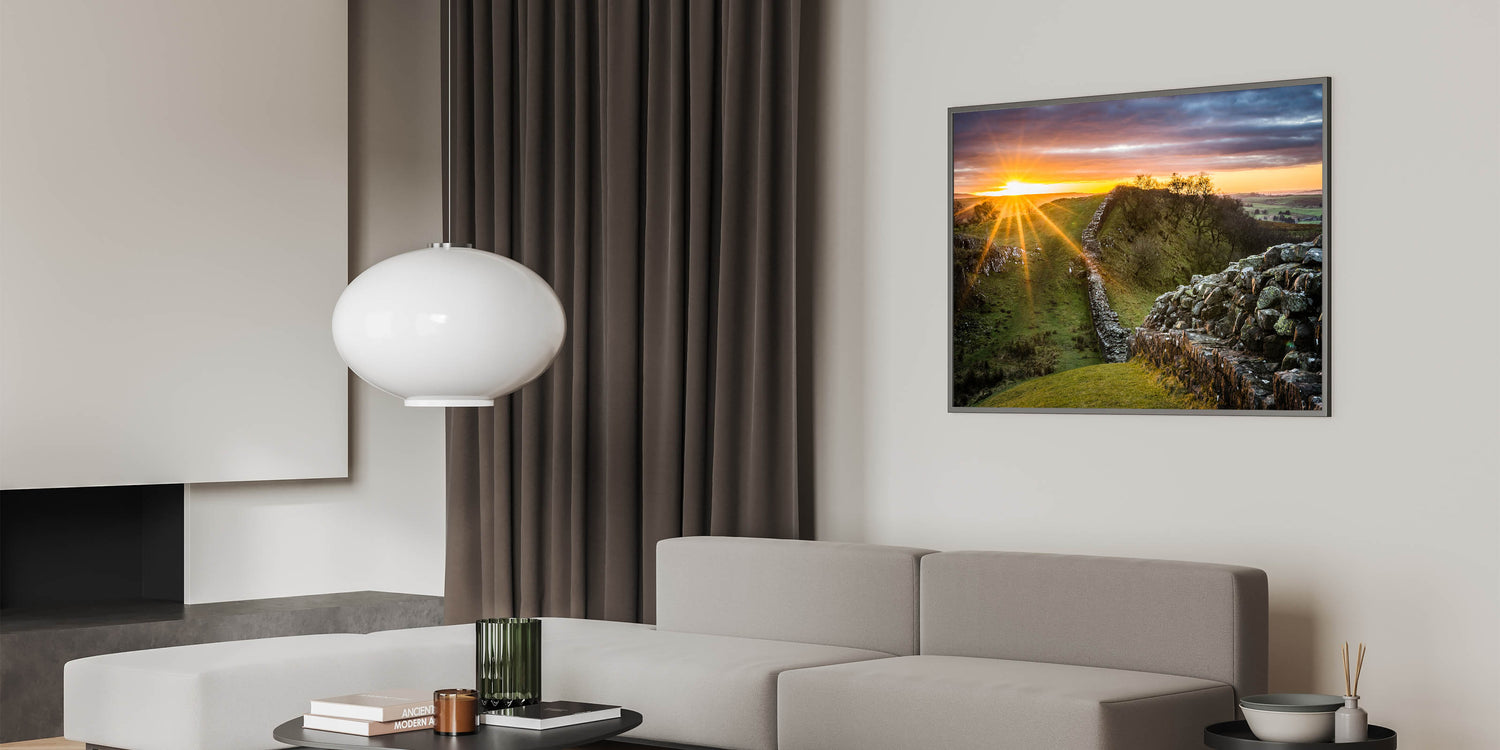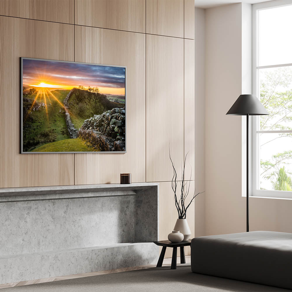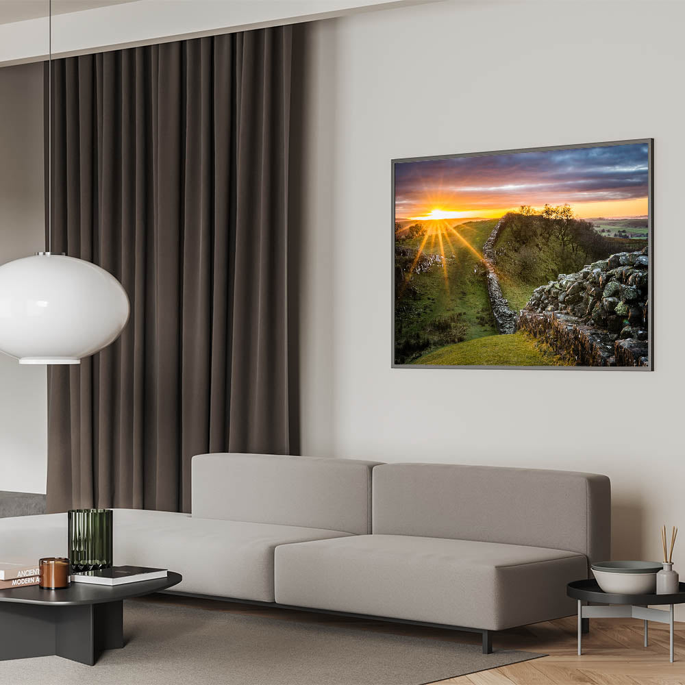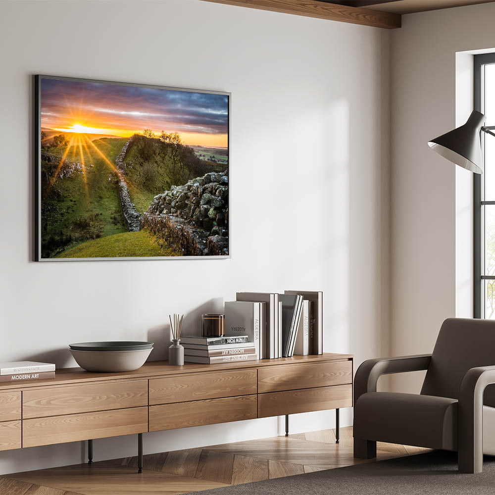 This captivating Cumbria landscape art captures the golden rays of the sunrise illuminating an ancient stone wall, creating a mesmerizing and timeless scene. Part of the Cumbria Scenery By Region Collection, this artwork celebrates the historic beauty of Cumbria and its stunning natural landscapes. Whether in canvas, framed print, or acrylic glass, this piece brings warmth and history into your home decor.