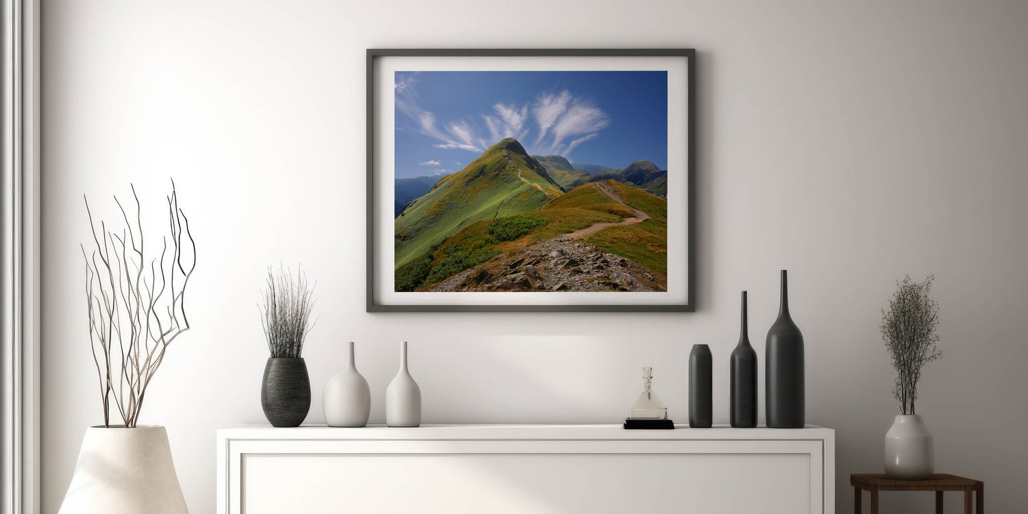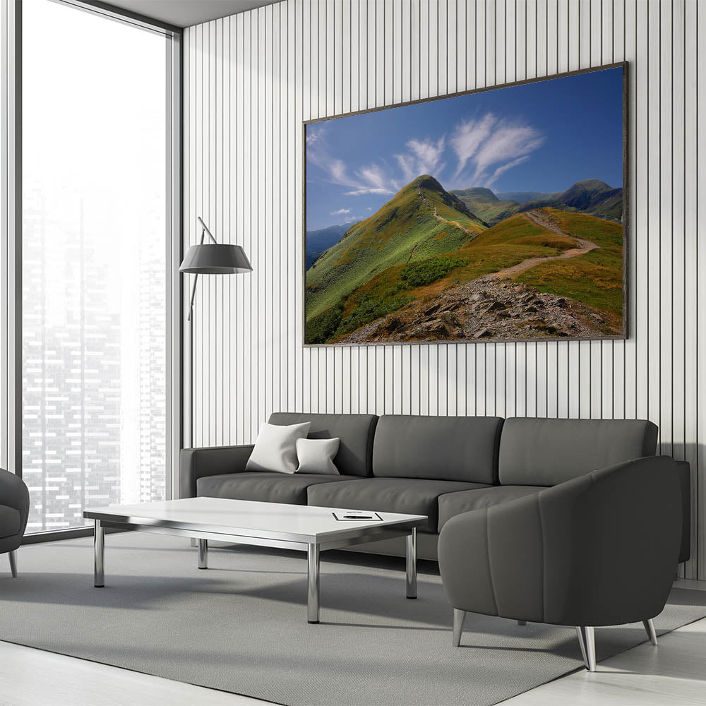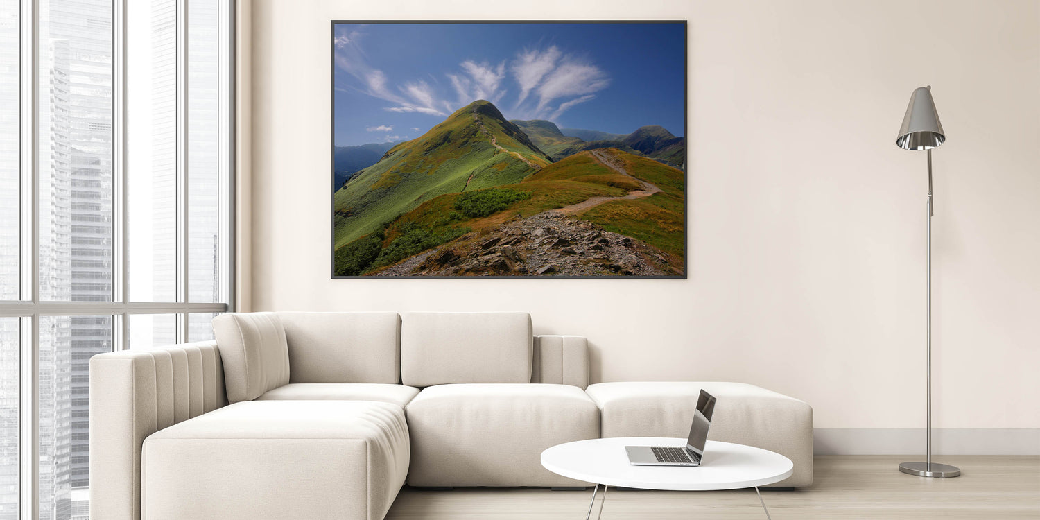 Immerse yourself in the breathtaking beauty of Cumbria with this striking wall art showcasing a scenic mountain path under a bright blue sky. Part of our Cumbria Scenery By Region Collection, this piece captures the essence of the Lake District's rolling hills and serene, unspoiled landscapes. Whether you choose canvas, framed prints, or acrylic glass, this artwork is a perfect addition to your home decor, evoking the natural beauty of England’s countryside.