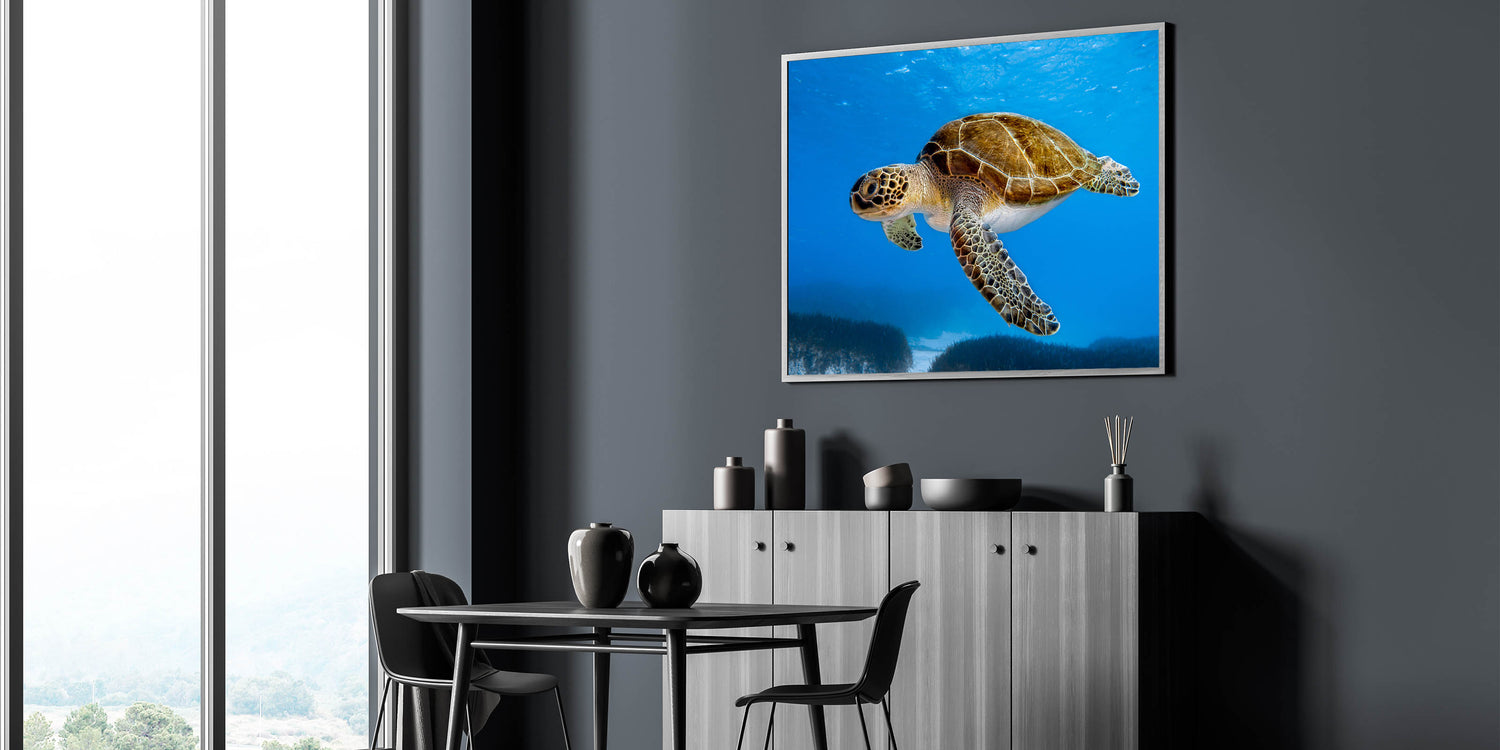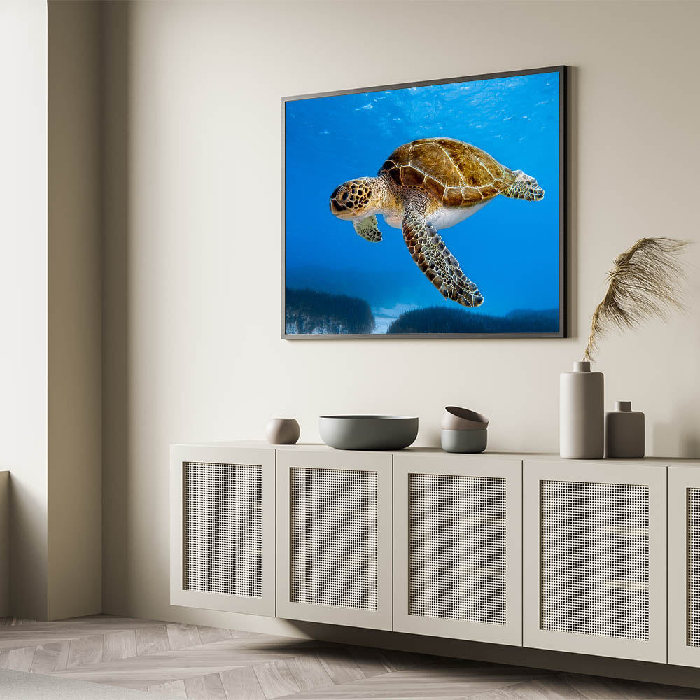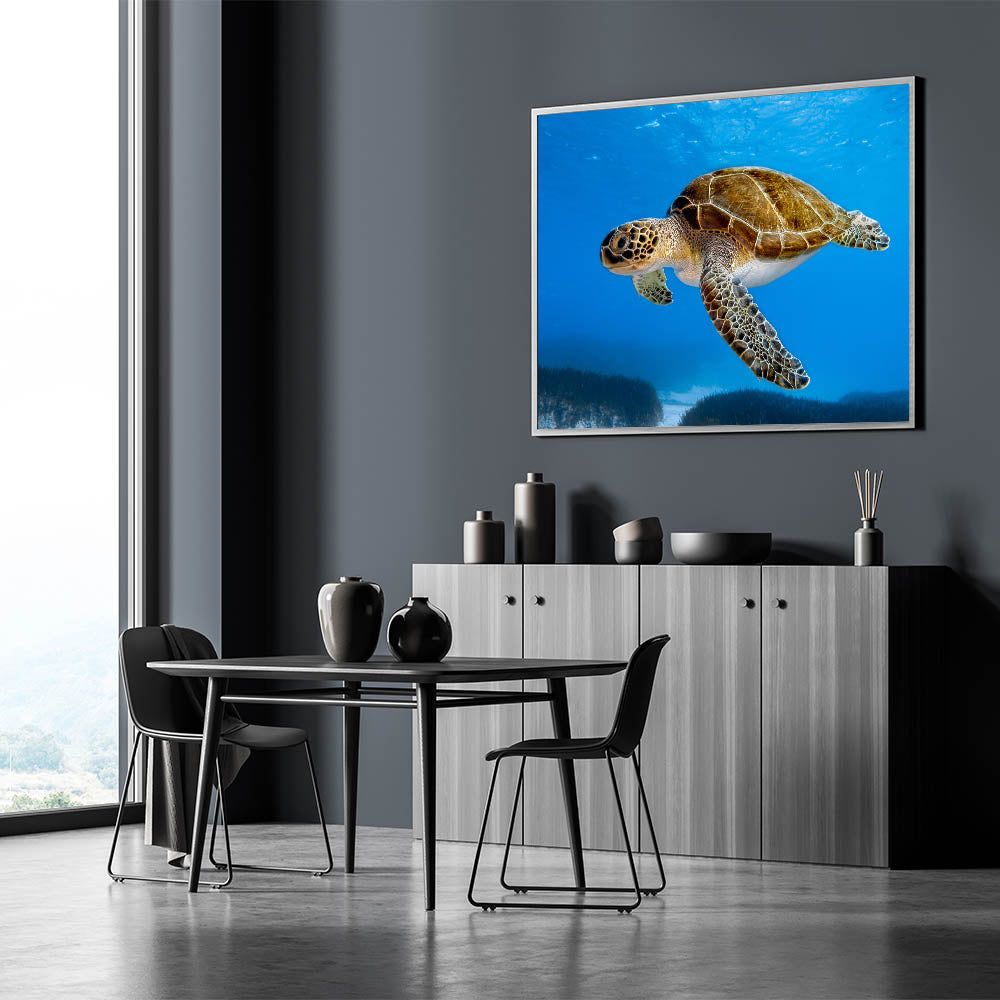 This beautiful art piece is ideal for adding a calming and refreshing atmosphere to any room. Whether displayed in a living room, bedroom, or office, this vibrant turtle photography brings a touch of nature's elegance to your space, making it a perfect choice for lovers of scenic Cyprus prints.