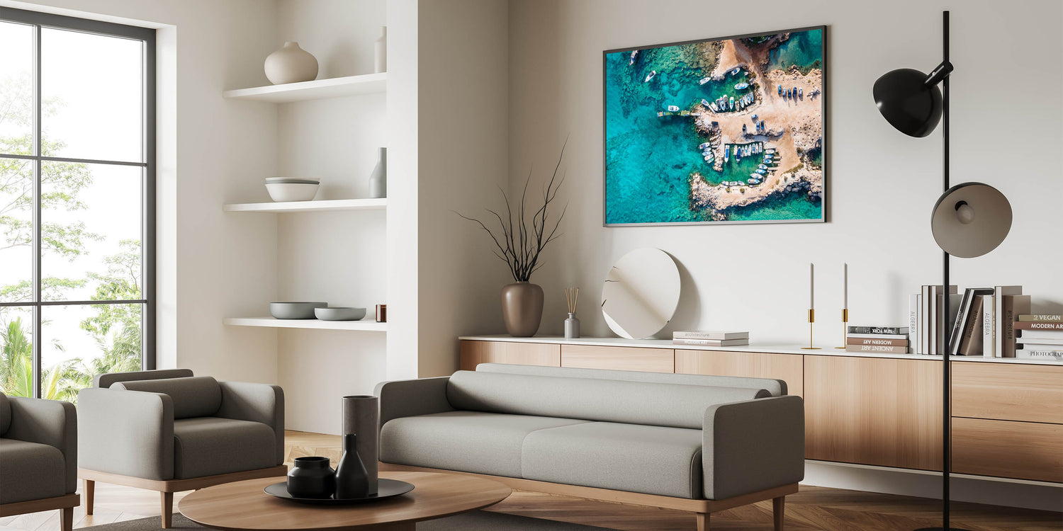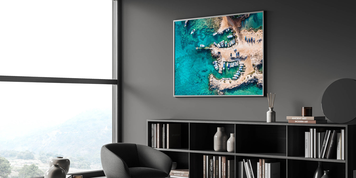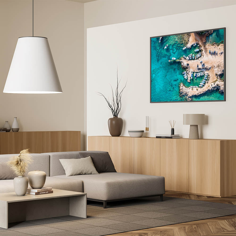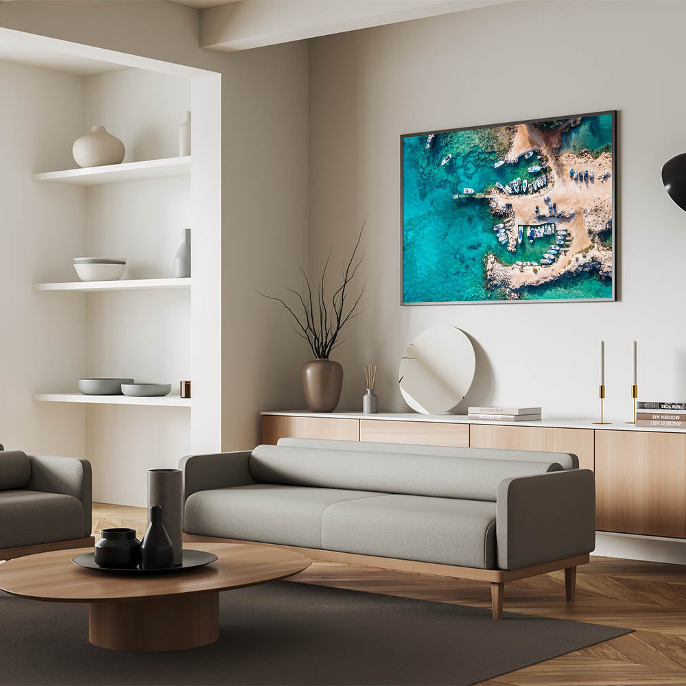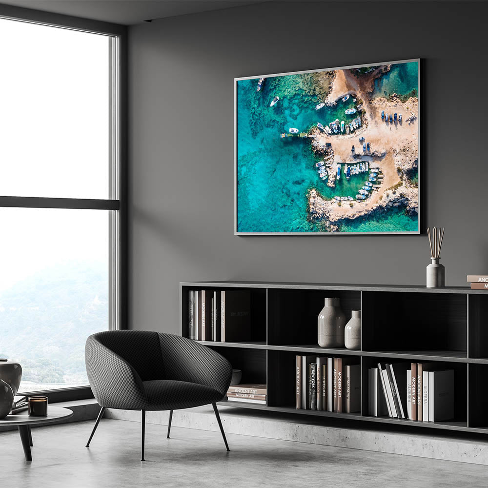 Bring the breathtaking beauty of the Mediterranean into your home with this stunning Cyprus wall art. This aerial view of a serene coastal scene in Cyprus captures the crystal-clear turquoise waters and charming boats along the rocky shore. Perfect for any room, this art piece celebrates the island's natural beauty and its idyllic coastline, making it an excellent addition to Mediterranean home decor.