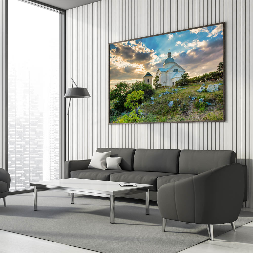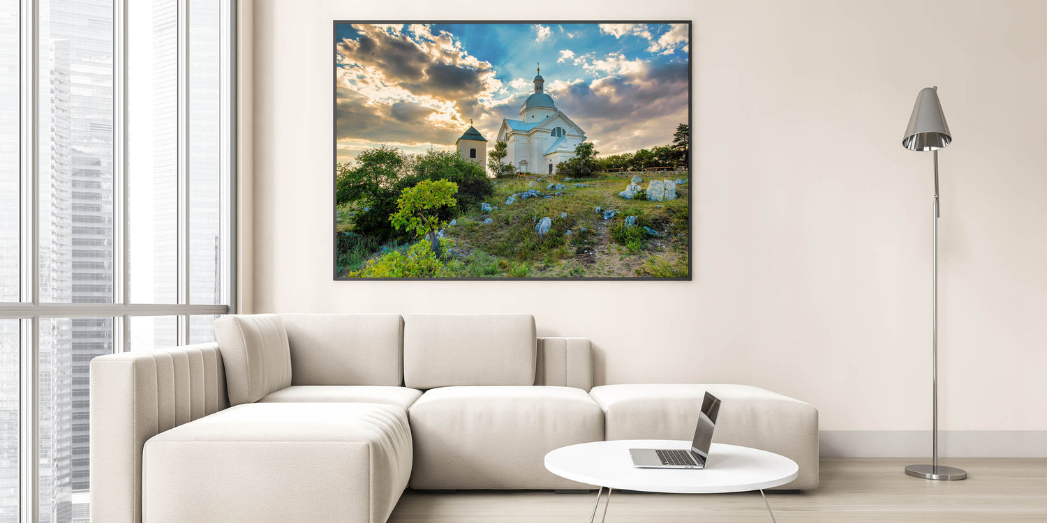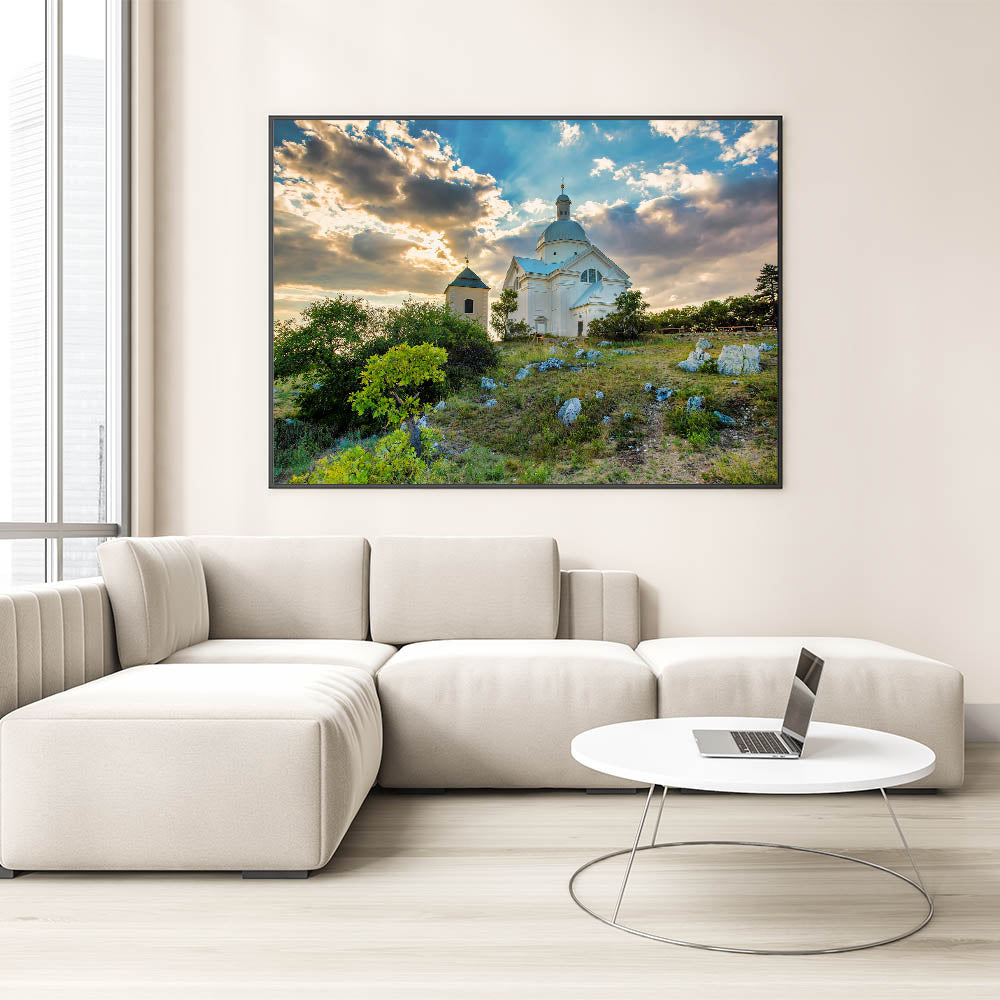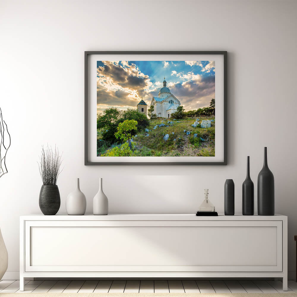 Immerse yourself in the beauty of Czech architecture with this stunning wall art featuring a historic church set against the backdrop of a dramatic sky. The white walls of the church gleam in the soft light, while the surrounding greenery adds a natural touch, making this a perfect piece for anyone who appreciates the blend of history and nature. Whether you’re a fan of Czech architecture or simply love European landscapes, this artwork is sure to make a statement in any room.