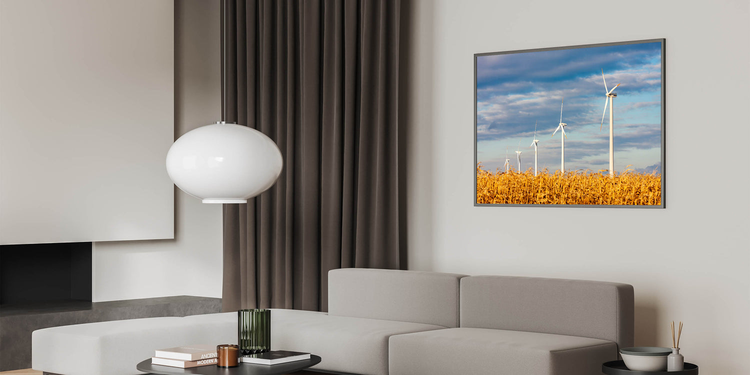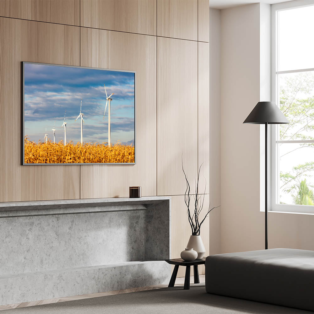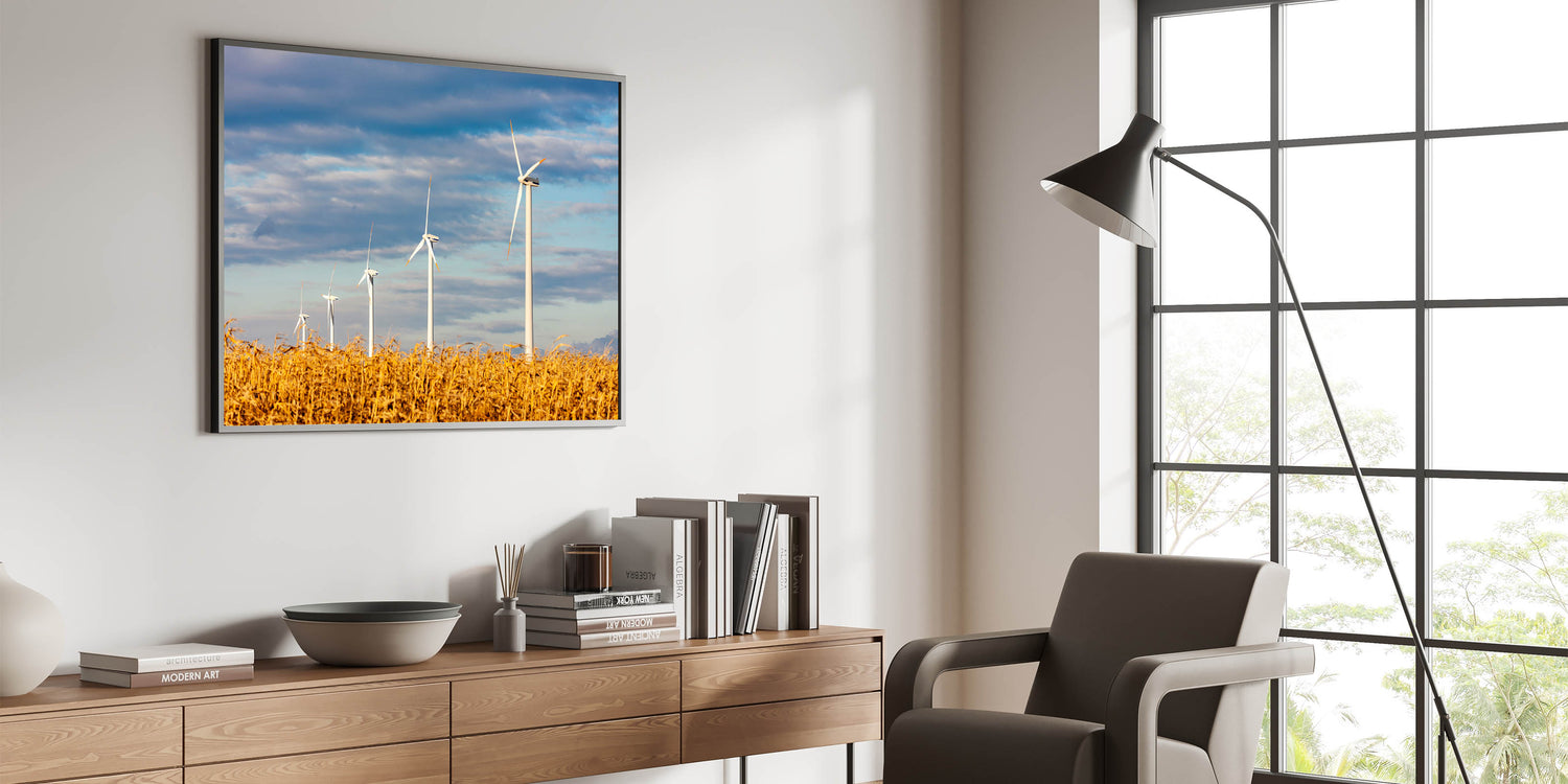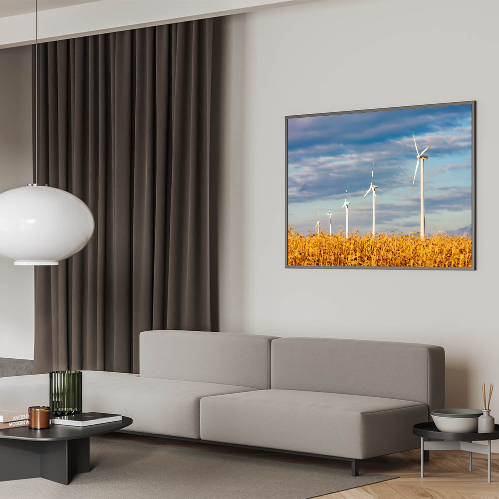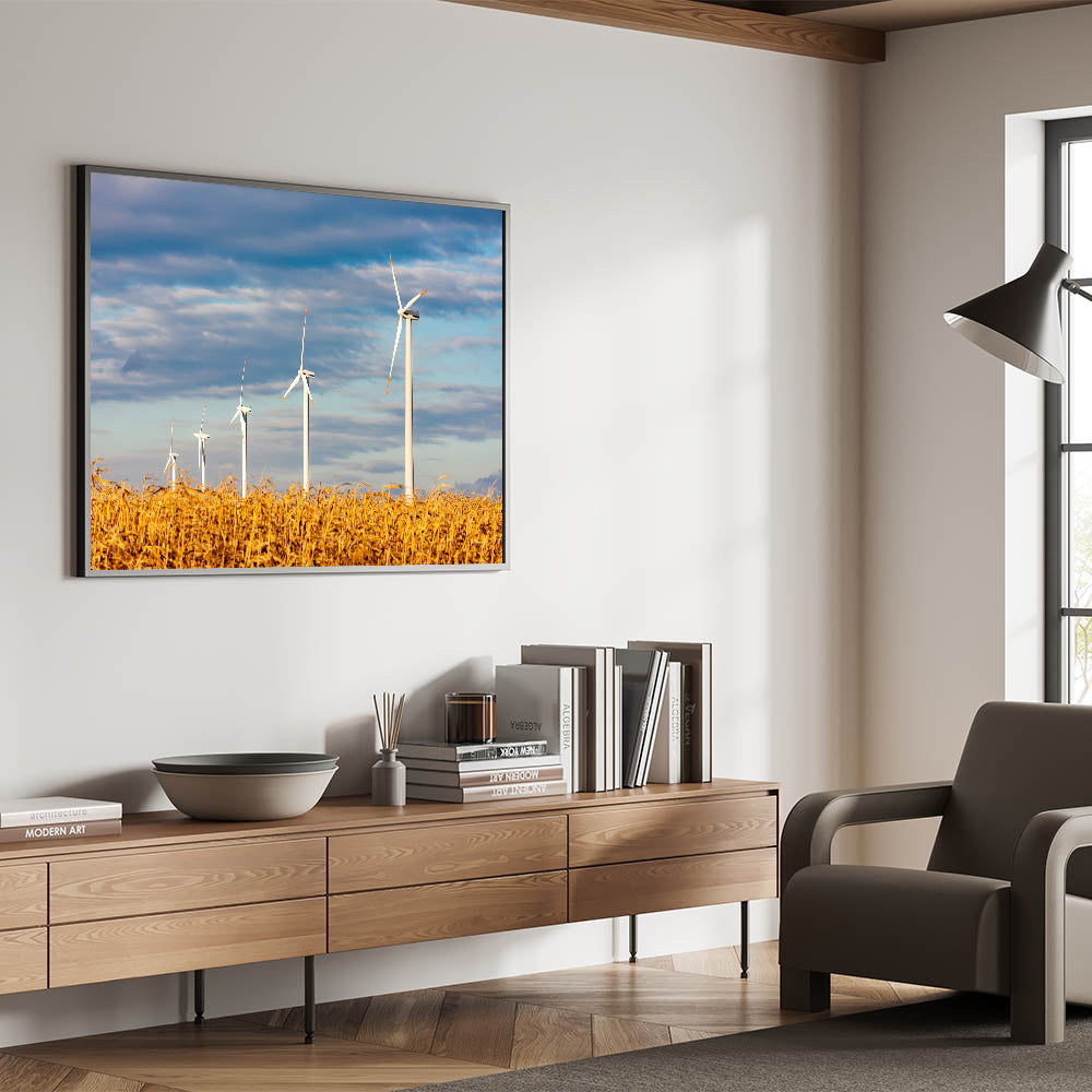 This striking wall art captures the modern beauty of wind turbines standing tall in the golden fields of the Czech Republic. The image perfectly blends the natural landscape with the technological innovation of renewable energy, making it an ideal piece for those who appreciate the harmony between nature and technology. The crisp blue sky contrasts beautifully with the earthy tones of the fields, creating a sense of calm and balance.