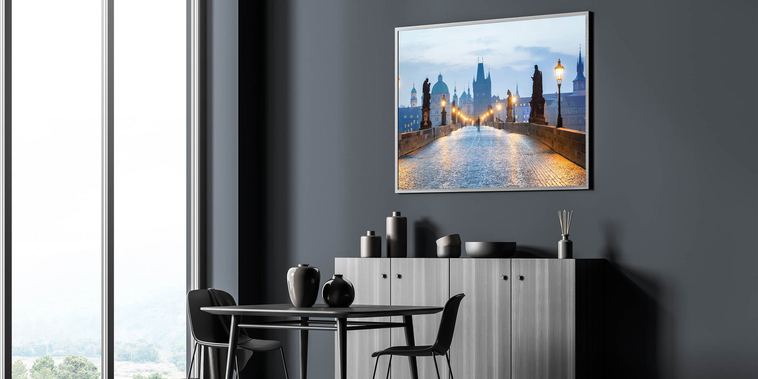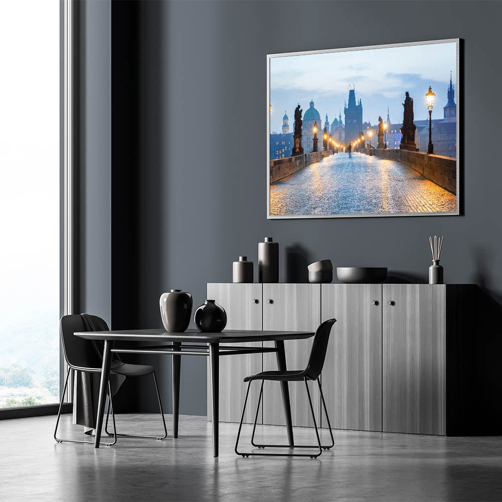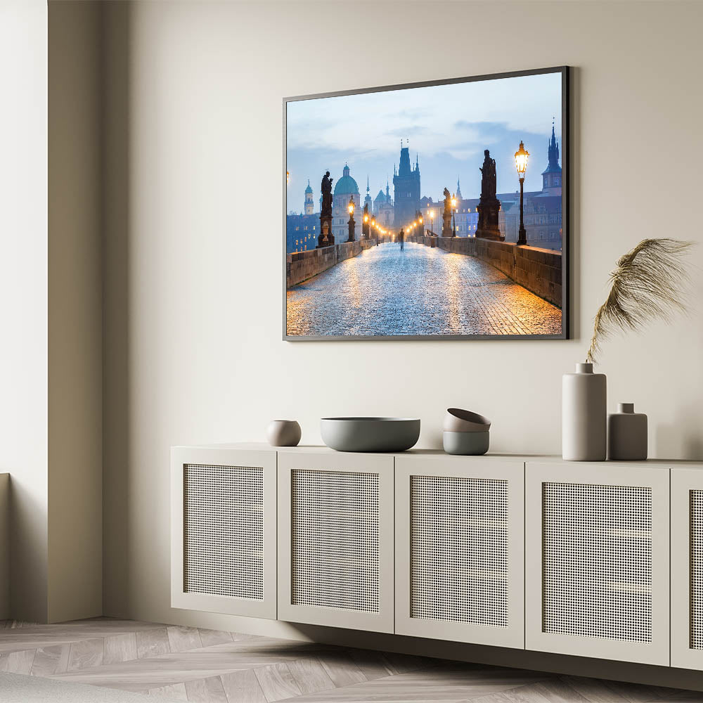 Discover the beauty of Prague with this stunning wall art featuring the Charles Bridge in the early morning light. The iconic statues and lampposts line the bridge as the soft glow of the lamps creates a peaceful and magical atmosphere. This scene perfectly captures the charm and history of the Czech Republic’s capital, making it a perfect piece for lovers of European cities and Czech Republic photography.