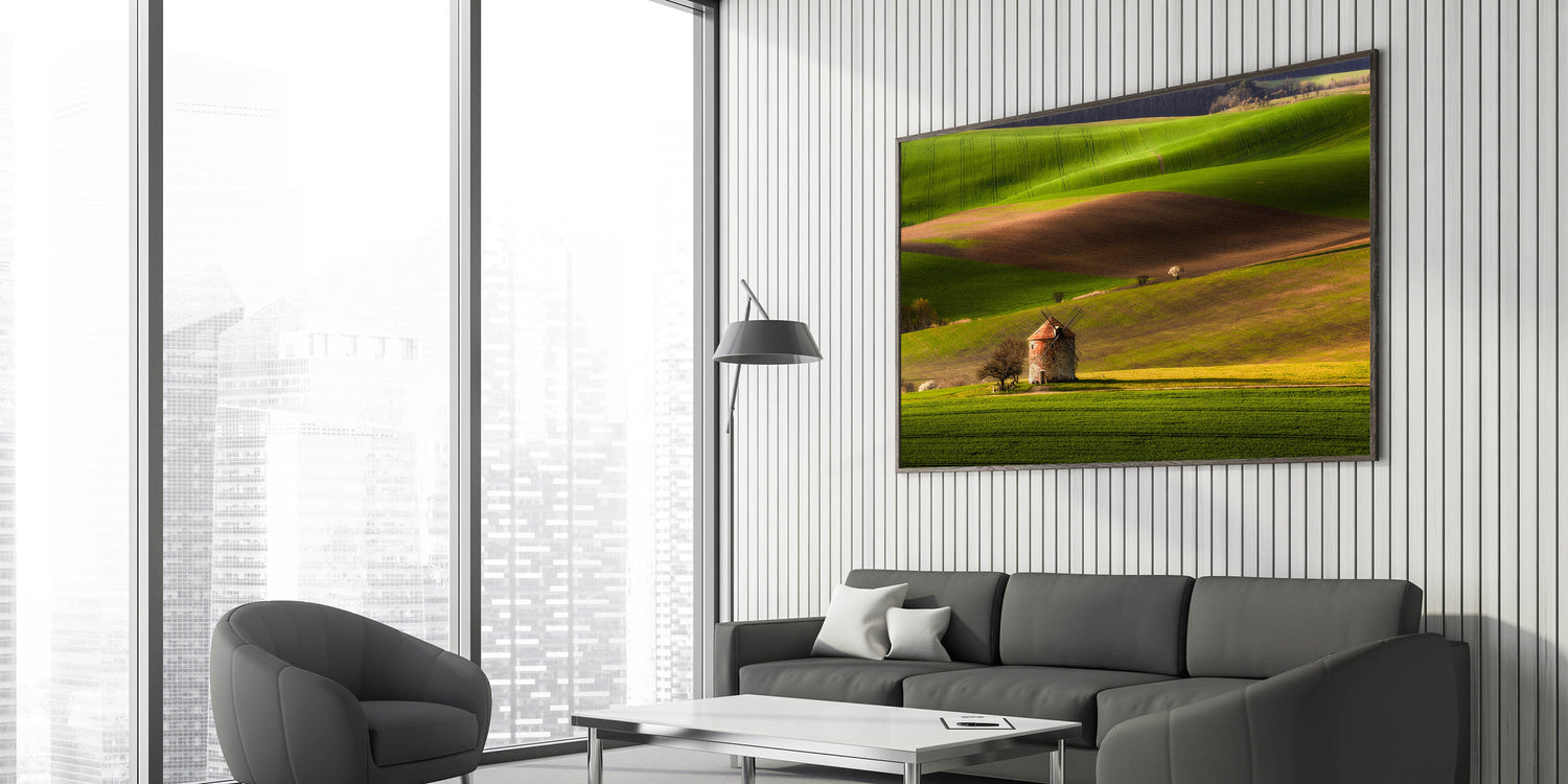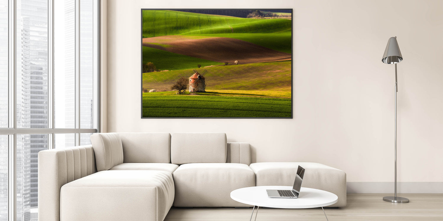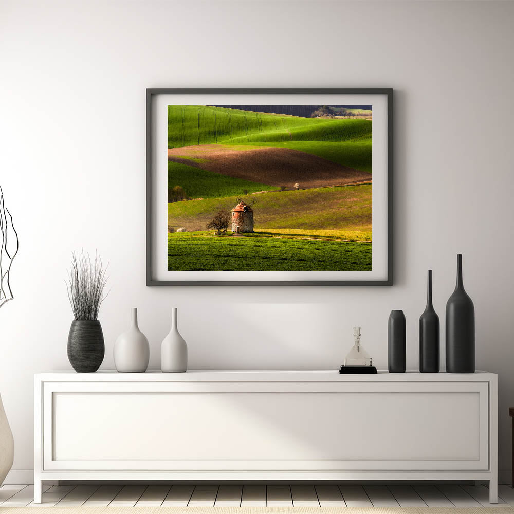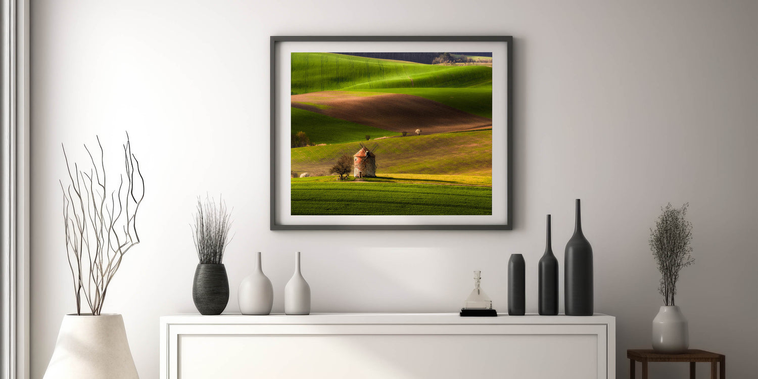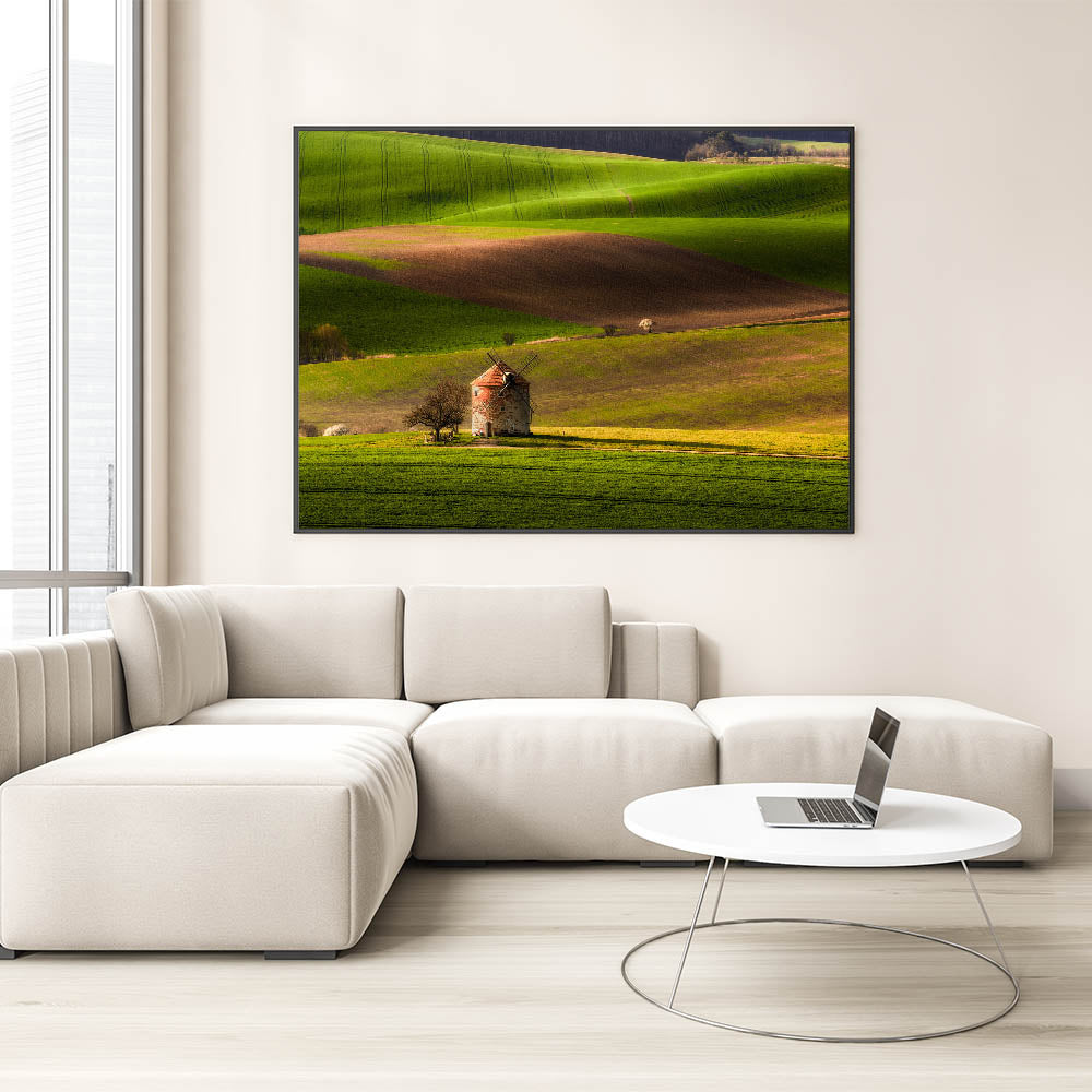 This captivating wall art showcases a historic windmill nestled in the rolling green hills of the Czech Republic. The soft, golden light adds depth and warmth to the landscape, making the windmill stand out against the natural contours of the land. The vibrant greens and earthy tones bring a sense of tranquility, perfectly capturing the beauty of rural Czech landscapes. Ideal for lovers of European architecture and nature, this Czech Republic scenic print adds a timeless touch to any room.