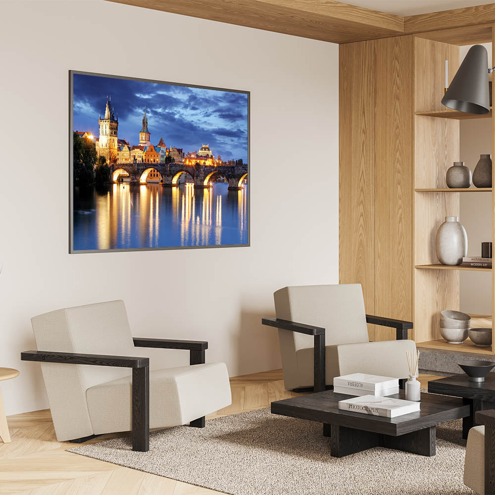 Introduce an element of historical elegance to your space with our Prague Landmark Art, featuring the iconic Charles Bridge at night. This stunning piece captures the serene beauty of Prague's cityscape, highlighted by ambient lighting and architectural grandeur.