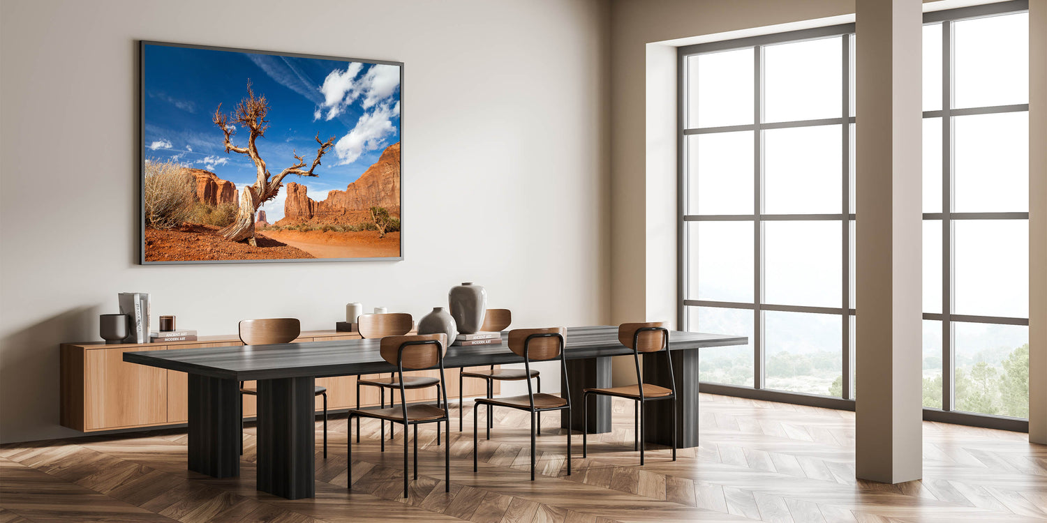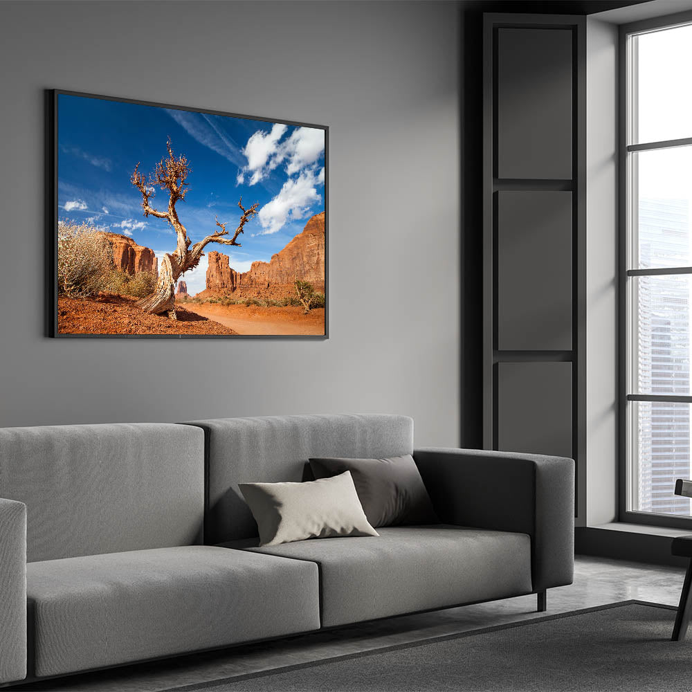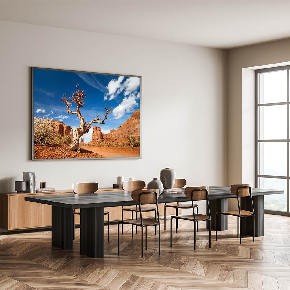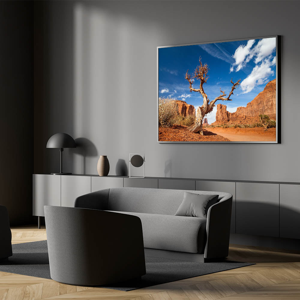 Capture the raw beauty of the desert with this stunning Death Valley wall art. Featuring an iconic twisted tree standing resilient against the vast desert landscape, this piece of photography art highlights the timeless beauty and stark contrasts of Death Valley National Park. The rugged mountains and clear blue sky provide a dramatic backdrop, making this artwork a captivating addition to any space.