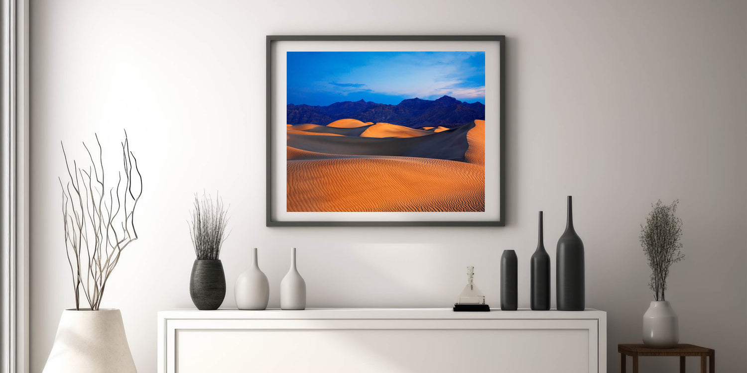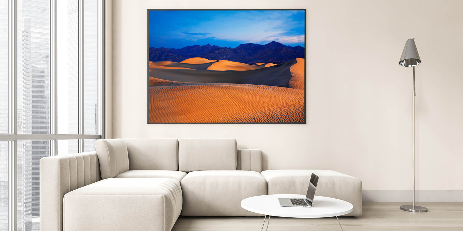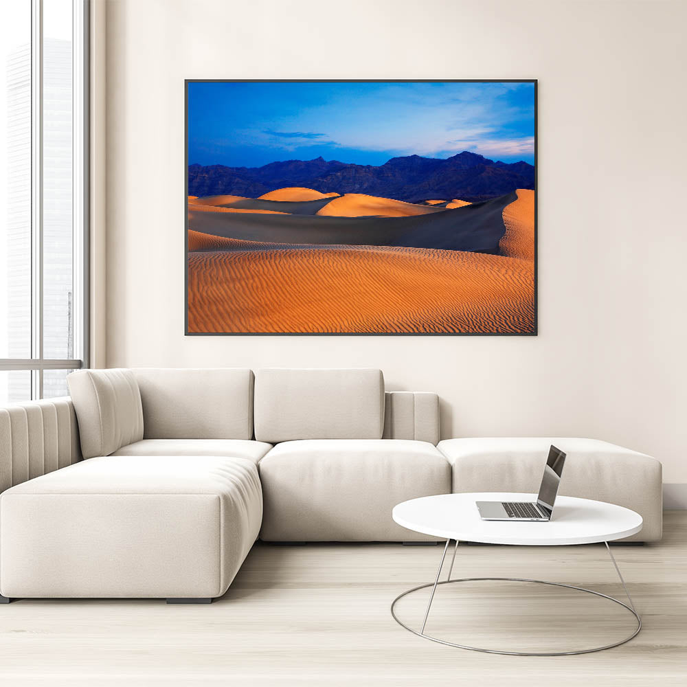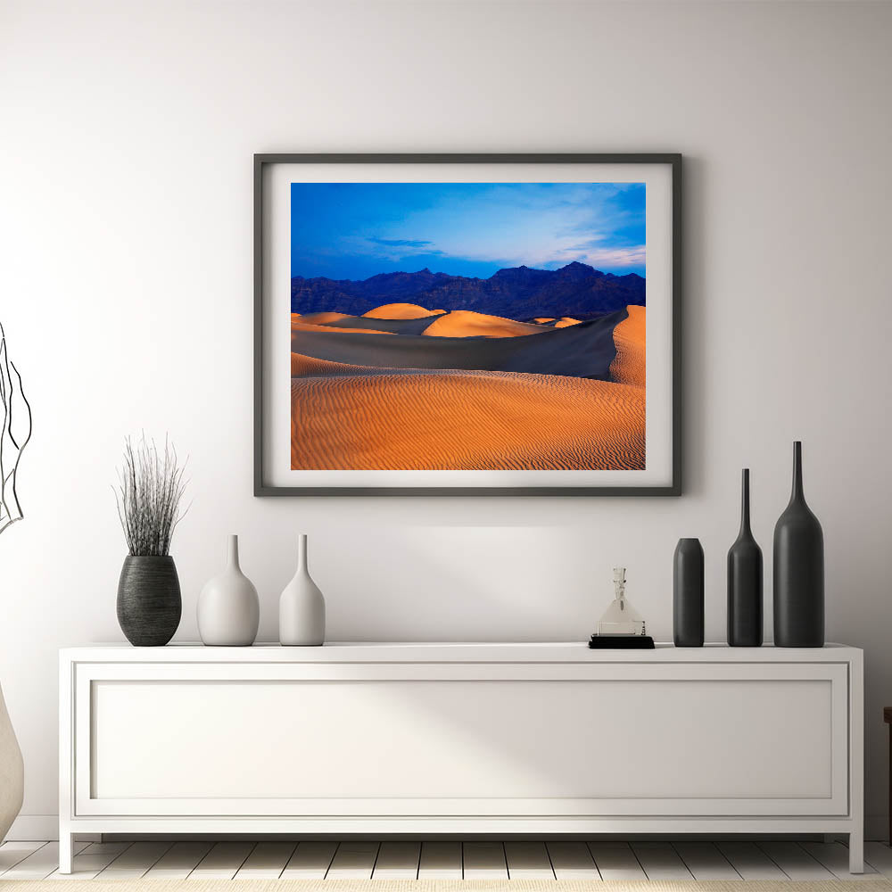 Immerse yourself in the captivating beauty of Death Valley's golden dunes at dusk with this stunning landscape wall art. The rippling sands and dramatic light create a mesmerizing contrast against the deep blue sky and rugged mountain backdrop, evoking a sense of serenity and timelessness. This exquisite photography art captures the peaceful yet powerful essence of Death Valley’s iconic desert terrain.
