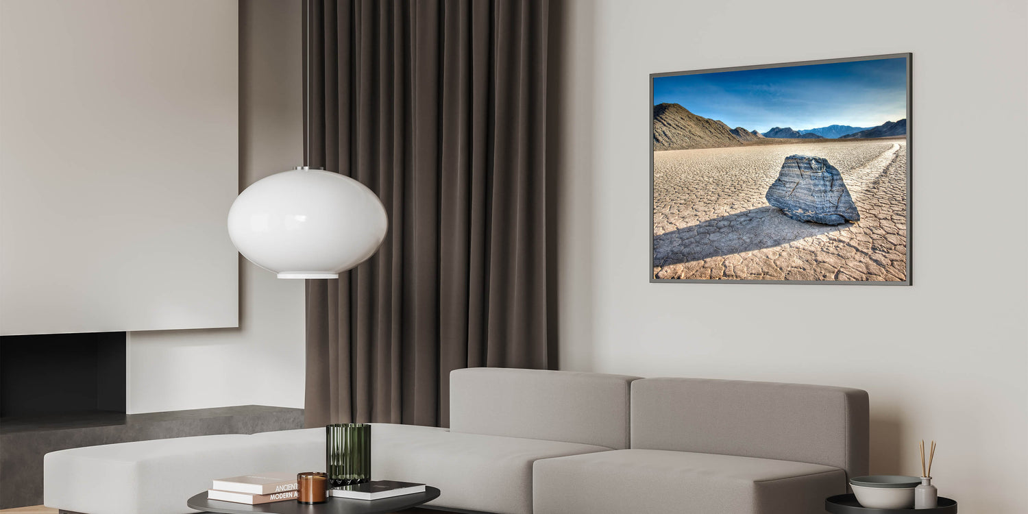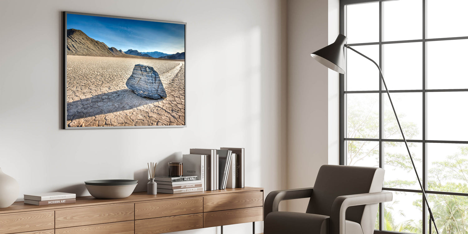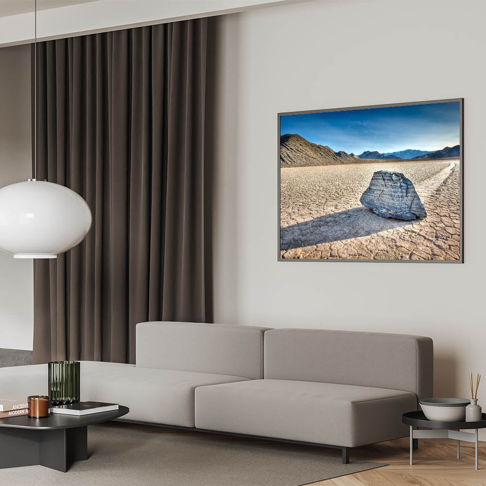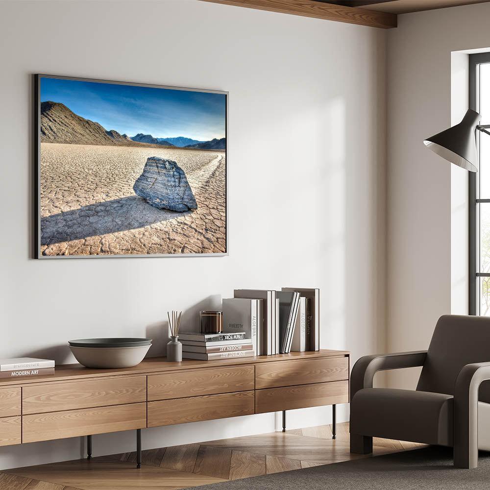 Bring the rugged beauty of Death Valley into your home with this stunning wall art. Featuring a breathtaking view of a moving rock formation in the expansive desert landscape of Death Valley National Park, this artwork captures the raw essence of nature’s power and mystery. Perfect for adding a touch of the desert’s serenity to any space, this high-quality Death Valley canvas print is available in a variety of formats including stretched canvas, framed acrylic glass, and more.