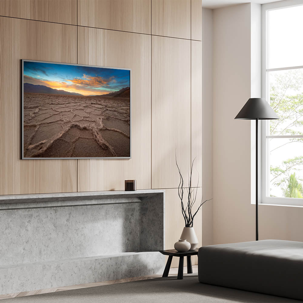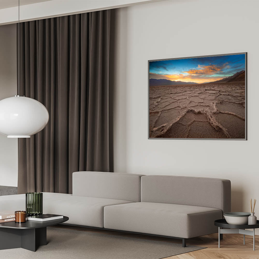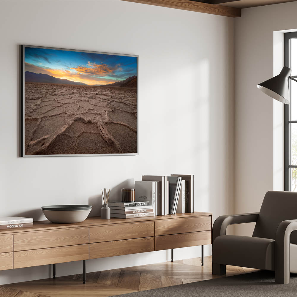 Witness the captivating beauty of Death Valley’s salt flats at sunset with this stunning landscape wall art. The unique patterns of the salt-encrusted ground stretch into the horizon, bathed in the warm glow of a breathtaking sunset. The sky, painted in hues of orange, blue, and pink, contrasts beautifully with the stark, textured landscape, making this piece a perfect addition to any room that seeks to capture the serenity and wonder of nature’s extremes.