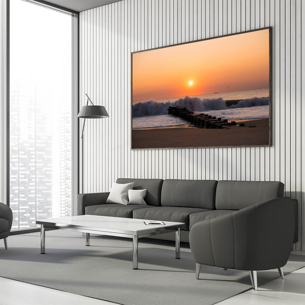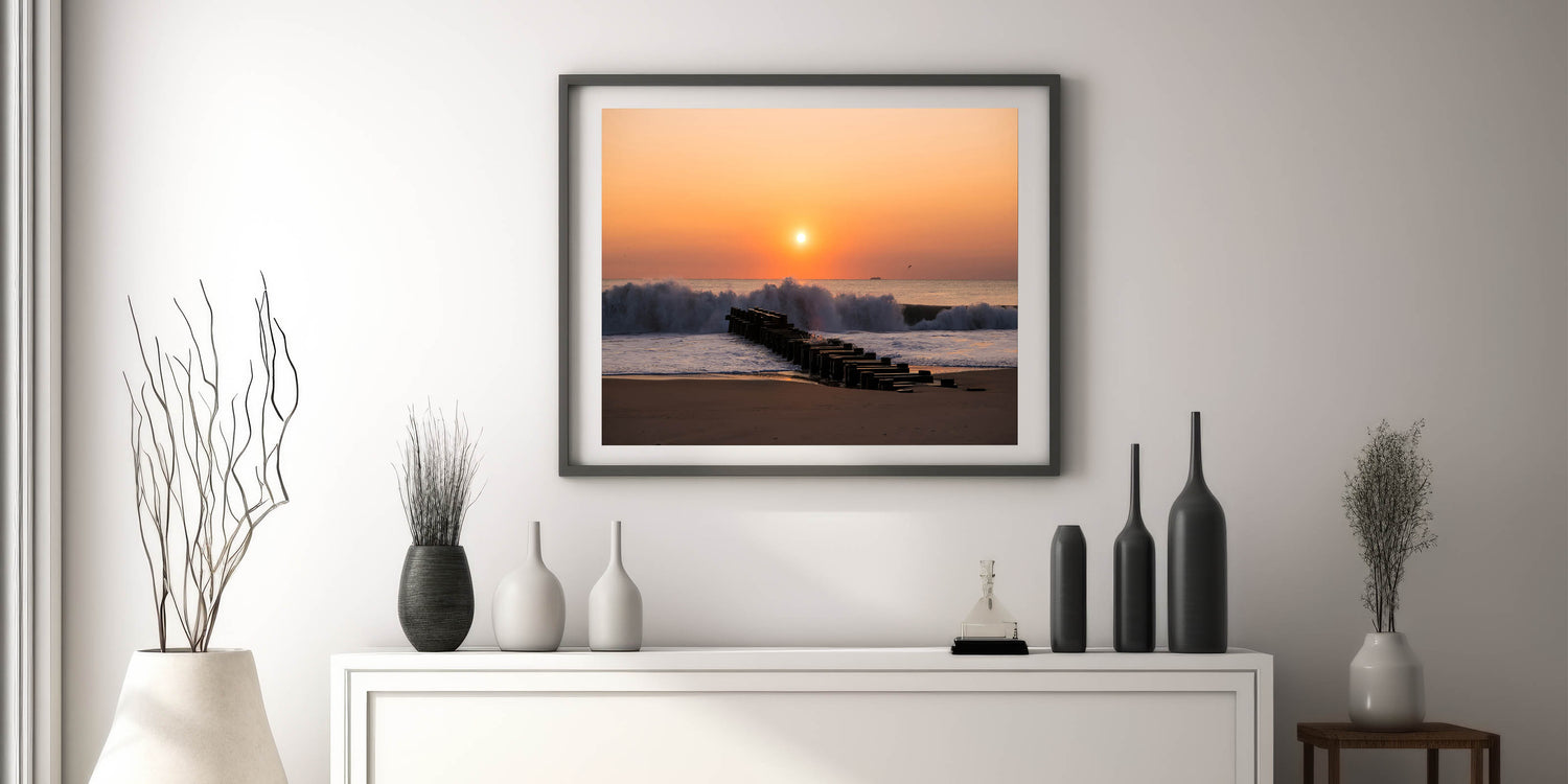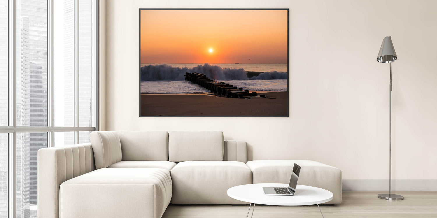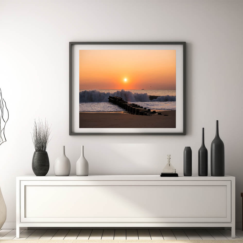 Capture the serenity of Delaware’s coastline with this stunning wall art featuring a sunrise over the crashing waves. This Delaware coastal art showcases the beauty of nature at dawn, with warm orange and peach hues blending perfectly into the sky. The powerful waves crashing against the shore create a dynamic and peaceful contrast, making this piece an ideal choice for fans of Delaware photography and scenic beach art.