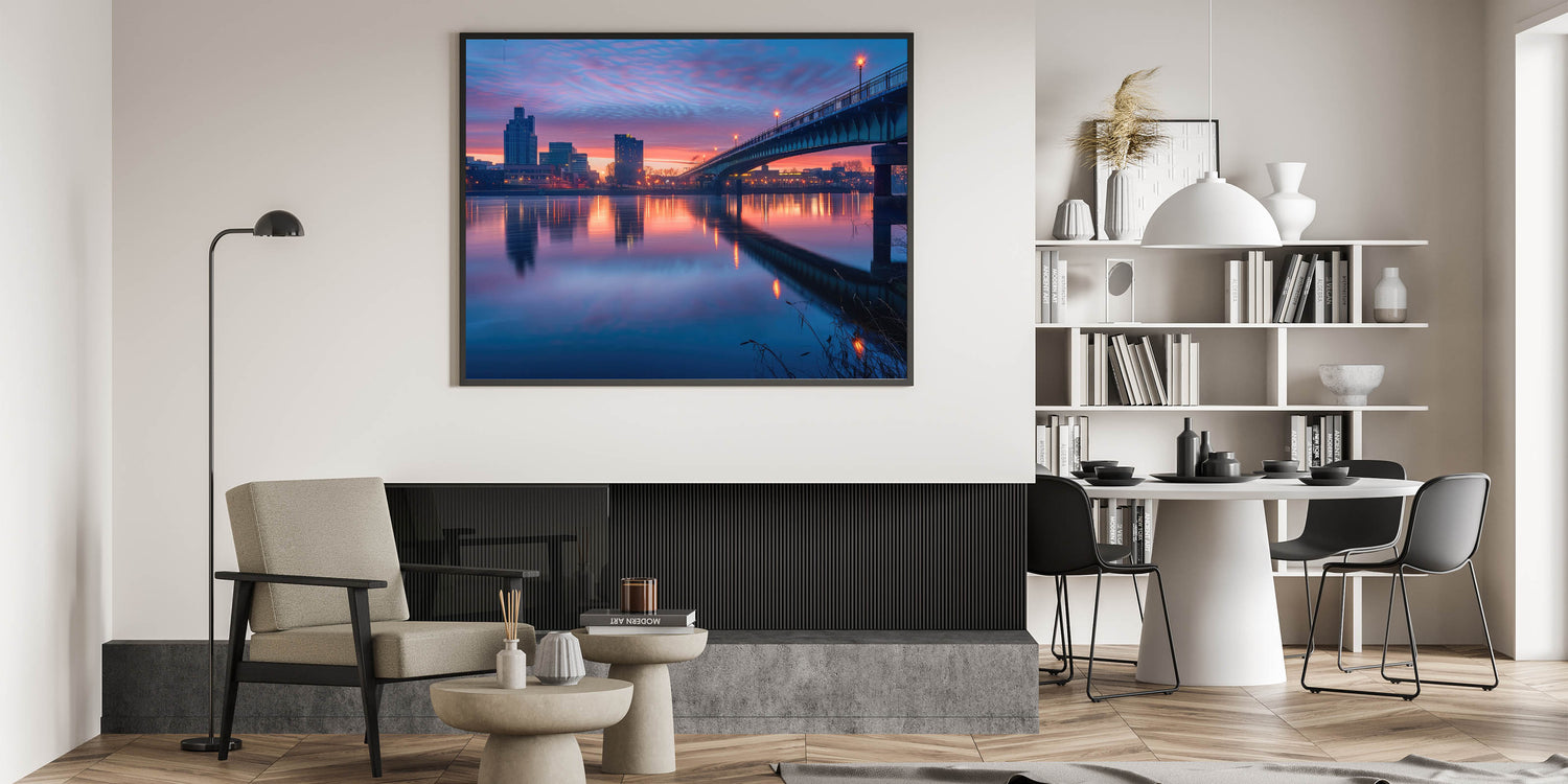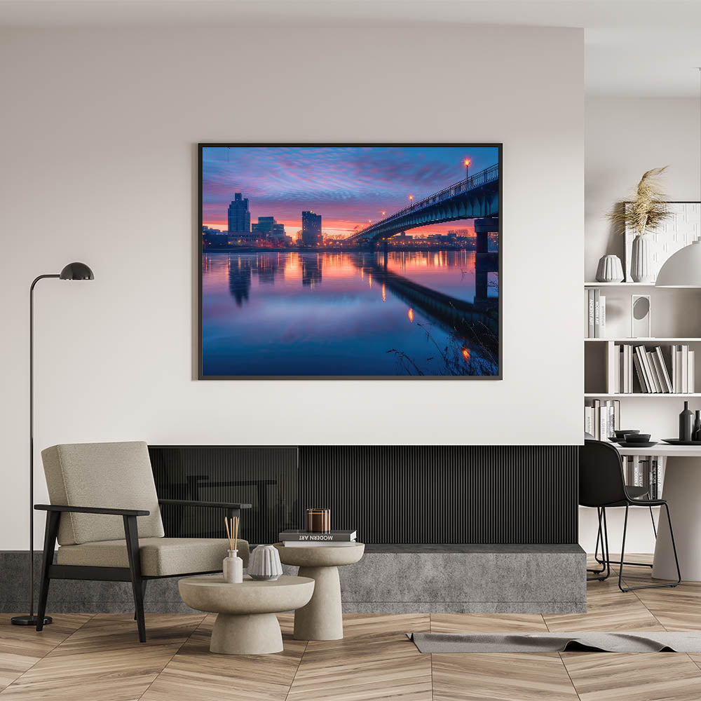 - Delaware cityscape prints featuring a sunset over the skyline and river.