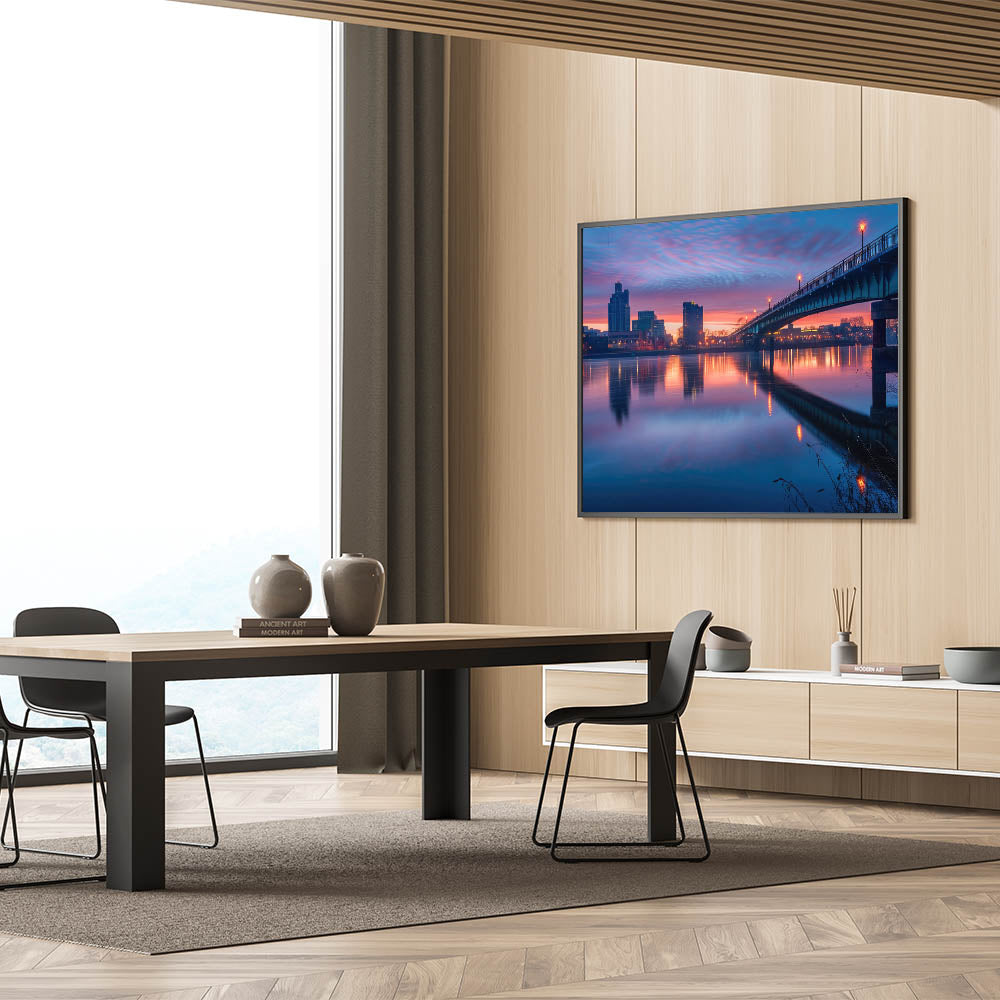 Bring the beauty of Delaware’s vibrant sunsets and urban architecture into your home with this unique cityscape print. Its bold colors and striking reflections make it a captivating centerpiece for any room.