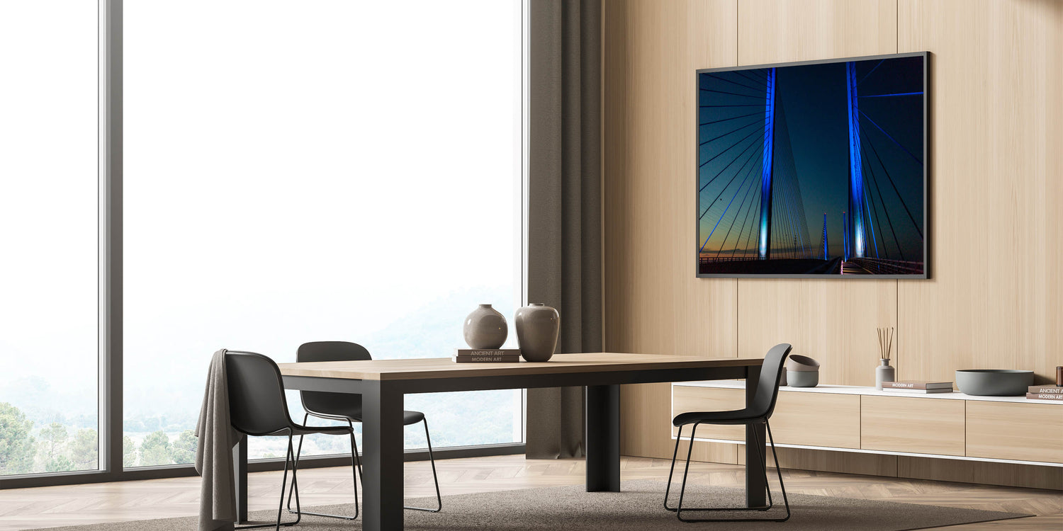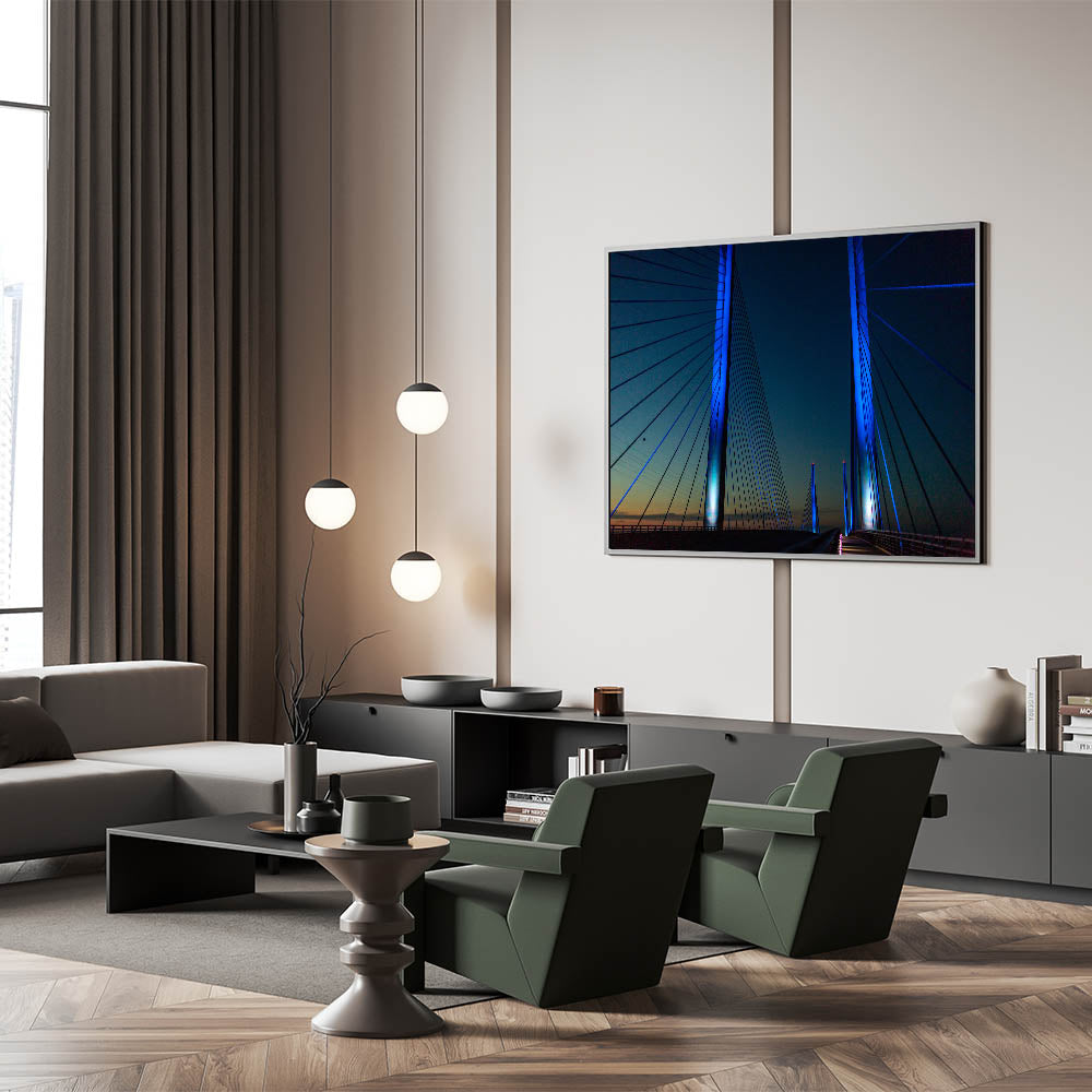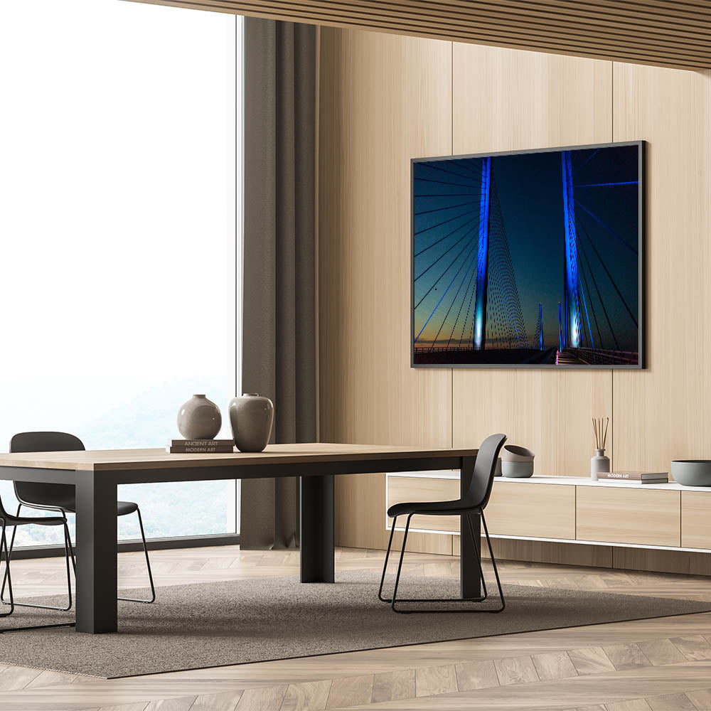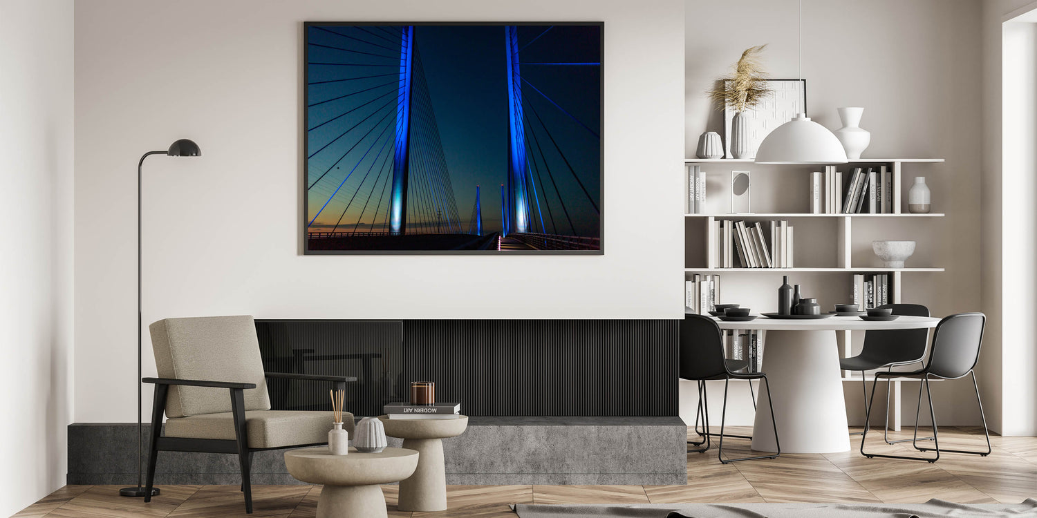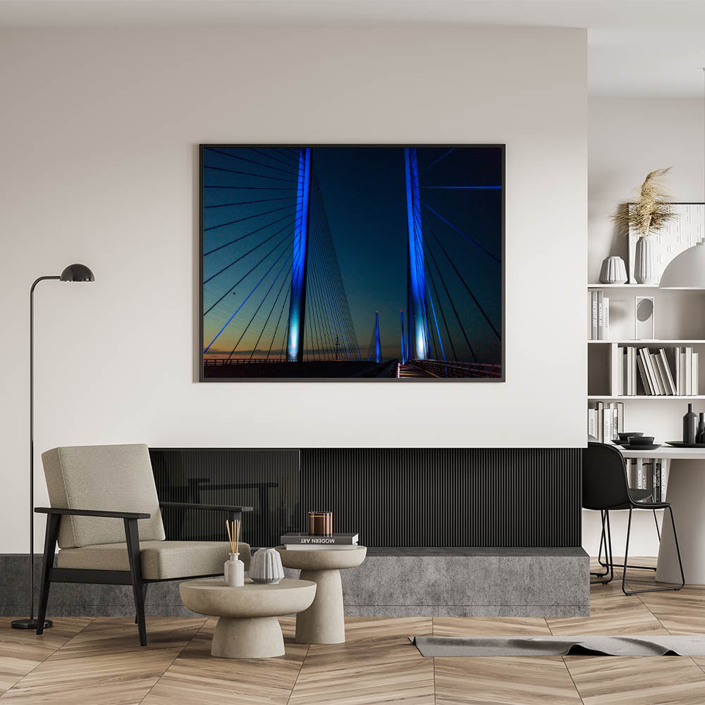 Add a modern, architectural touch to your home decor with this stunning Delaware wall art, featuring an illuminated bridge against the night sky. This striking image highlights the vibrant blue lights of the bridge’s cables, creating a dramatic and contemporary feel. Whether you're seeking Delaware photography art for home decor or a bold statement piece, this artwork showcases the beauty of Delaware’s modern infrastructure.