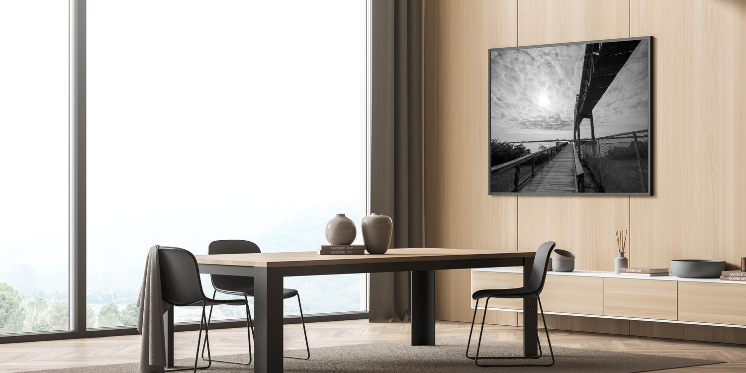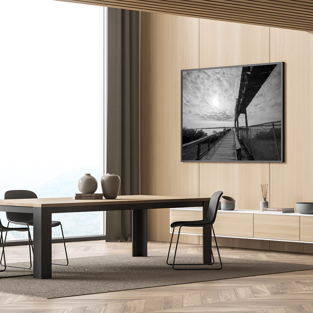 This stunning black and white Delaware wall art captures the timeless beauty of a bridge overlooking a serene waterfront. The contrast between the wooden path and the expansive sky creates a striking visual experience, making it an excellent choice for fans of Delaware nature photography. Whether you’re looking for a minimalist touch or a bold architectural scene, this Delaware landscape canvas brings an element of sophistication to any room.