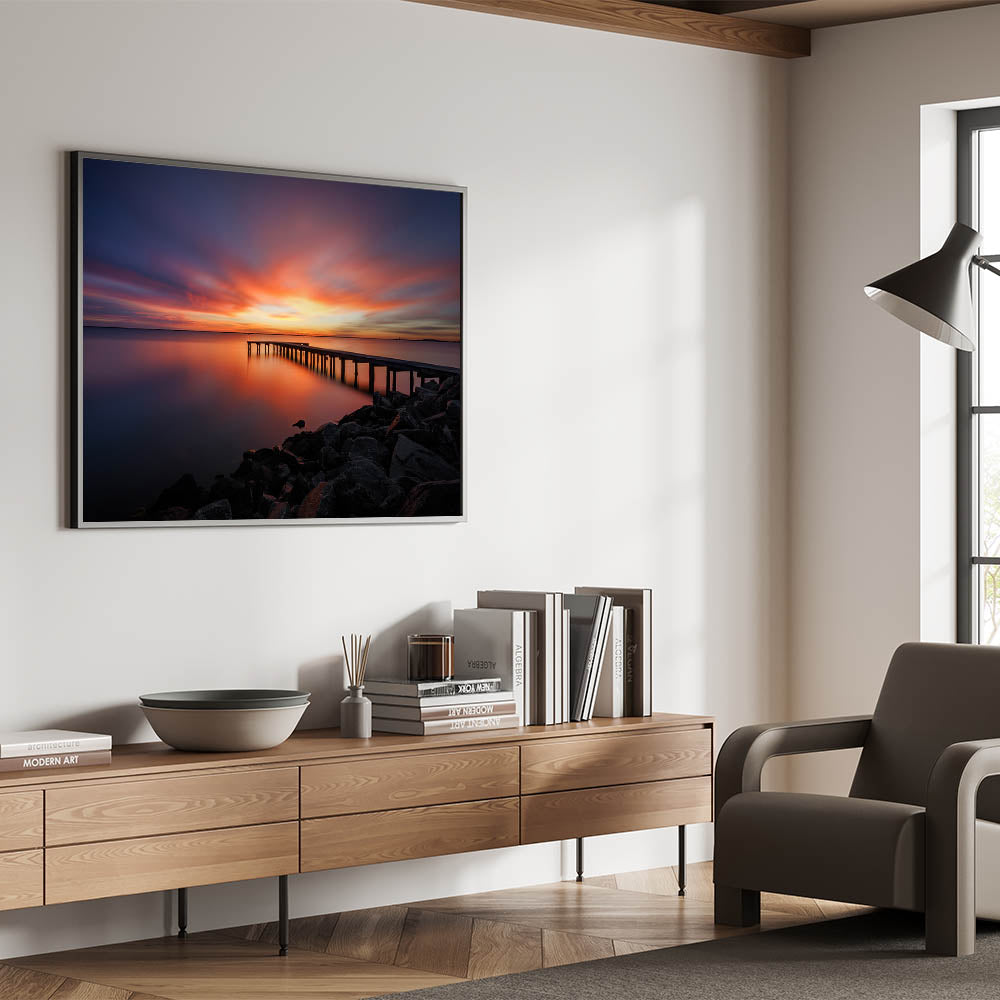 Bring the beauty of Delaware’s serene coastline into your home with this breathtaking wall art, featuring a vibrant sunset over calm waters and a peaceful pier. The rich hues of orange, pink, and purple blend together in the sky, creating a mesmerizing backdrop for the stillness of the water. This Delaware coastal art is perfect for those who love tranquil beach scenes and want to incorporate the natural beauty of Delaware into their home decor.
