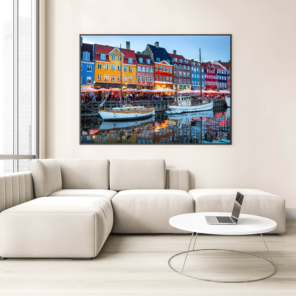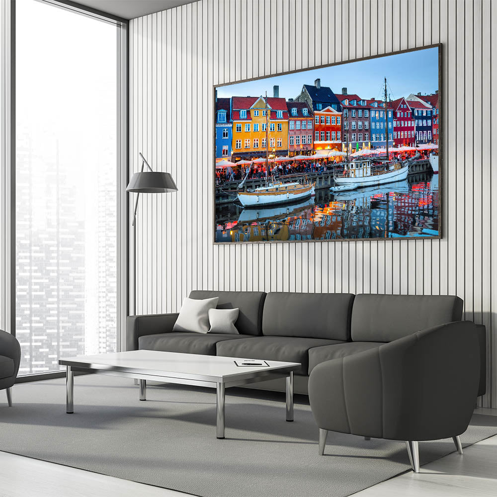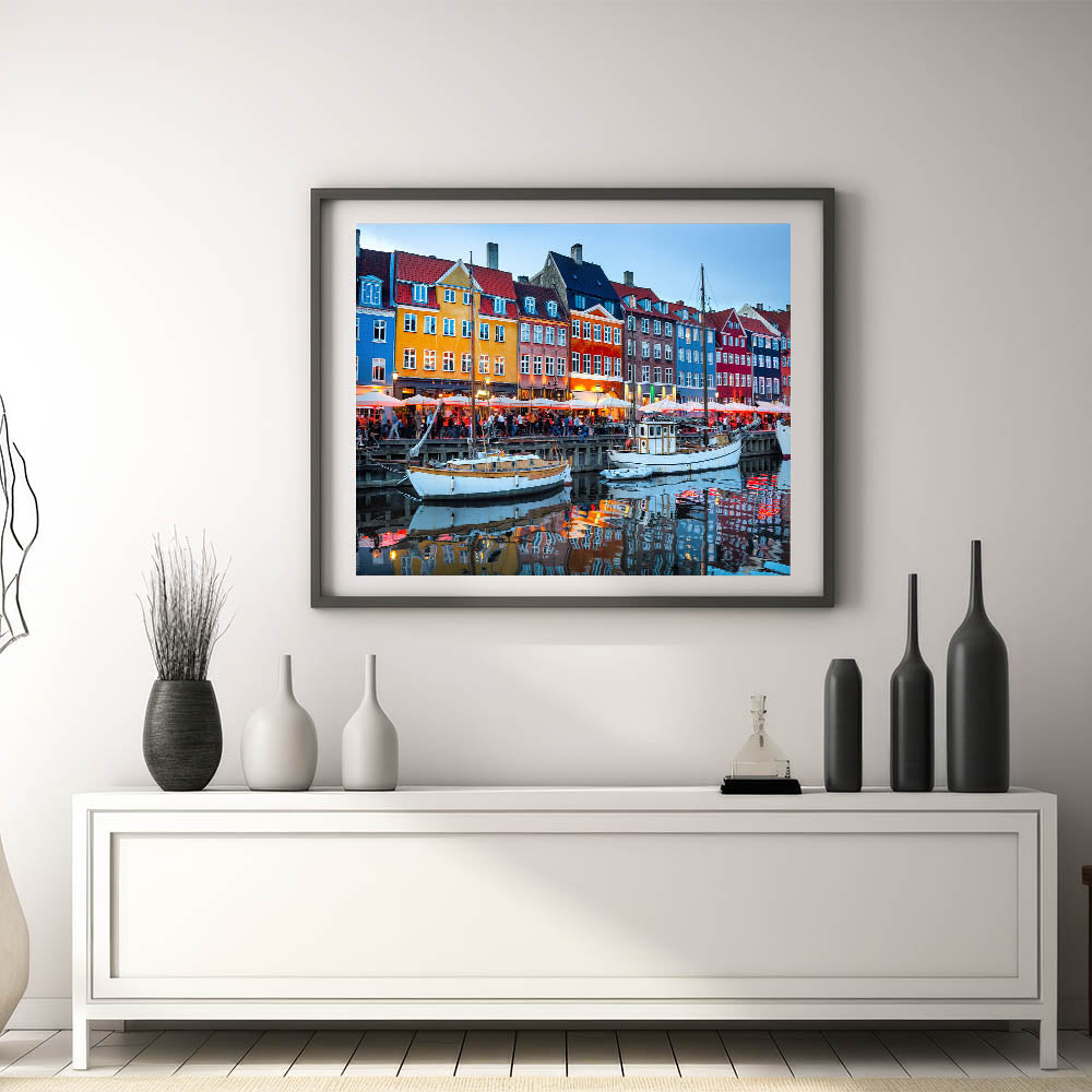 Capture the lively energy of Copenhagen's iconic Nyhavn harbor during the evening with this stunning Danish art print. The colorful townhouses and bright lights reflected on the calm water create a captivating atmosphere that beautifully showcases the charm of one of Denmark’s most famous spots. This artwork brings the vibrancy of Scandinavian decor into any home or office, making it a perfect centerpiece.