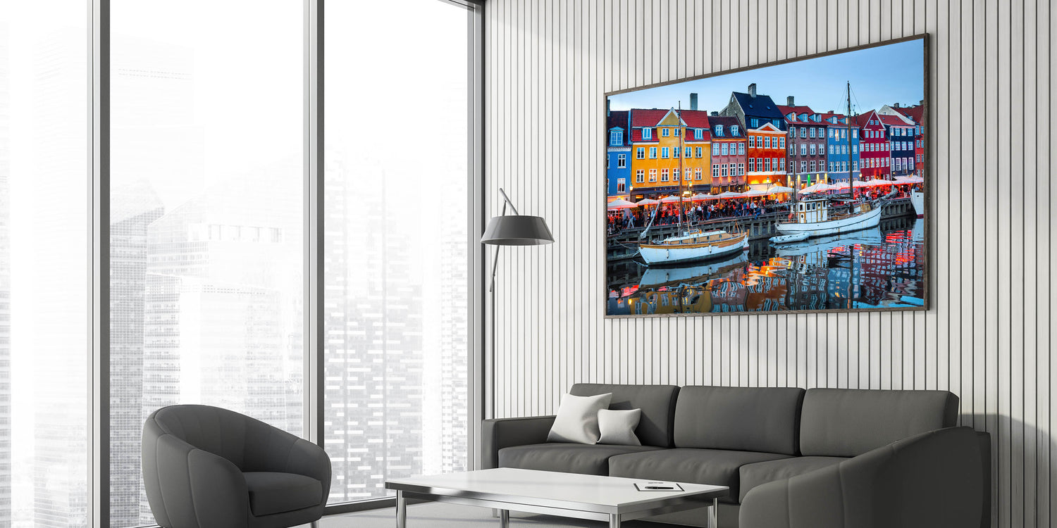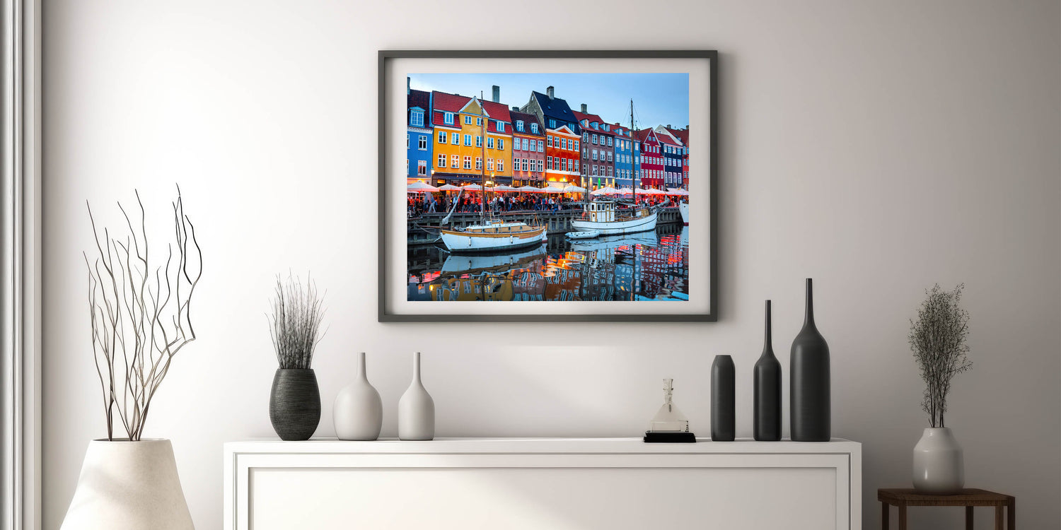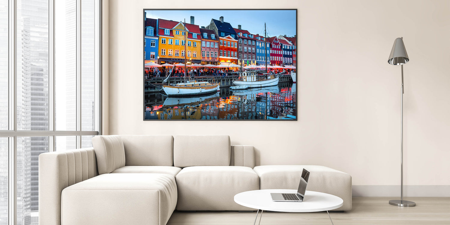 Capture the lively energy of Copenhagen's iconic Nyhavn harbor during the evening with this stunning Danish art print. The colorful townhouses and bright lights reflected on the calm water create a captivating atmosphere that beautifully showcases the charm of one of Denmark’s most famous spots. This artwork brings the vibrancy of Scandinavian decor into any home or office, making it a perfect centerpiece.
