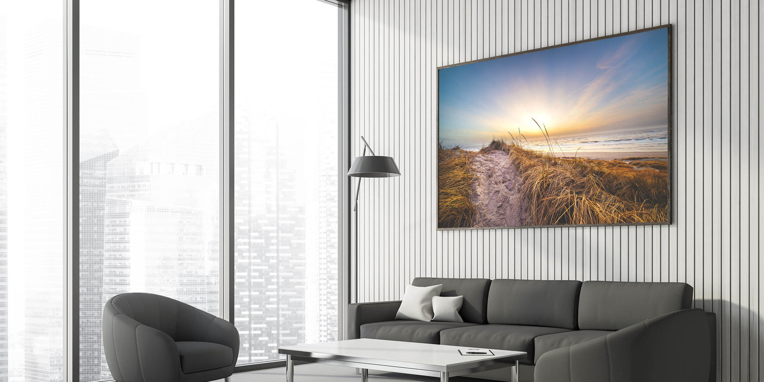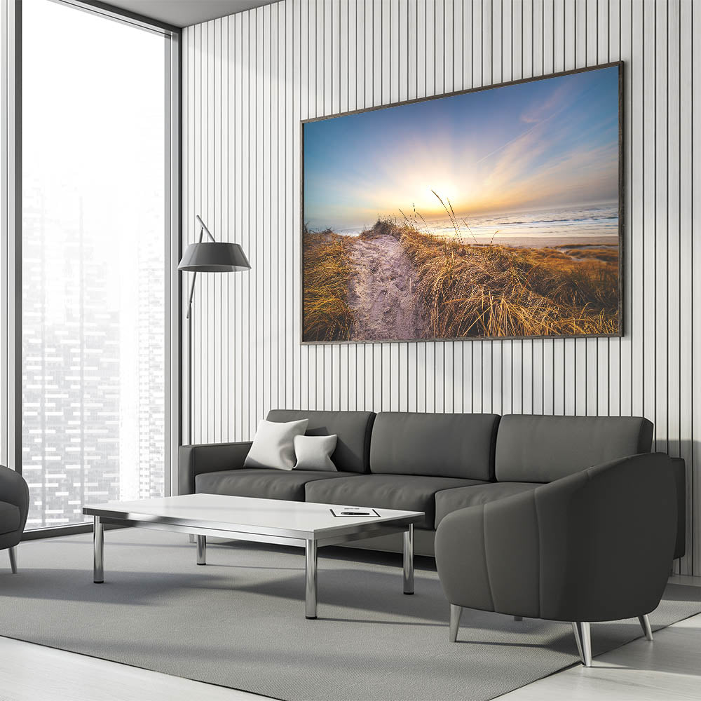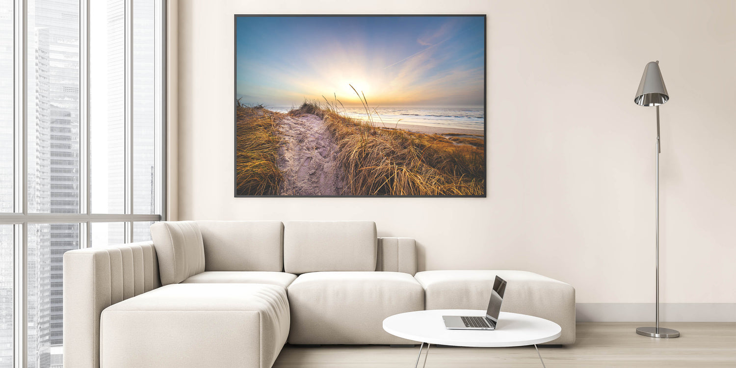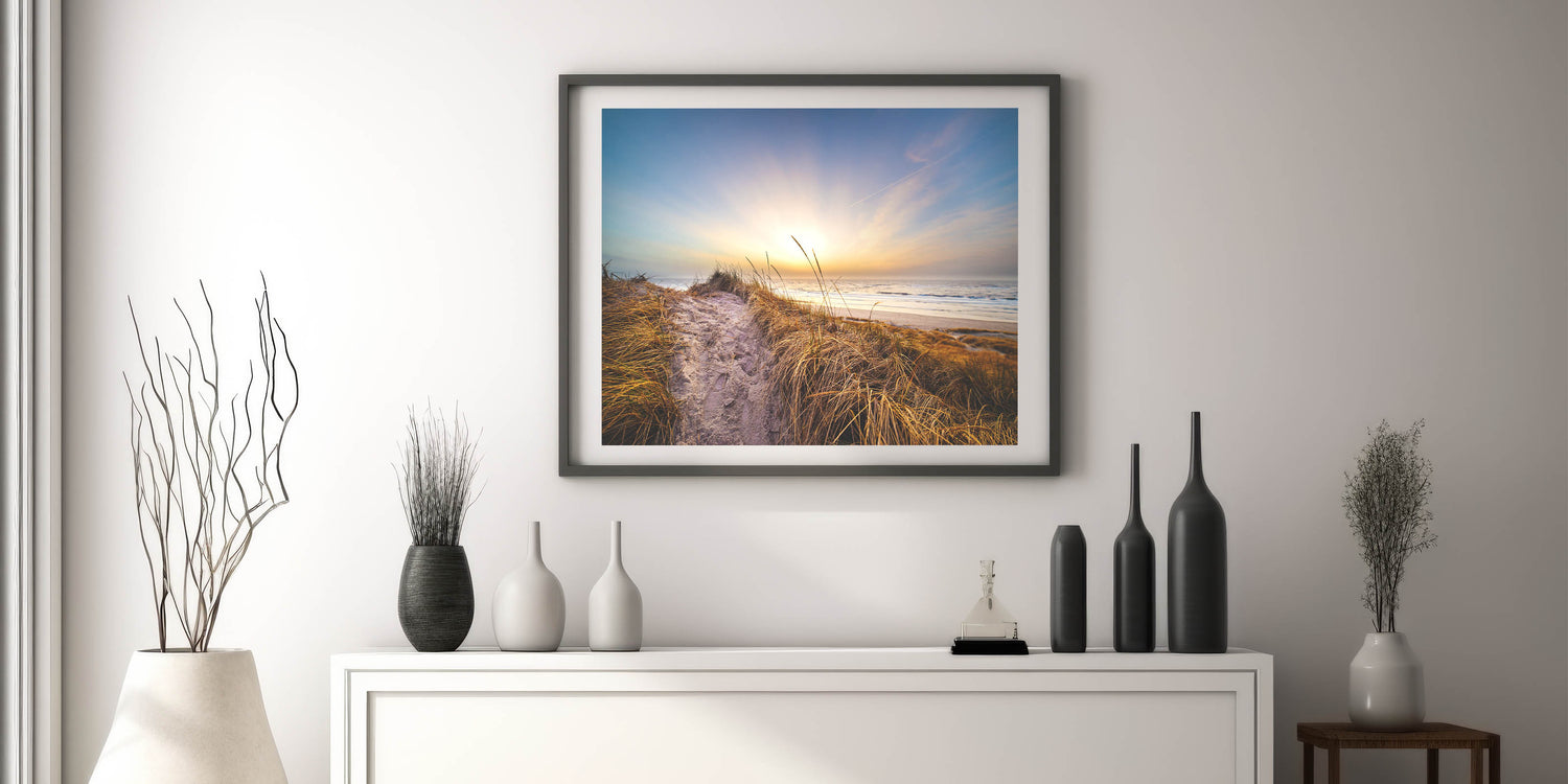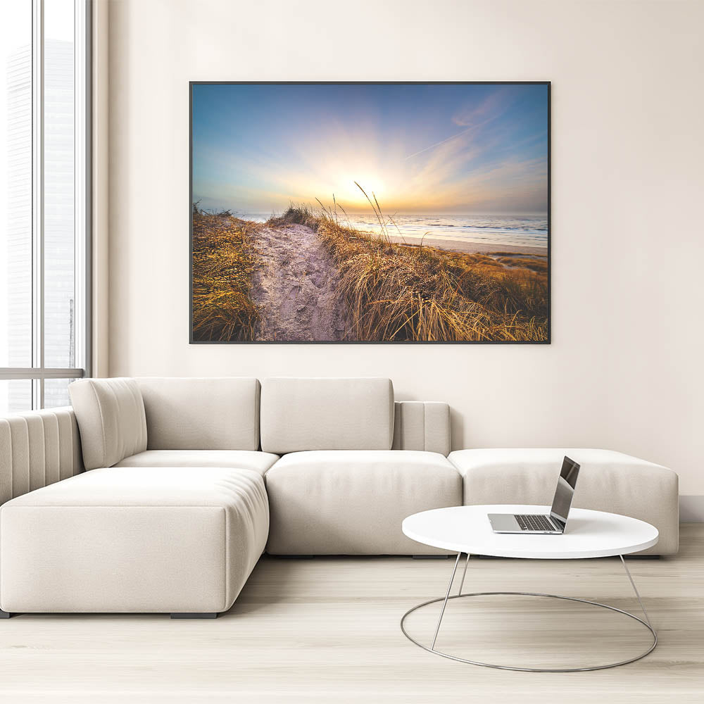 Embrace the tranquil beauty of Denmark's coastline with this breathtaking Danish art print. Featuring a serene coastal path leading to the beach, this artwork captures the peaceful essence of a Nordic sunset. The soft golden light and warm tones make this piece a perfect addition to any space seeking a calming, nature-inspired atmosphere. Whether you're a fan of Scandinavian decor or Denmark photography, this coastal print brings the quiet beauty of the Danish shore into your home.