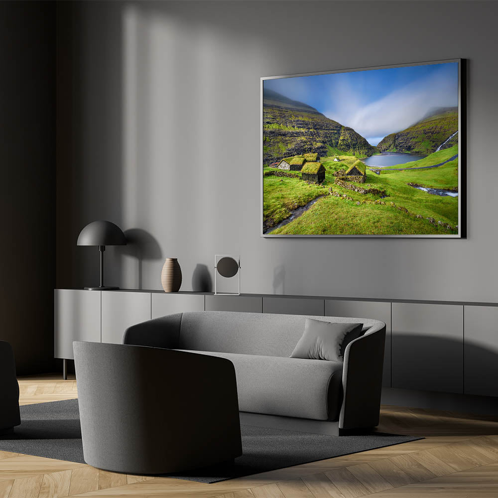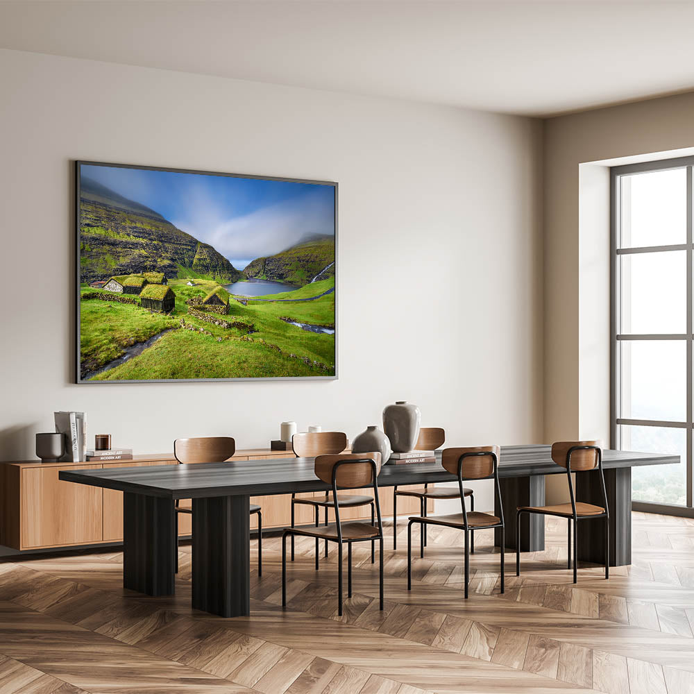 Immerse yourself in the breathtaking beauty of the Danish countryside with this stunning piece of Danish landscape painting. This landscape captures the essence of rural Denmark, featuring traditional grass-roofed houses nestled between rolling hills and tranquil waters. The vivid greens and blues evoke the peaceful serenity of Scandinavian nature, making this artwork a perfect addition to any home seeking to incorporate a touch of Nordic wall decor.