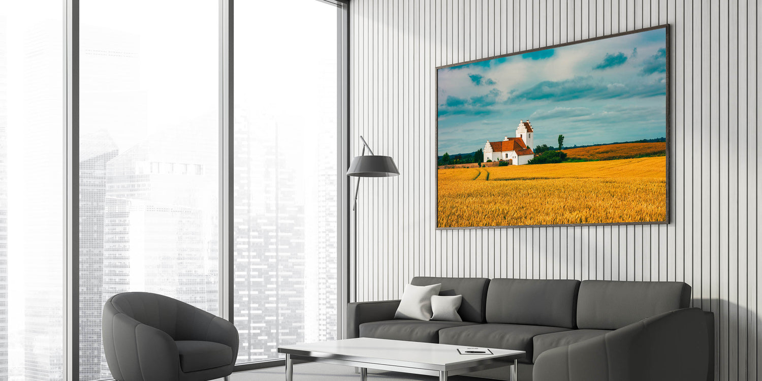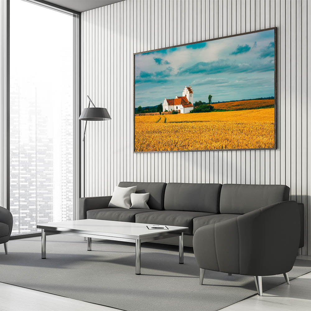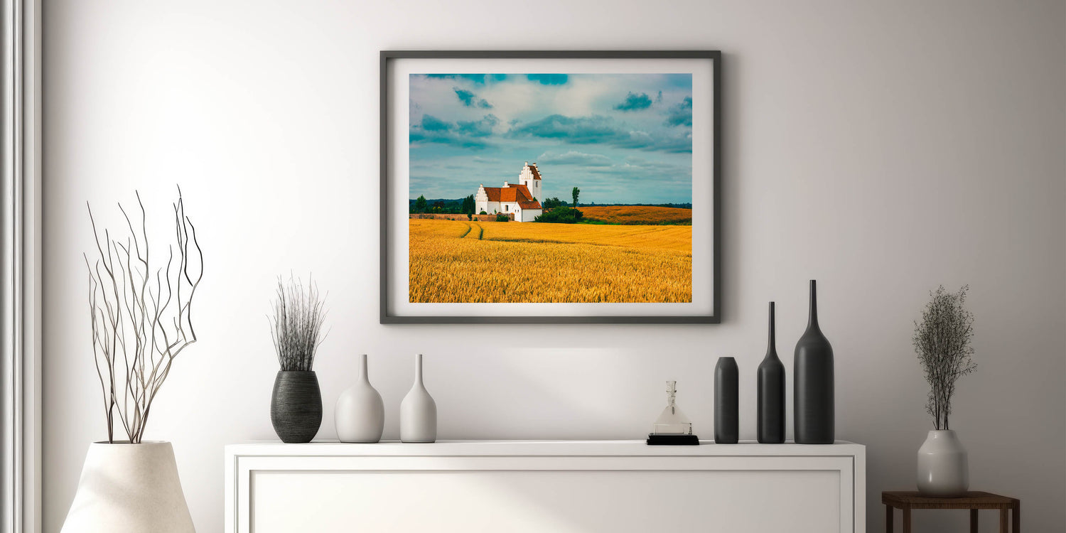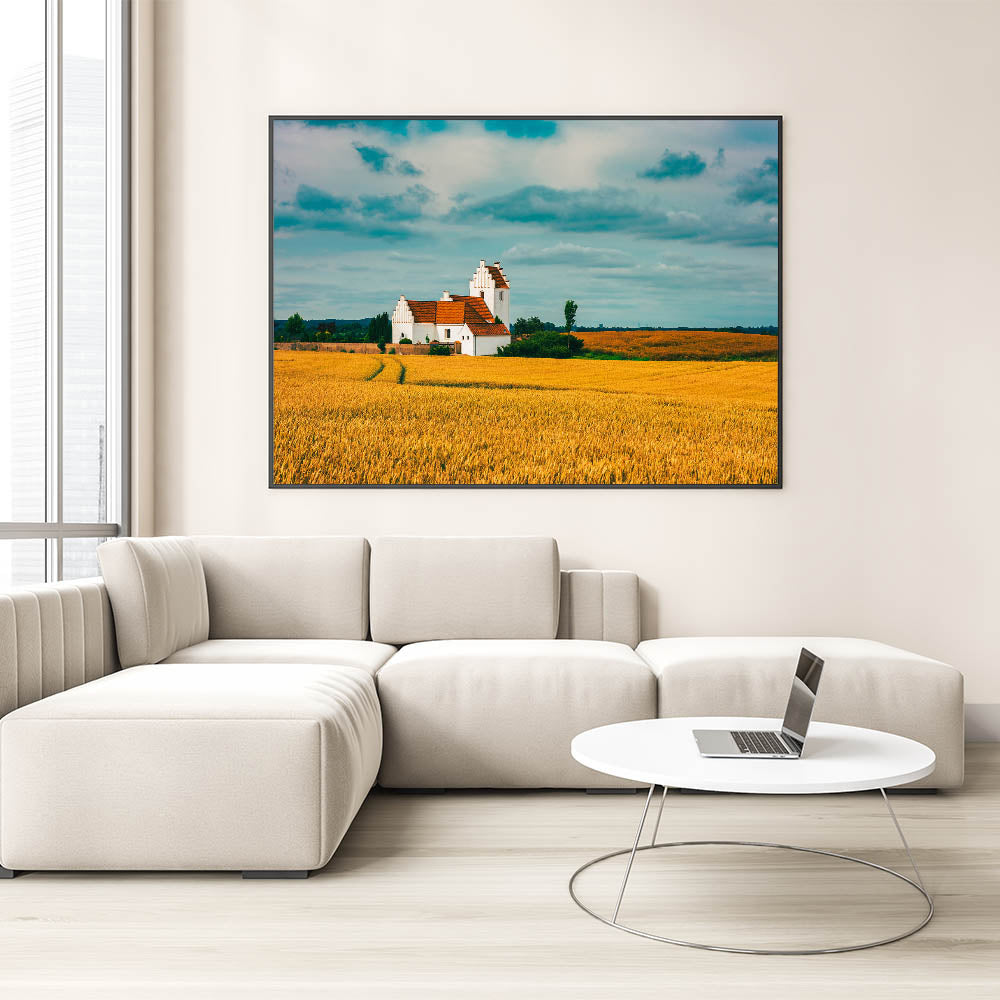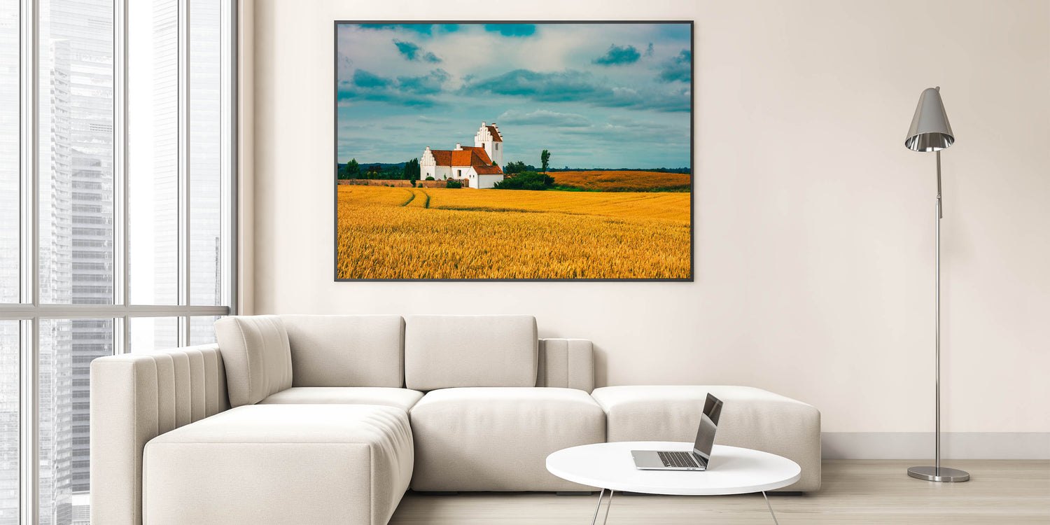 • Scenic Denmark artwork featuring a traditional Danish church in golden fields