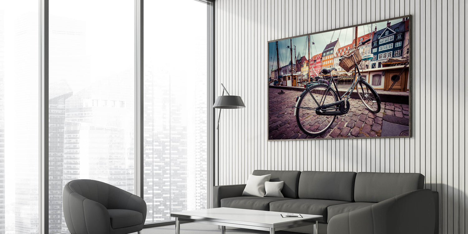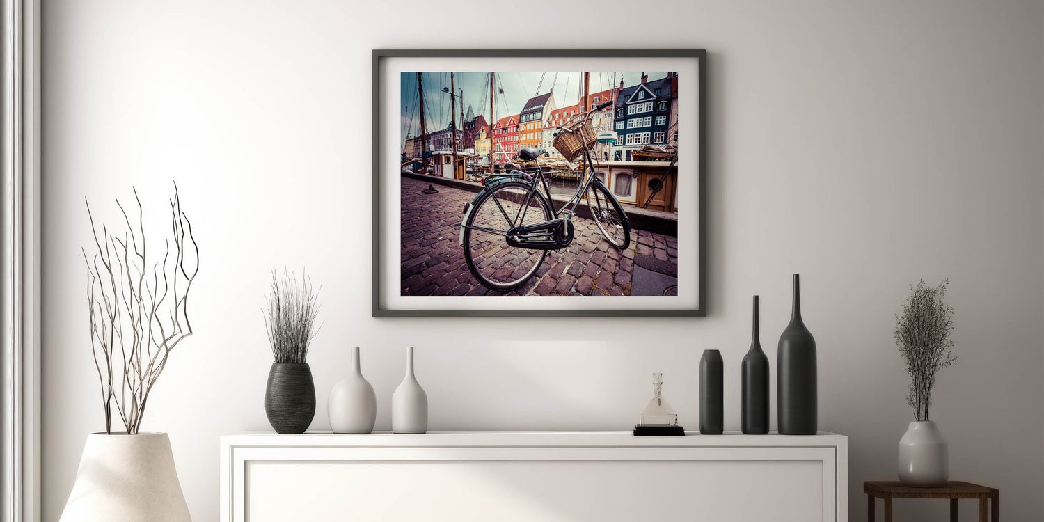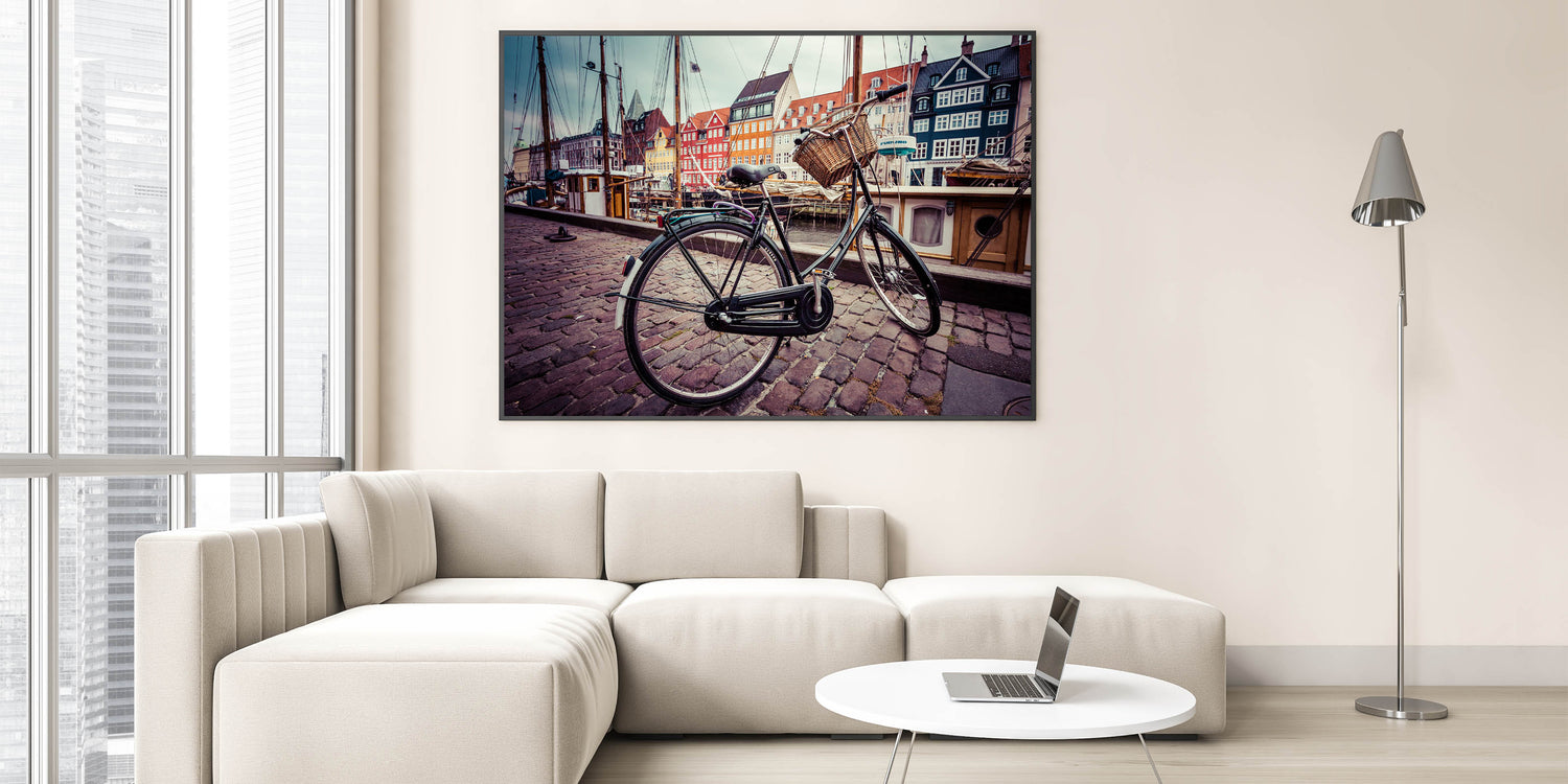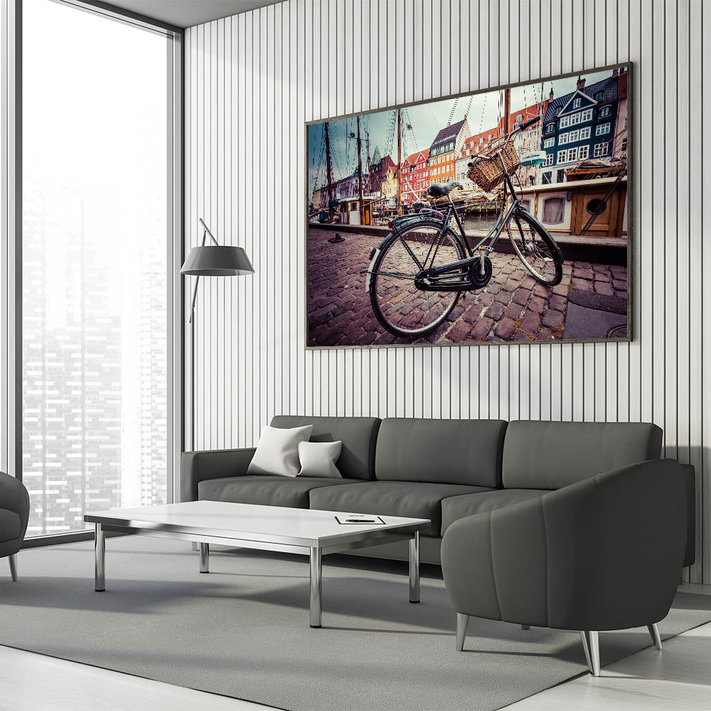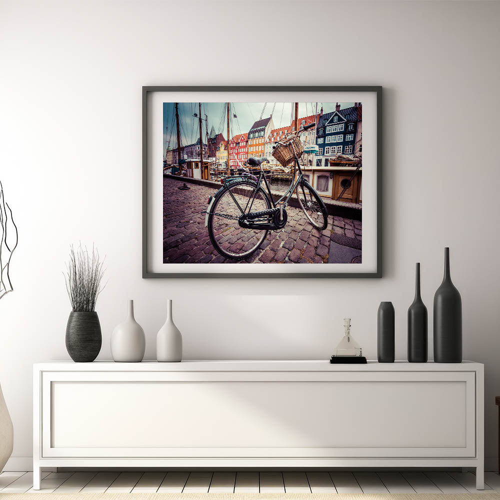 Bring the charm of Copenhagen into your space with this stunning Denmark wall art. Featuring a classic bicycle in the forefront, set against the vibrant, colorful backdrop of Copenhagen's iconic Nyhavn harbor, this piece beautifully captures the essence of Danish lifestyle and architecture. Perfect for adding a touch of Scandinavian decor to any room, this design evokes the serene atmosphere of Denmark's most famous cityscape.