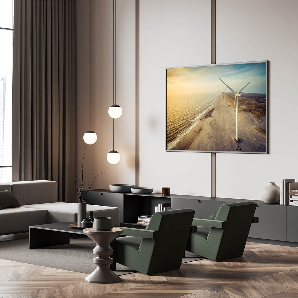This striking Denmark wall art showcases a peaceful coastal scene with majestic wind turbines lining the shore. The soft, golden hues of the sunset blend with the coastal landscape, making this piece a perfect fit for Scandinavian decor. The powerful yet serene imagery of wind turbines represents Denmark’s commitment to sustainability, bringing a sense of calm and environmental beauty into your home.