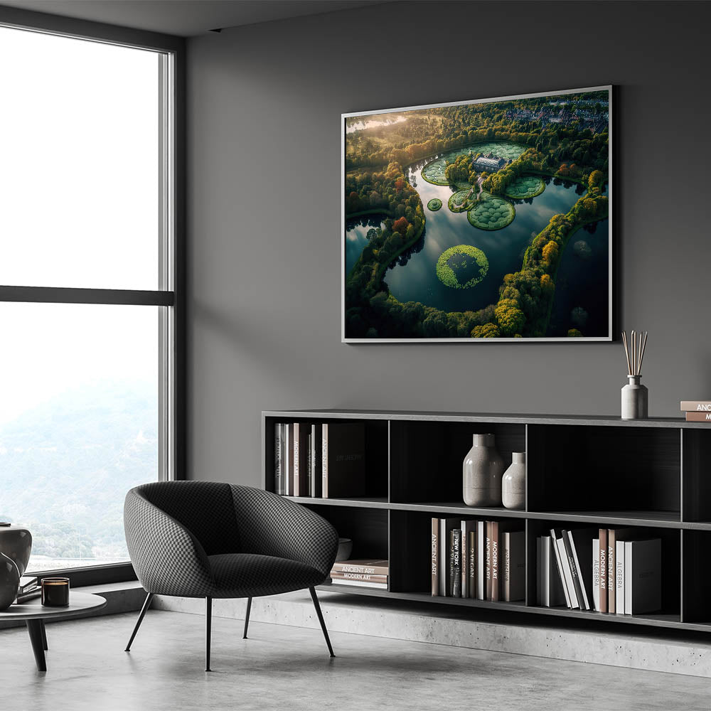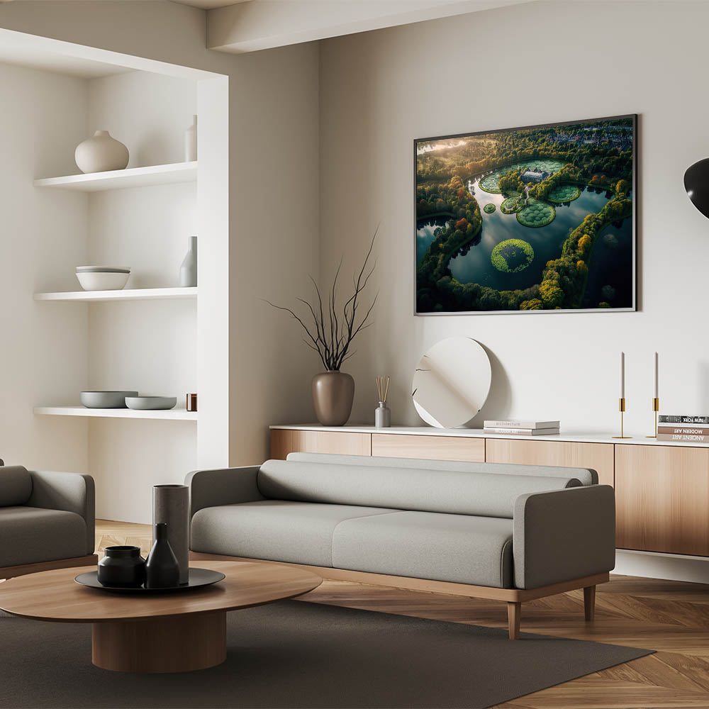 Experience the beauty of Denmark with this breathtaking aerial wall art showcasing a serene lake and intricate gardens. Captured from above, this scenic Denmark artwork highlights the peaceful harmony between nature and landscape design, offering a glimpse of the country’s scenic countryside. Perfect for those who appreciate Nordic wall decor, this piece reflects the timeless elegance of Scandinavian aesthetics.